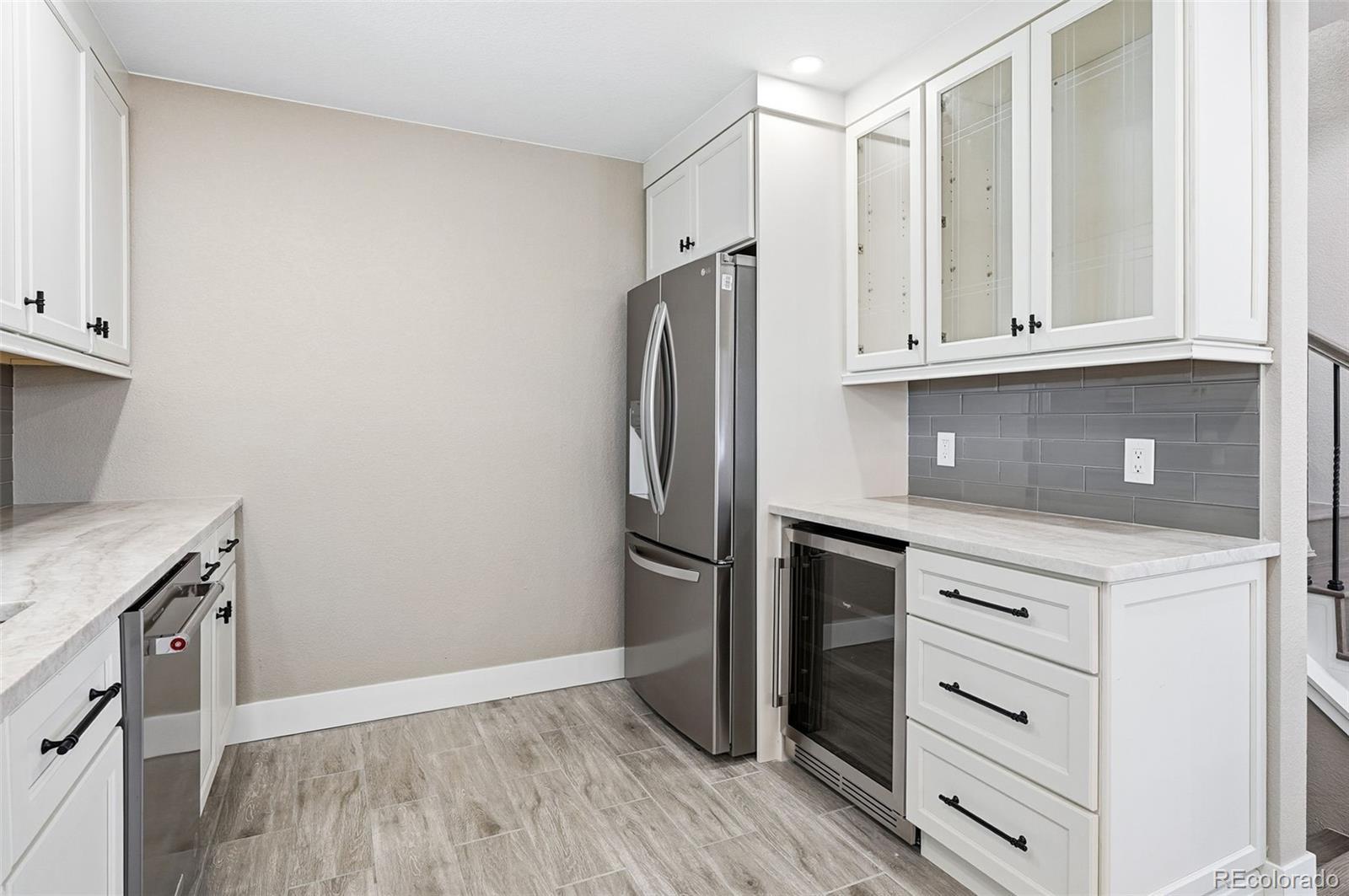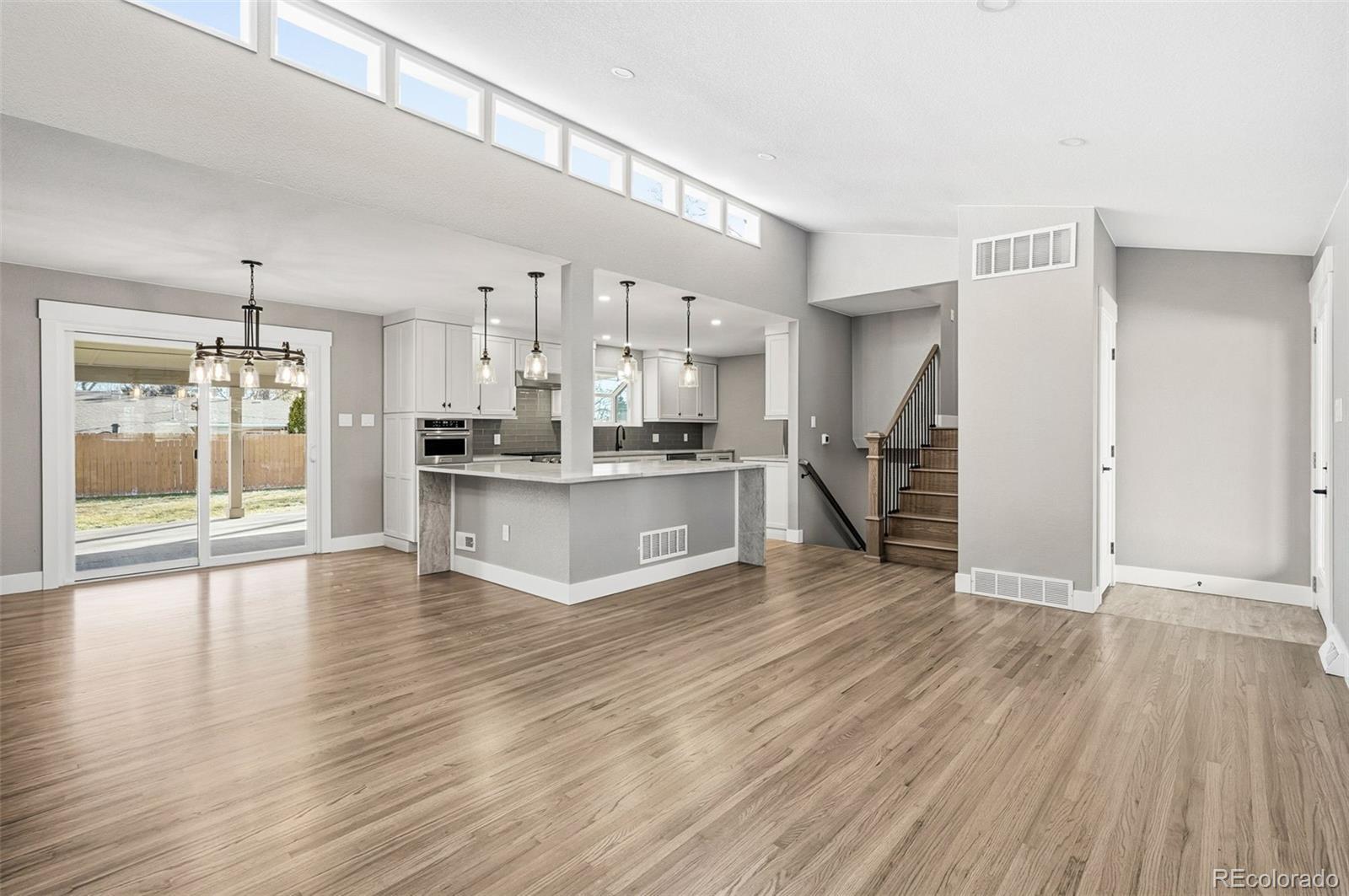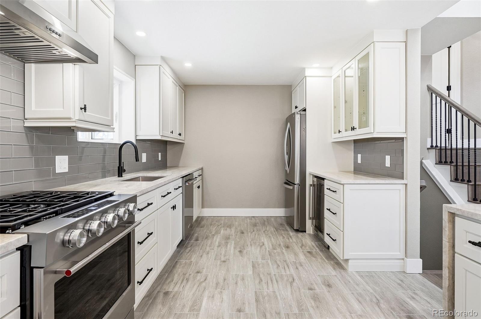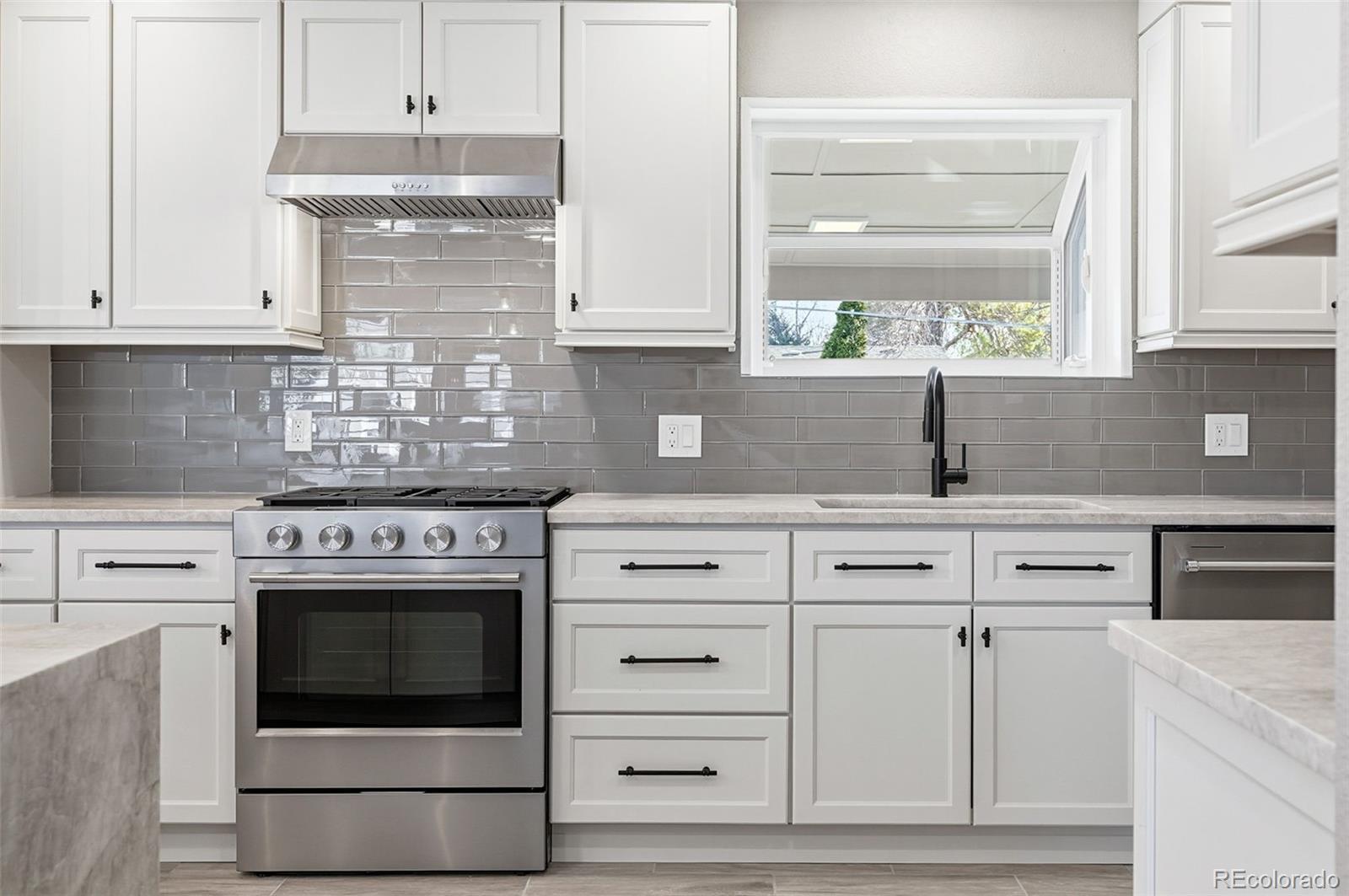 Exquisitely renovated 4-bedroom, 3-bath mid-century gem in a premium Arvada West location. This home has been completely rebuilt from the top of the roof to the sewer line—no detail overlooked. The upper level features a spacious primary suite with walk-in closet and spa-inspired five-piece bath, including soaking tub and custom shower. The main level offers a bright, open great room with soaring ceilings, abundant natural light, and refinished real hardwood floors flowing into the dining area and oversized, brand-new kitchen. The kitchen showcases floor-to-ceiling shaker cabinetry, waterfall granite island, full tile backsplash, KitchenAid appliance package, gas range, built-in microwave, under-counter beverage cooler, and French-door refrigerator. A few steps down from the living area are two secondary bedrooms and a full bath with tile flooring, updated vanity, and glass-enclosed soaking tub. The lower level includes a large family room with two oversized egress windows (30x42), a fourth bedroom, and a combined bathroom/laundry/utility space. Additional upgrades include new exterior wall and ceiling insulation, new roof, new stucco and exterior paint, new sewer line, updated plumbing and electrical fixtures, new interior doors and trim, and fresh two-tone interior paint throughout. The oversized 542-sq-ft two-car garage is finished with drywall and paint and is complemented by a separate workshop with cabinetry. Situated on a flat, fully usable 8,364-sq-ft lot that is fenced and professionally landscaped. Outdoor features include a covered 30x16 concrete patio, new front porch, and new concrete sidewalk. This is a true turn-key property offering quality, function, and timeless design.