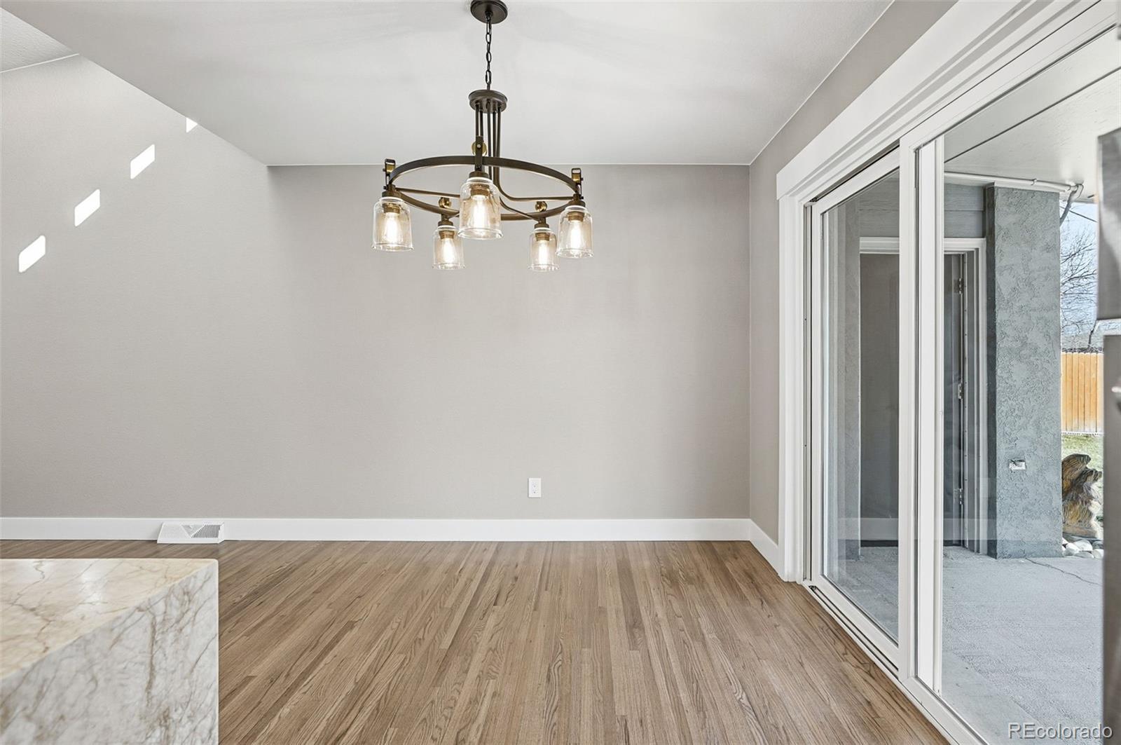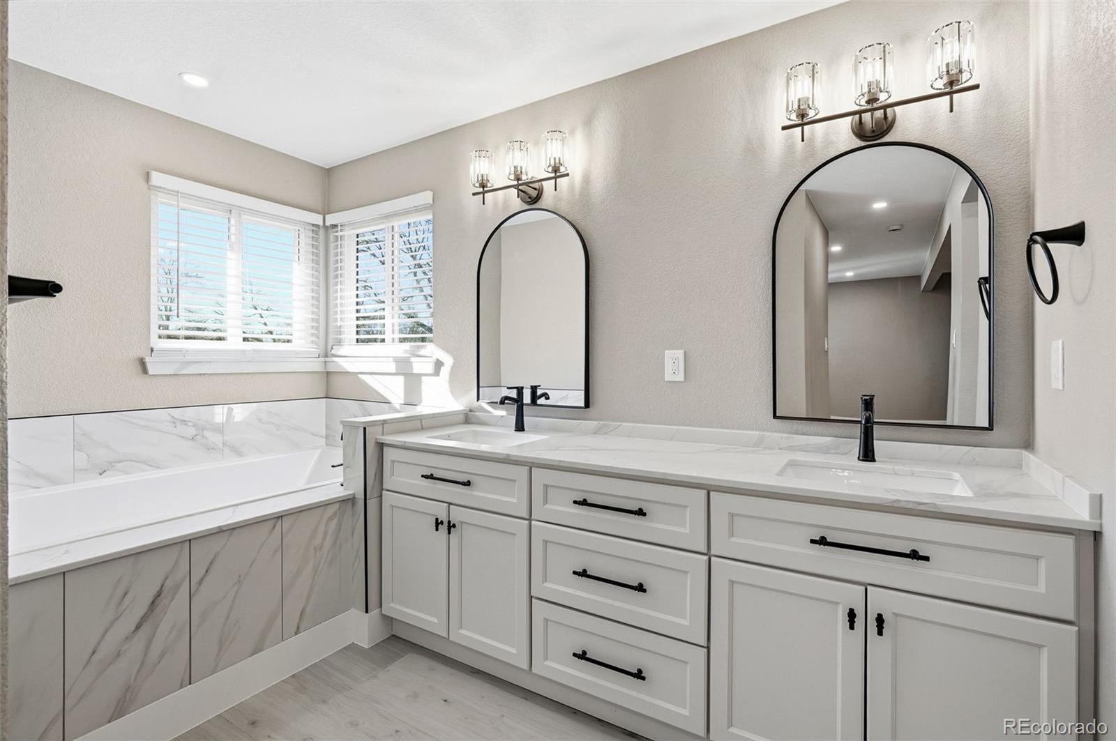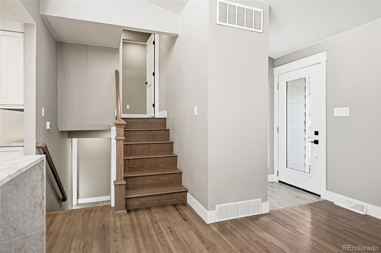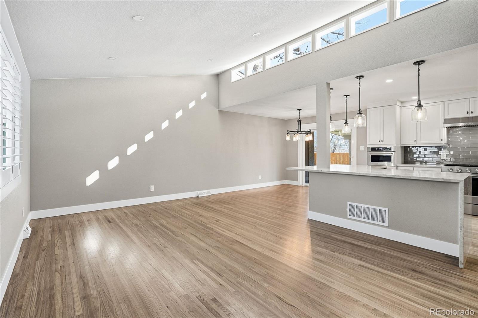 Exquisitely renovated 4-bedroom, 3-bath mid-century gem in a premium Arvada West location. This home has been completely rebuilt from the top of the roof to the sewer line—no detail overlooked. The upper level features a spacious primary suite with walk-in closet and spa-inspired five-piece bath, including soaking tub and custom shower. The main level offers a bright, open great room with soaring ceilings, abundant natural light, and refinished real hardwood floors flowing into the dining area and oversized, brand-new kitchen. The kitchen showcases floor-to-ceiling shaker cabinetry, waterfall granite island, full tile backsplash, KitchenAid appliance package, gas range, built-in microwave, under-counter beverage cooler, and French-door refrigerator. A few steps down from the living area are two secondary bedrooms and a full bath with tile flooring, updated vanity, and glass-enclosed soaking tub. The lower level includes a large family room with two oversized egress windows (30x42), a fourth bedroom, and a combined bathroom/laundry/utility space. Additional upgrades include new exterior wall and ceiling insulation, new roof, new stucco and exterior paint, new sewer line, updated plumbing and electrical fixtures, new interior doors and trim, and fresh two-tone interior paint throughout. The oversized 542-sq-ft two-car garage is finished with drywall and paint and is complemented by a separate workshop with cabinetry. Situated on a flat, fully usable 8,364-sq-ft lot that is fenced and professionally landscaped. Outdoor features include a covered 30x16 concrete patio, new front porch, and new concrete sidewalk. This is a true turn-key property offering quality, function, and timeless design.