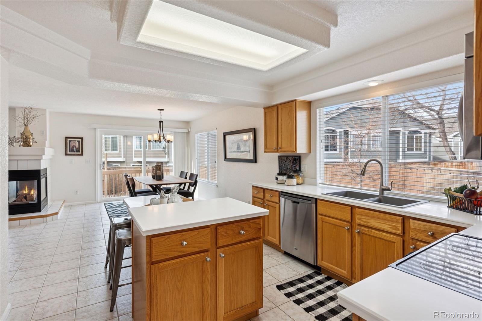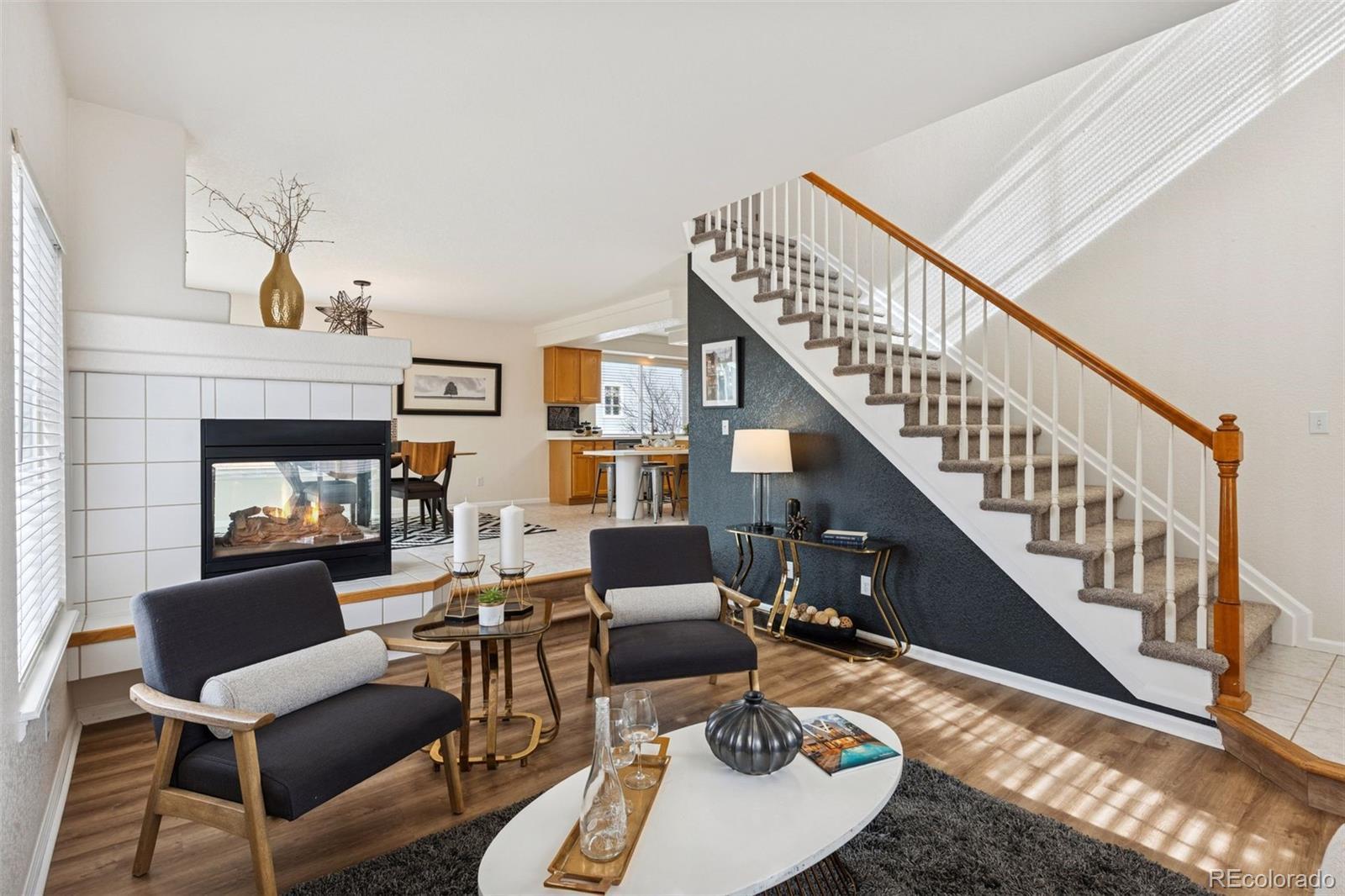 Located on a private cul-de-sac this two-story home combines a clean neutral palette, with a functional architectural design. The 1,704 finished square feet of interior living space is spacious and bright. The main level has an open and airy floor plan illuminated by expansive windows and doors. A central fireplace serves as a focal point between the living and dining rooms, creating a natural flow for entertaining. LVT wood flooring spans the main floor transitioning to tile in the kitchen and dining room. The kitchen is equipped with solid white countertops, an eat-in island, stainless steel appliances, and ample cabinetry. A dedicated laundry room and a powder bath complete the main floor. The freshly re-carpeted upstairs features three bedrooms, and two gorgeous remodeled bathrooms. A large open landing at the top of the stairs offers flexible space for a home office, or family room. The primary bathroom reflects a modern aesthetic with double sinks, stylish white tile, and a large euro glass-enclosed shower. Outdoor living is accessed directly through the large sliding doors. The private, fully fenced backyard is designed for ease of use, featuring maintenance-free turf, and a large concrete patio. The low maintenance exterior features a durable tile roof and an attached two-car garage. The neighborhood HOA includes grounds maintenance, snow removal, trash, and a private pool; and the master association membership provides access to a clubhouse, fitness center, park, and pool!
