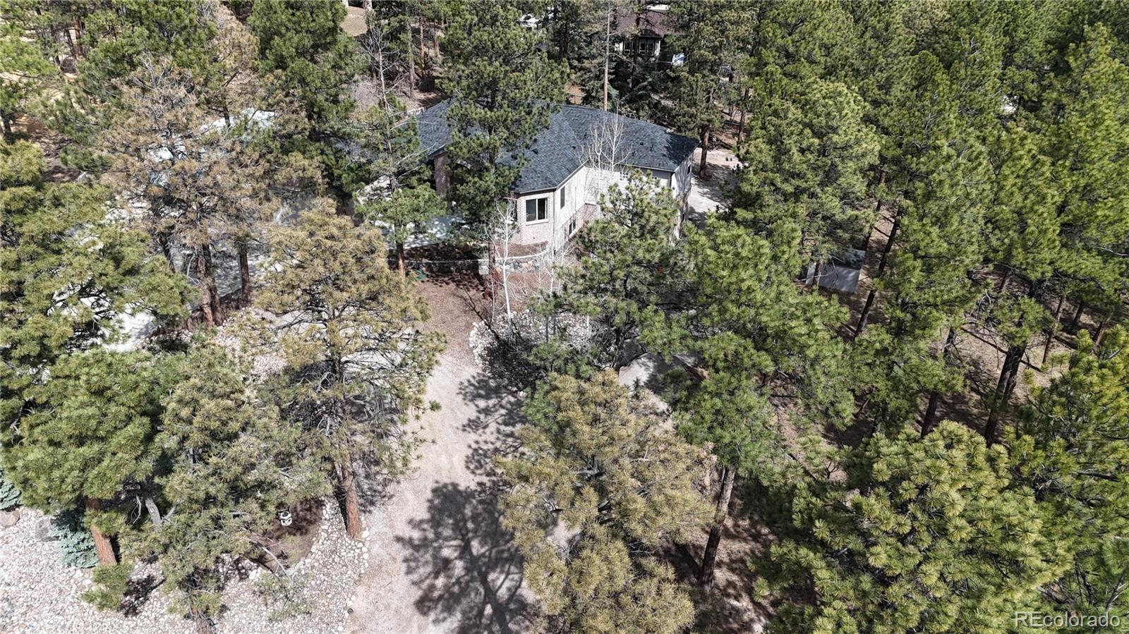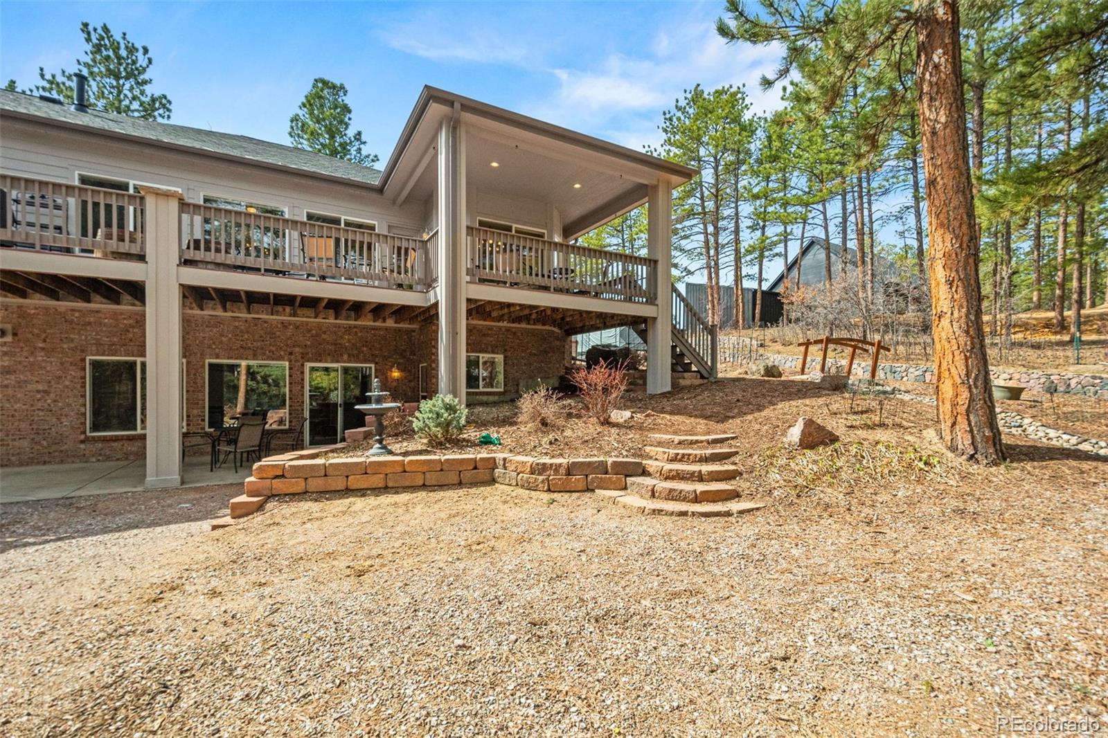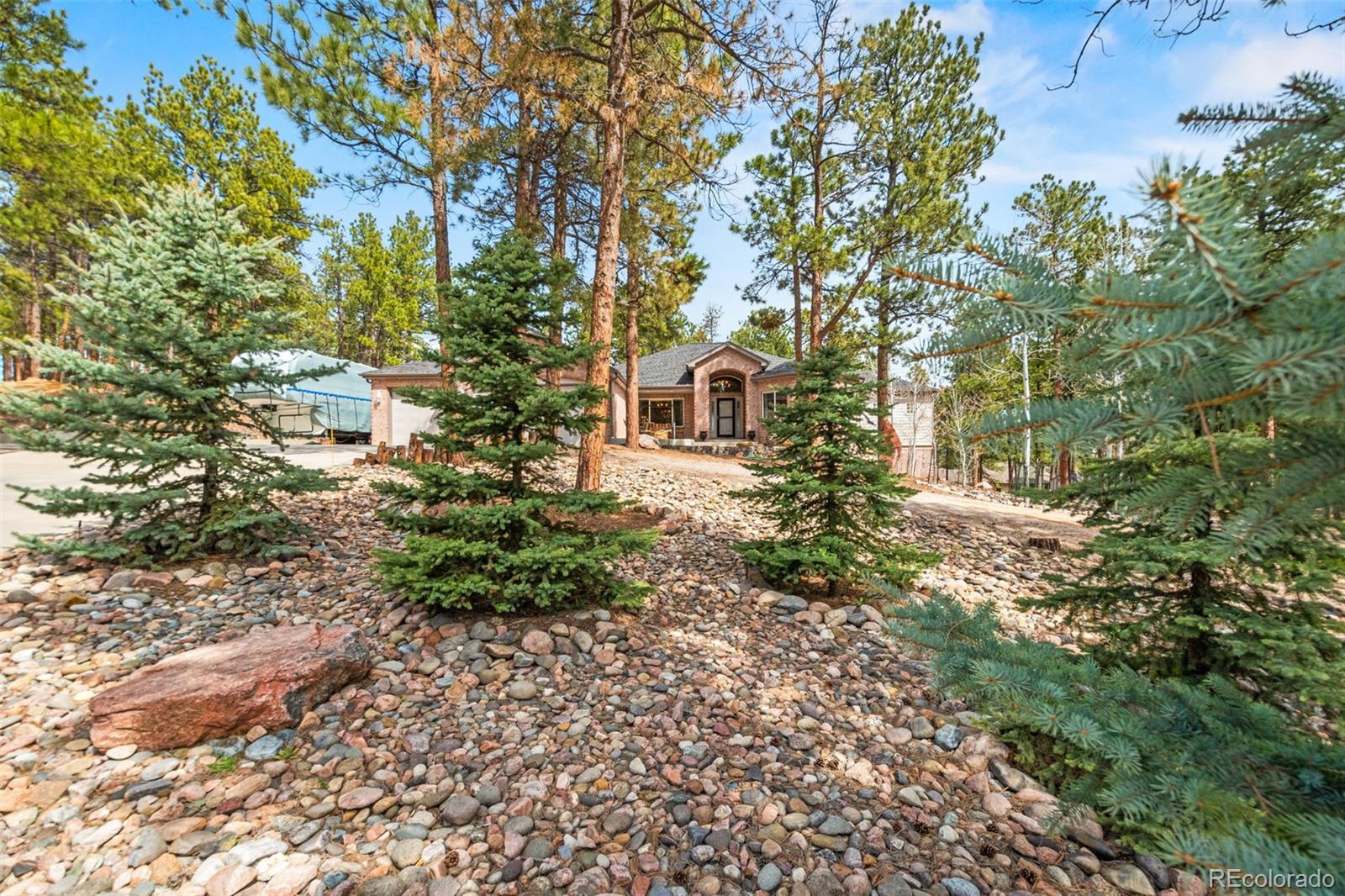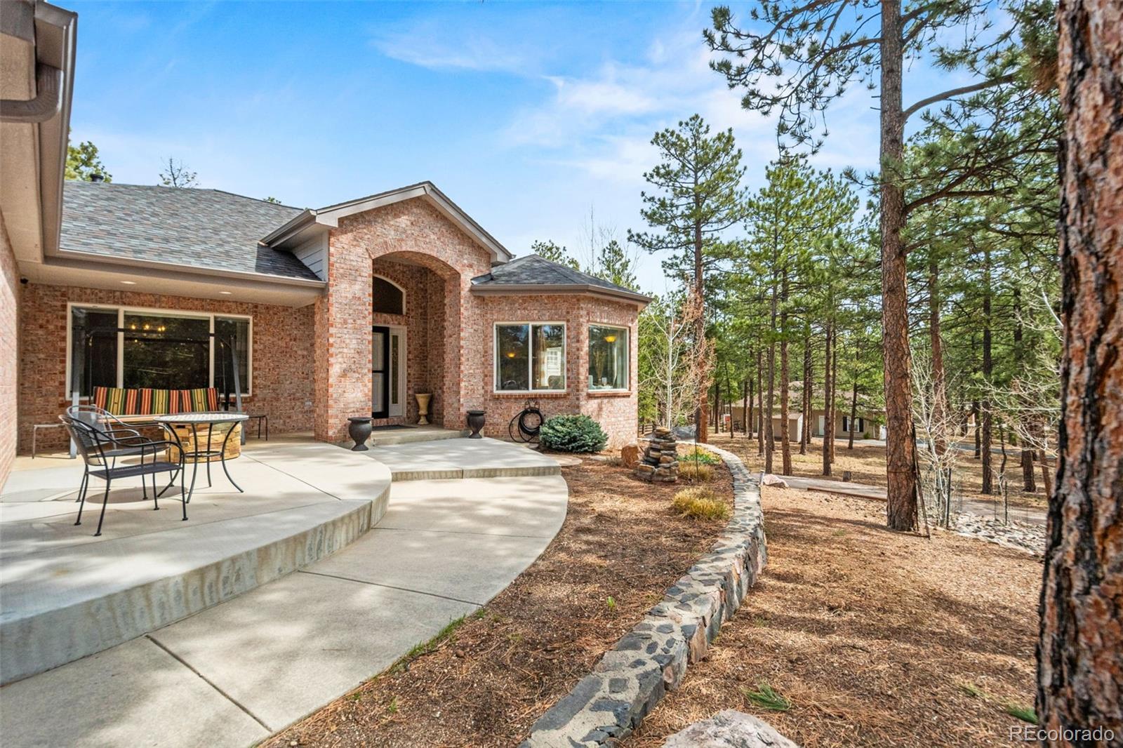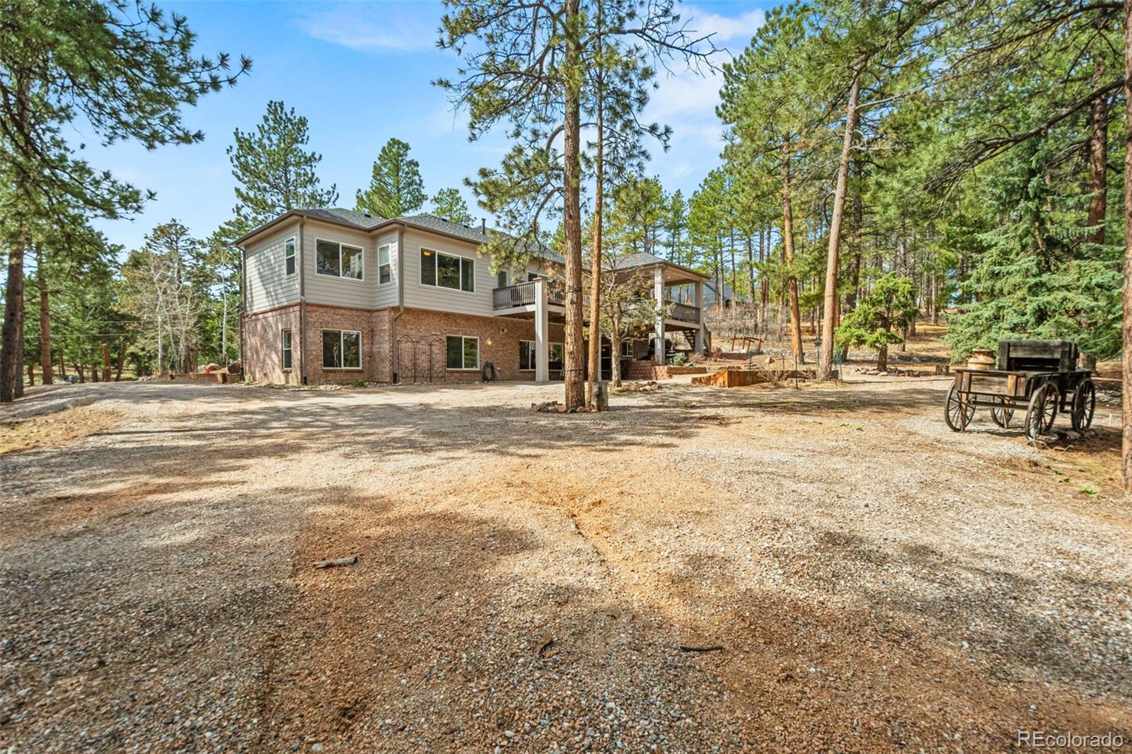 This gorgeous 4,401 finished square foot ranch style home features 4 bedrooms and 4 bathrooms and is perfectly situated on a private 1 acre heavily wooded lot in the desirable Sage Port neighborhood. This stunning home showcases an open floor plan with lots of windows throughout bringing in natural light and views of the cascading pine trees. The bright and airy great room boasts a floor to ceiling stacked stone gas fireplace, wood floors, beautiful picture windows and is open to the completely remodeled kitchen and the large covered deck. The beautifully remodeled kitchen is perfect for the chef in your family including quartz countertops, tile back splash, a large prep island, stainless steel appliances, breakfast bar, breakfast nook, a large walk-in pantry and access to the formal dining room which is perfect for family gatherings. The spacious primary suite features an enormous walk-in closet, lots of natural light and a relaxing 5-piece bath featuring a large soaking tub, double sinks and a stand-alone shower. The finished walkout lower level includes towering 9 1/6' ceilings, 3 bedrooms, 2 full bathrooms and a second laundry room making this perfect for multigenerational living or for your guest to feel right at home. The lower-level family room is a perfect place for entertaining including a gas fireplace and access to the relaxing patio and beautiful oversized backyard. This immaculate home has been meticulously maintained with new carpet and paint throughout, a new impact resistant roof, new air conditioner and water heater. The beautiful backyard is a perfect spot for you to relax and enjoy the beauty of mother nature. Save money on RV storage with the convenience of the concrete RV parking space and electrical hookup next to the garage. You are sure to love the feeling of mountain living with a voluntary HOA and an easy 35 minute commute to either the Denver Tech Center or Northern Colorado Springs.