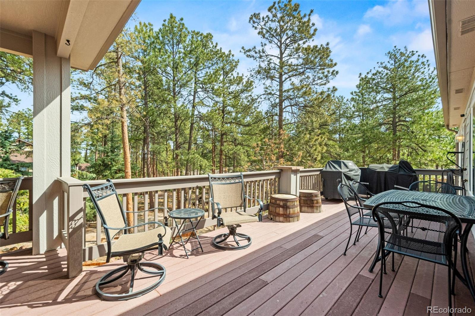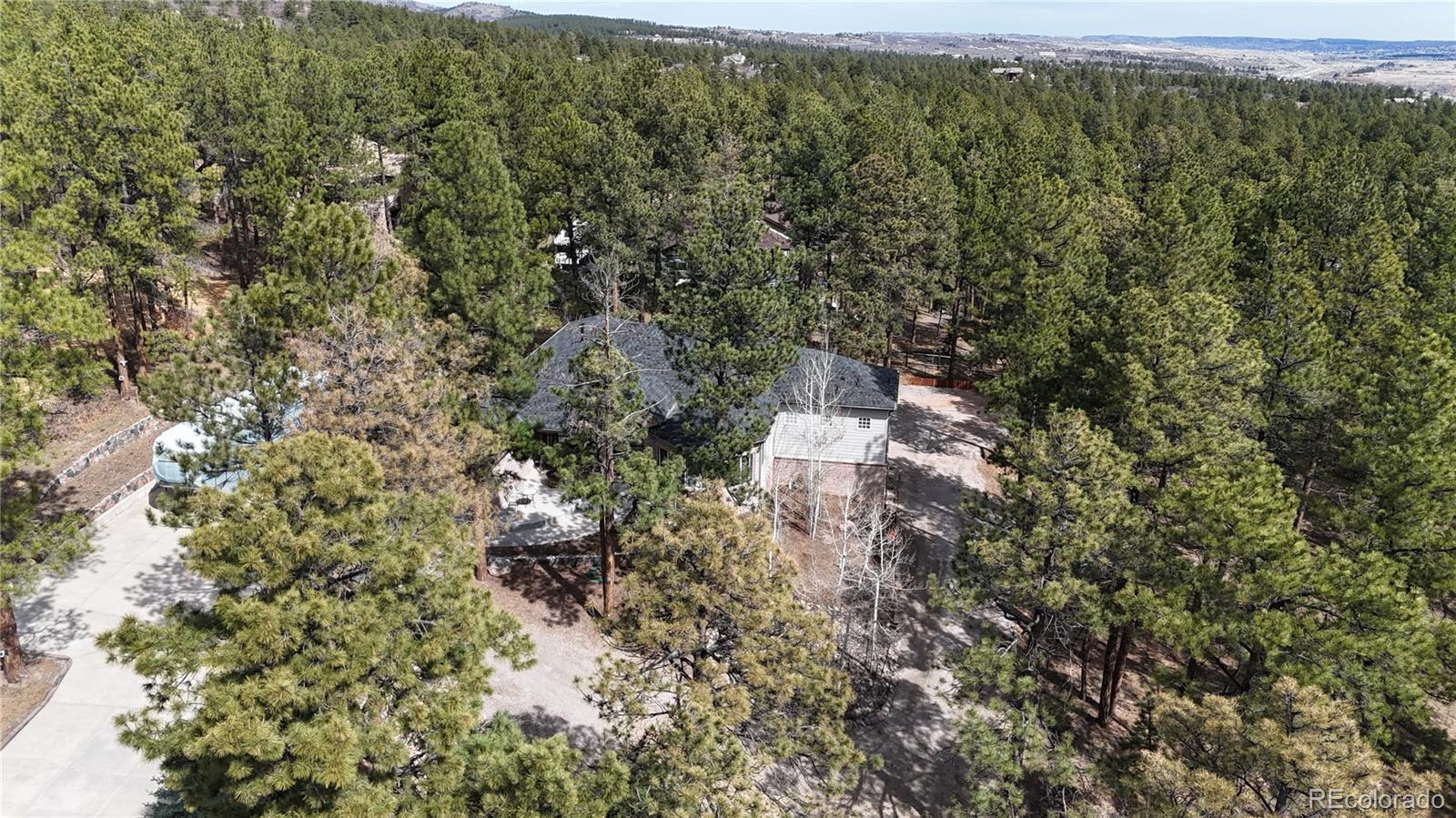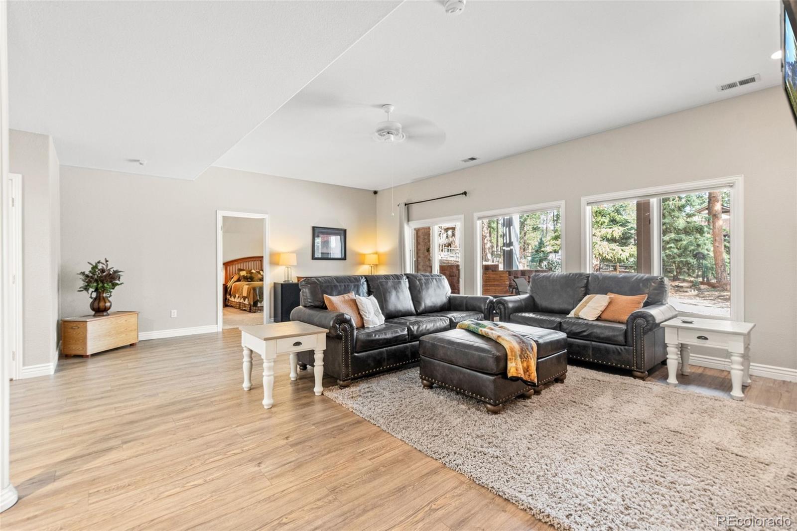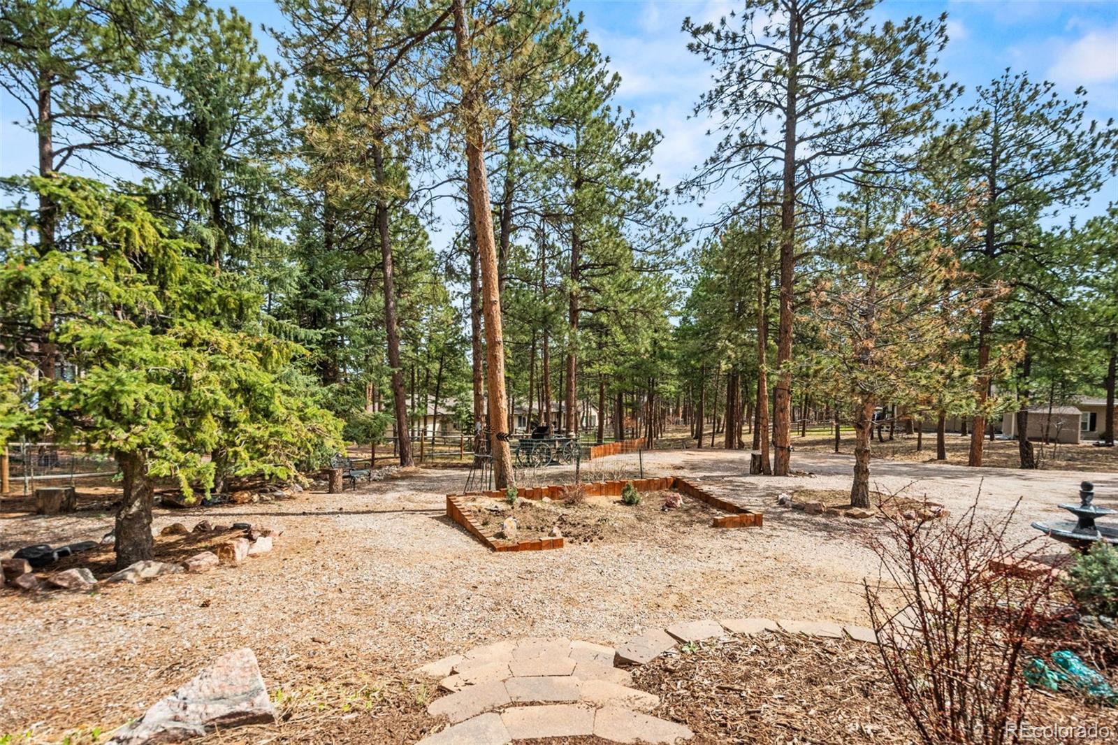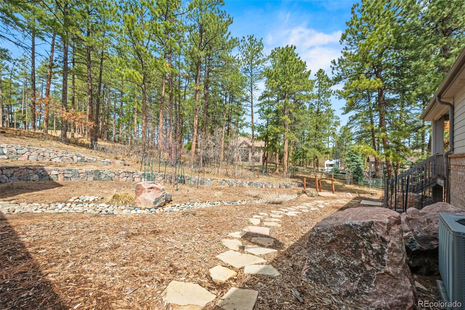 This gorgeous 4,401 finished square foot ranch style home features 4 bedrooms and 4 bathrooms and is perfectly situated on a private 1 acre heavily wooded lot in the desirable Sage Port neighborhood. This stunning home showcases an open floor plan with lots of windows throughout bringing in natural light and views of the cascading pine trees. The bright and airy great room boasts a floor to ceiling stacked stone gas fireplace, wood floors, beautiful picture windows and is open to the completely remodeled kitchen and the large covered deck. The beautifully remodeled kitchen is perfect for the chef in your family including quartz countertops, tile back splash, a large prep island, stainless steel appliances, breakfast bar, breakfast nook, a large walk-in pantry and access to the formal dining room which is perfect for family gatherings. The spacious primary suite features an enormous walk-in closet, lots of natural light and a relaxing 5-piece bath featuring a large soaking tub, double sinks and a stand-alone shower. The finished walkout lower level includes towering 9 1/6' ceilings, 3 bedrooms, 2 full bathrooms and a second laundry room making this perfect for multigenerational living or for your guest to feel right at home. The lower-level family room is a perfect place for entertaining including a gas fireplace and access to the relaxing patio and beautiful oversized backyard. This immaculate home has been meticulously maintained with new carpet and paint throughout, a new impact resistant roof, new air conditioner and water heater. The beautiful backyard is a perfect spot for you to relax and enjoy the beauty of mother nature. Save money on RV storage with the convenience of the concrete RV parking space and electrical hookup next to the garage. You are sure to love the feeling of mountain living with a voluntary HOA and an easy 35 minute commute to either the Denver Tech Center or Northern Colorado Springs.