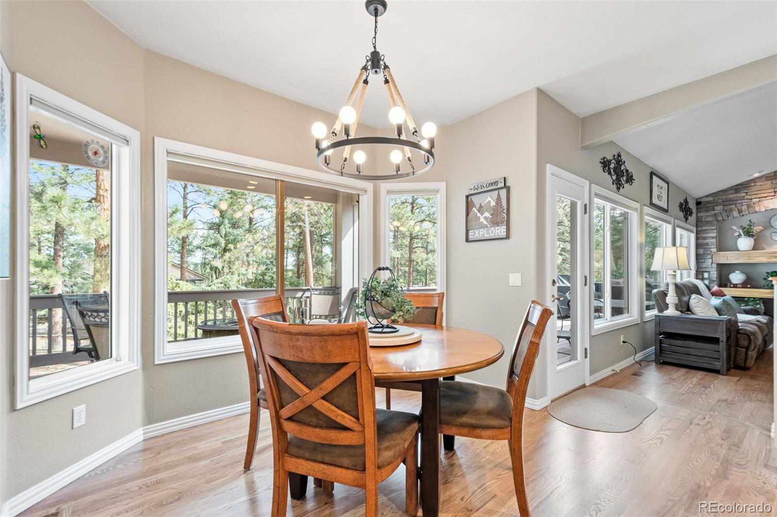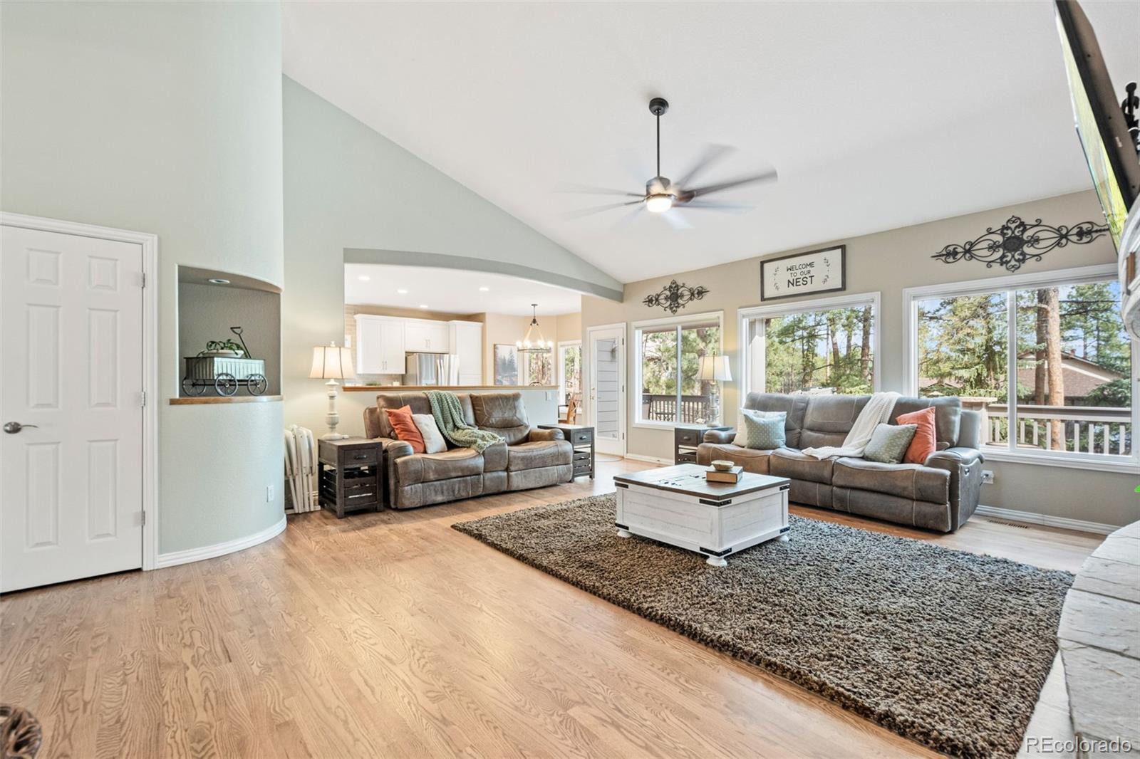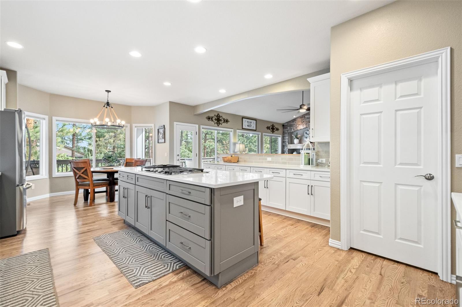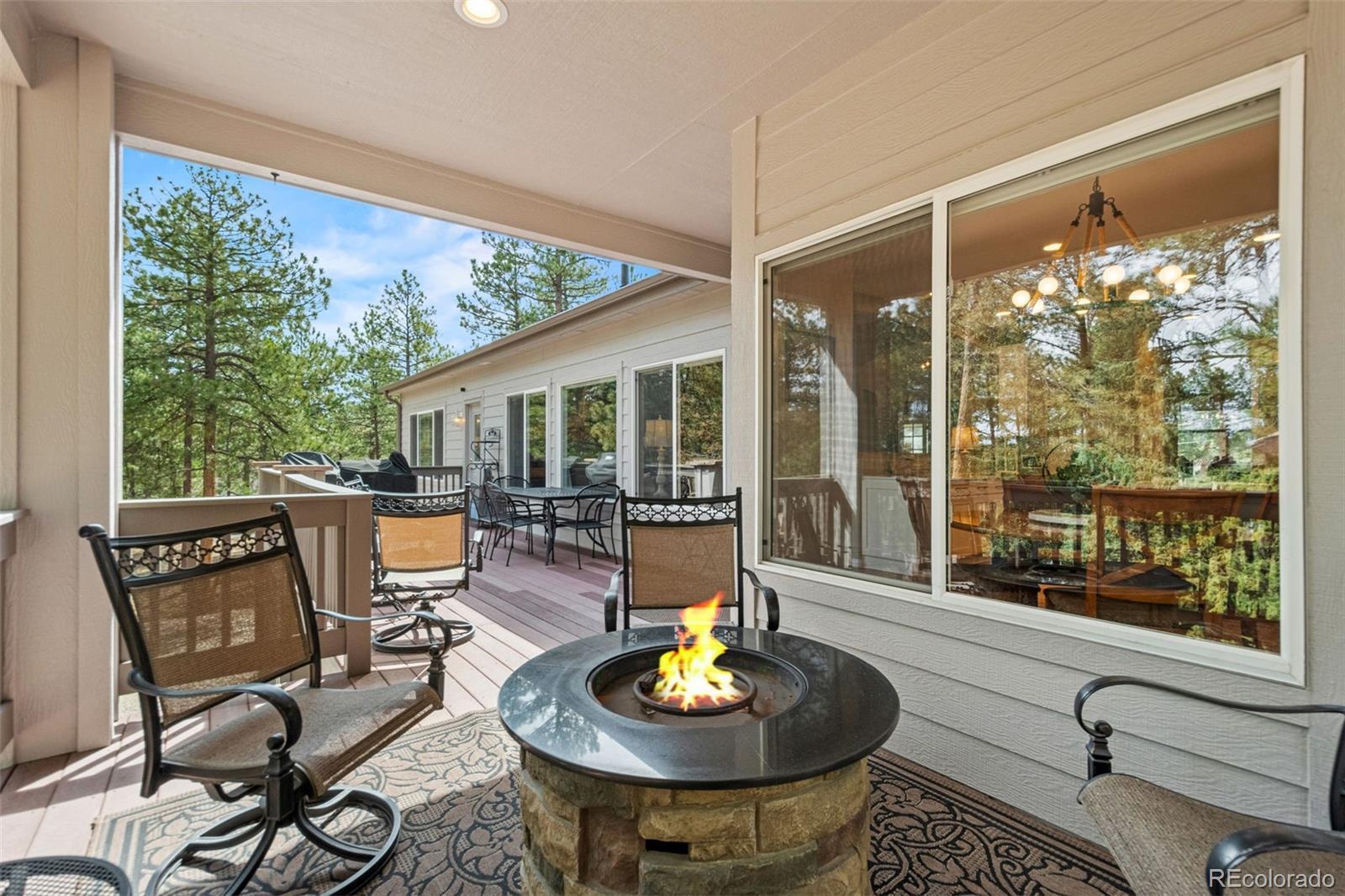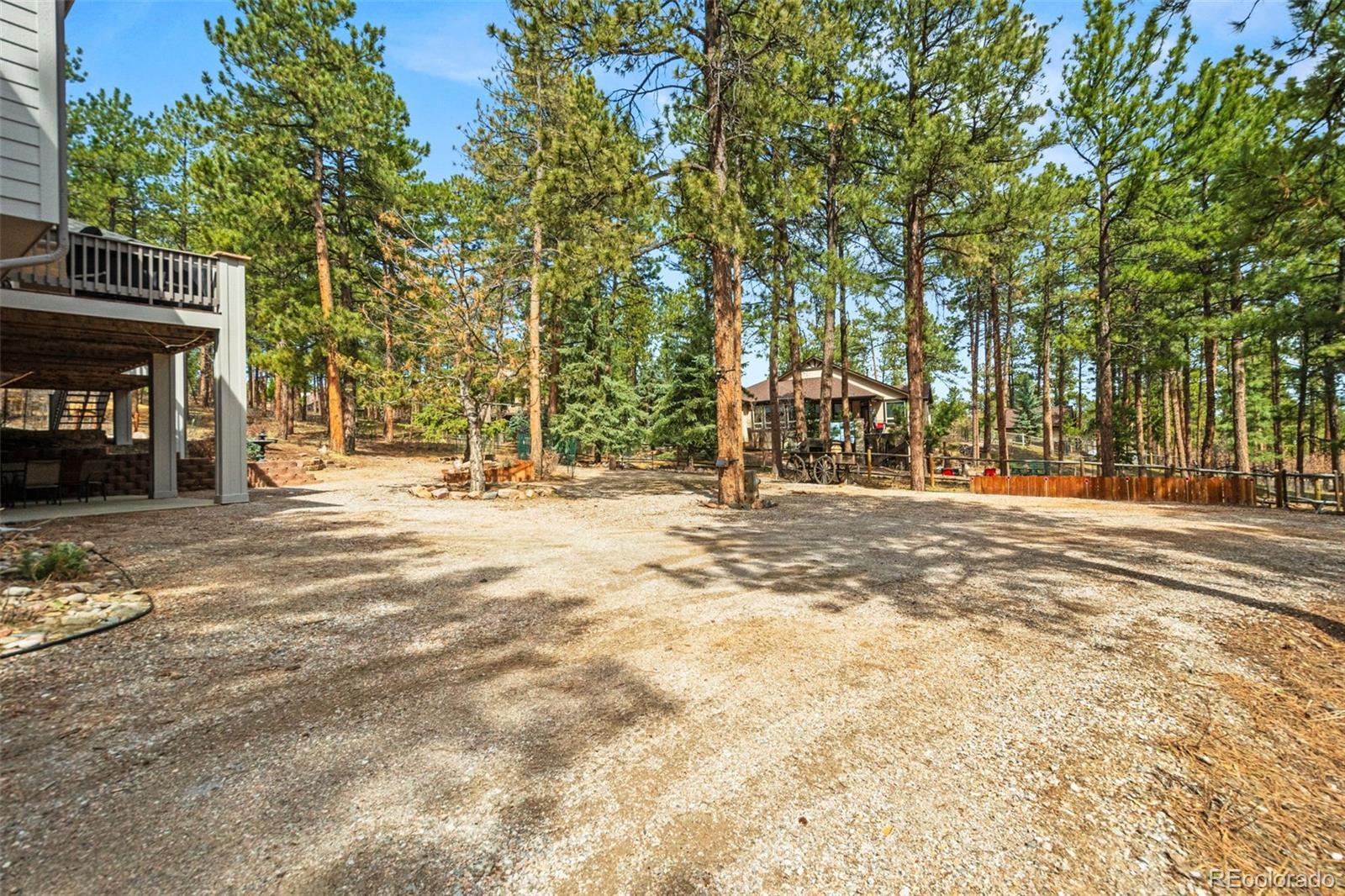 This gorgeous 4,401 finished square foot ranch style home features 4 bedrooms and 4 bathrooms and is perfectly situated on a private 1 acre heavily wooded lot in the desirable Sage Port neighborhood. This stunning home showcases an open floor plan with lots of windows throughout bringing in natural light and views of the cascading pine trees. The bright and airy great room boasts a floor to ceiling stacked stone gas fireplace, wood floors, beautiful picture windows and is open to the completely remodeled kitchen and the large covered deck. The beautifully remodeled kitchen is perfect for the chef in your family including quartz countertops, tile back splash, a large prep island, stainless steel appliances, breakfast bar, breakfast nook, a large walk-in pantry and access to the formal dining room which is perfect for family gatherings. The spacious primary suite features an enormous walk-in closet, lots of natural light and a relaxing 5-piece bath featuring a large soaking tub, double sinks and a stand-alone shower. The finished walkout lower level includes towering 9 1/6' ceilings, 3 bedrooms, 2 full bathrooms and a second laundry room making this perfect for multigenerational living or for your guest to feel right at home. The lower-level family room is a perfect place for entertaining including a gas fireplace and access to the relaxing patio and beautiful oversized backyard. This immaculate home has been meticulously maintained with new carpet and paint throughout, a new impact resistant roof, new air conditioner and water heater. The beautiful backyard is a perfect spot for you to relax and enjoy the beauty of mother nature. Save money on RV storage with the convenience of the concrete RV parking space and electrical hookup next to the garage. You are sure to love the feeling of mountain living with a voluntary HOA and an easy 35 minute commute to either the Denver Tech Center or Northern Colorado Springs.