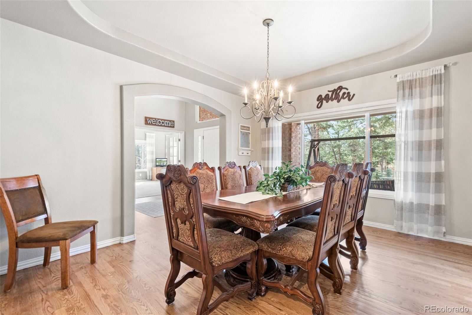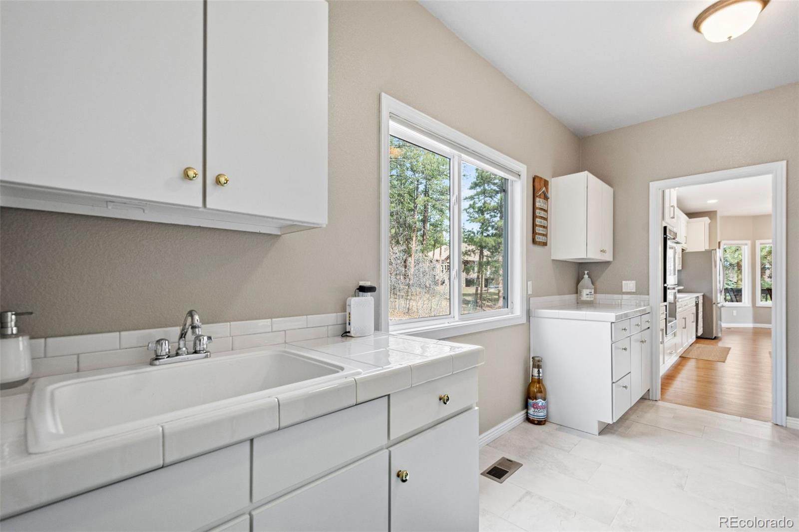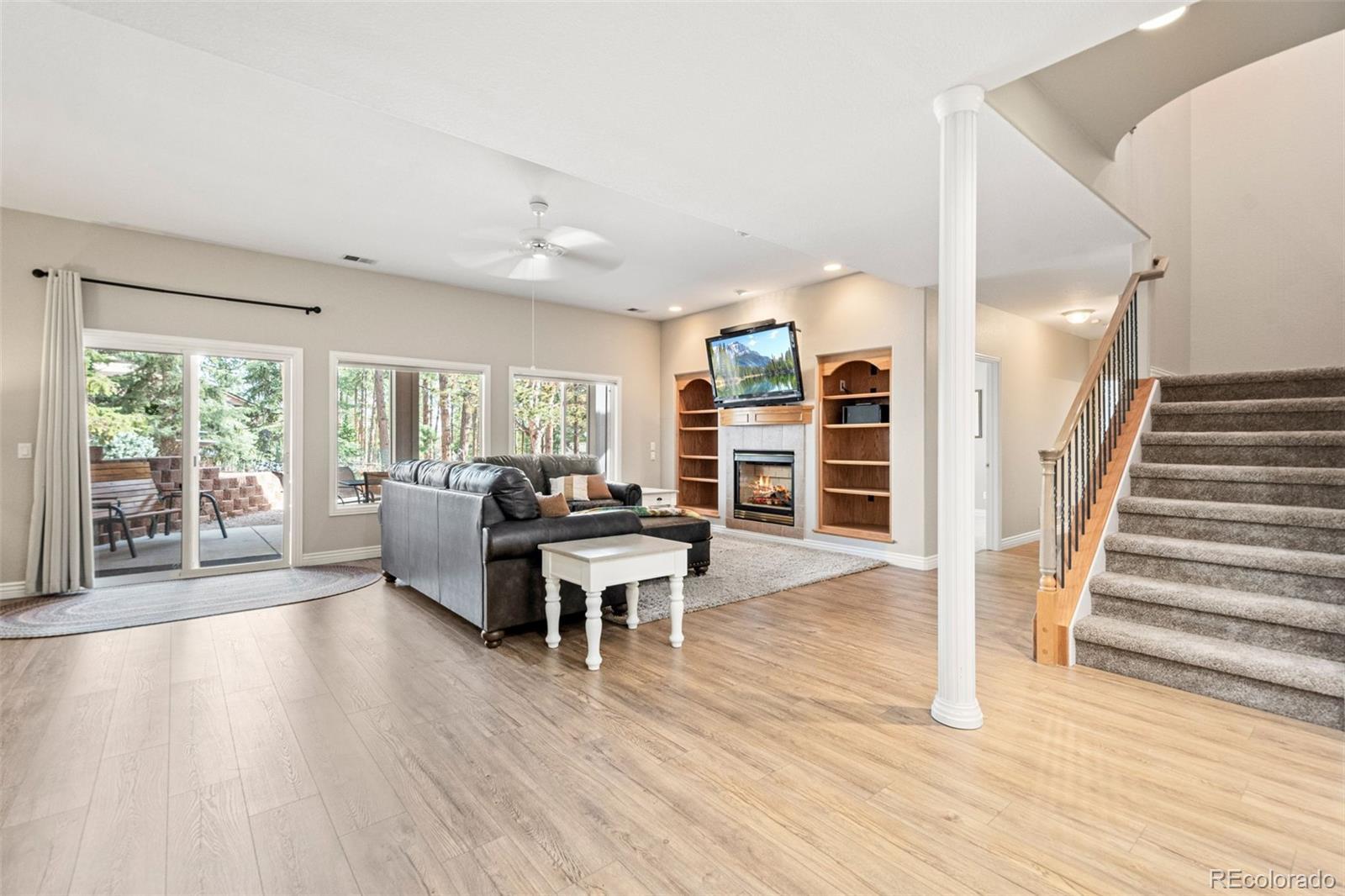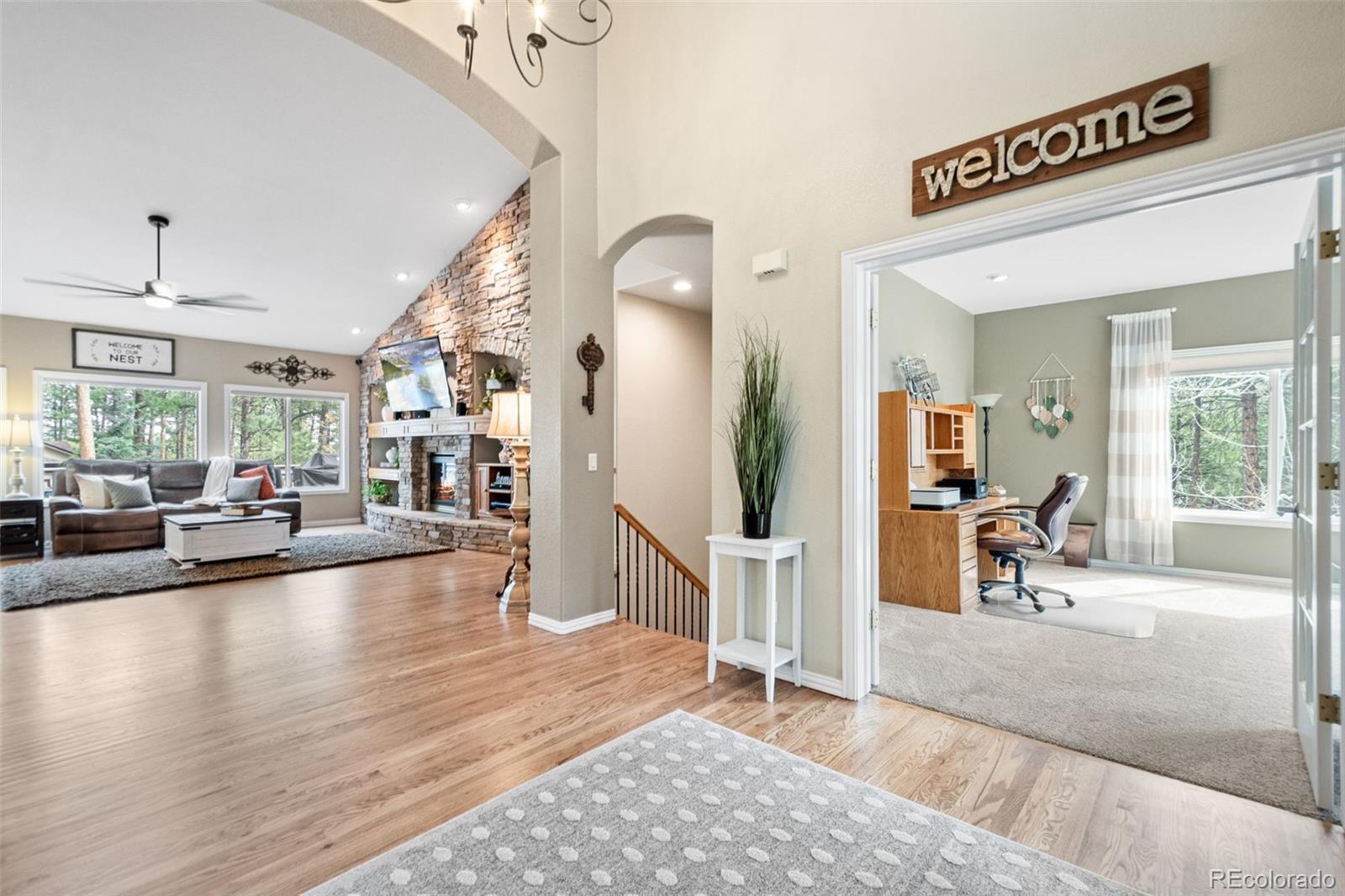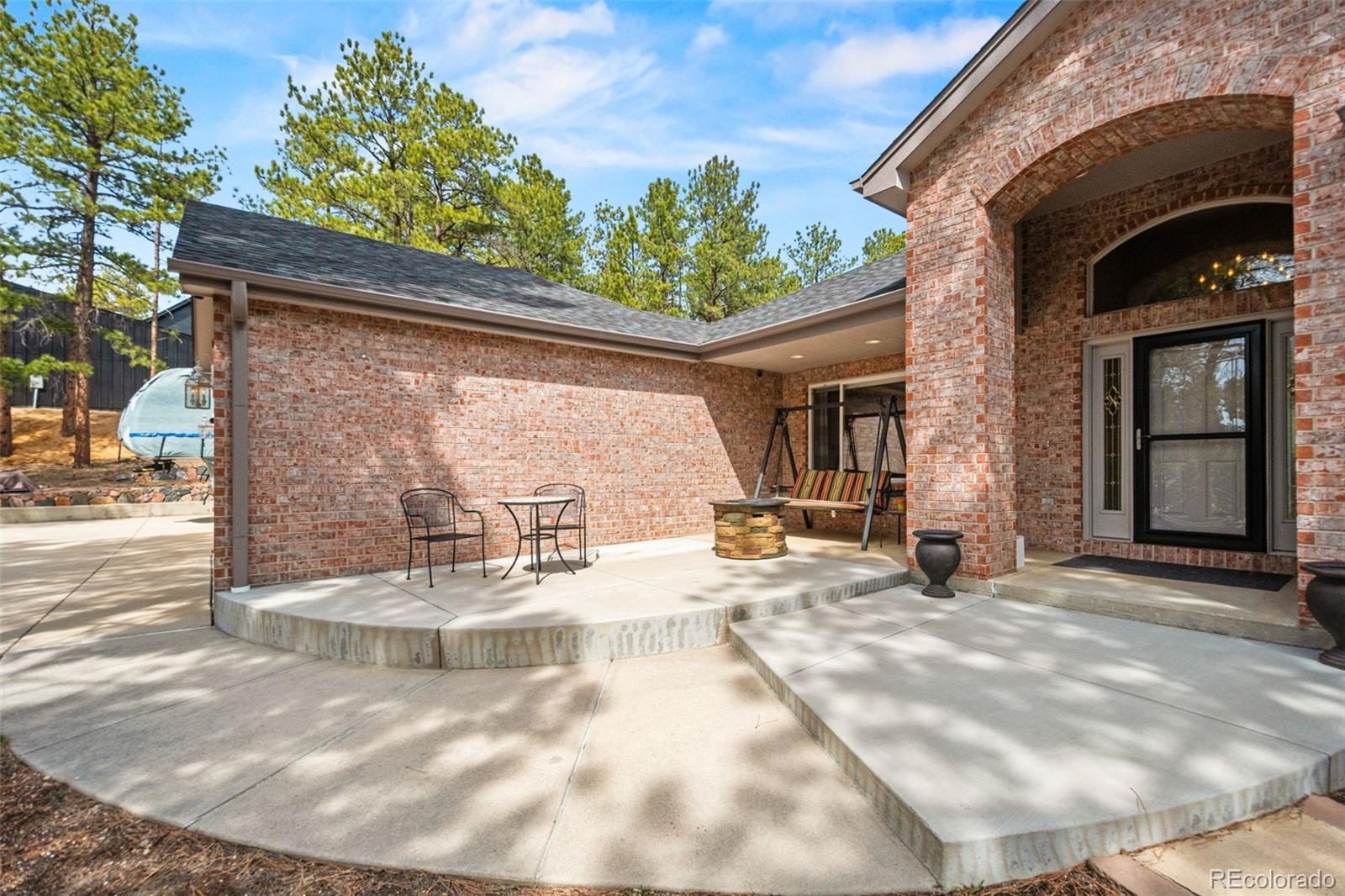 This gorgeous 4,401 finished square foot ranch style home features 4 bedrooms and 4 bathrooms and is perfectly situated on a private 1 acre heavily wooded lot in the desirable Sage Port neighborhood. This stunning home showcases an open floor plan with lots of windows throughout bringing in natural light and views of the cascading pine trees. The bright and airy great room boasts a floor to ceiling stacked stone gas fireplace, wood floors, beautiful picture windows and is open to the completely remodeled kitchen and the large covered deck. The beautifully remodeled kitchen is perfect for the chef in your family including quartz countertops, tile back splash, a large prep island, stainless steel appliances, breakfast bar, breakfast nook, a large walk-in pantry and access to the formal dining room which is perfect for family gatherings. The spacious primary suite features an enormous walk-in closet, lots of natural light and a relaxing 5-piece bath featuring a large soaking tub, double sinks and a stand-alone shower. The finished walkout lower level includes towering 9 1/6' ceilings, 3 bedrooms, 2 full bathrooms and a second laundry room making this perfect for multigenerational living or for your guest to feel right at home. The lower-level family room is a perfect place for entertaining including a gas fireplace and access to the relaxing patio and beautiful oversized backyard. This immaculate home has been meticulously maintained with new carpet and paint throughout, a new impact resistant roof, new air conditioner and water heater. The beautiful backyard is a perfect spot for you to relax and enjoy the beauty of mother nature. Save money on RV storage with the convenience of the concrete RV parking space and electrical hookup next to the garage. You are sure to love the feeling of mountain living with a voluntary HOA and an easy 35 minute commute to either the Denver Tech Center or Northern Colorado Springs.