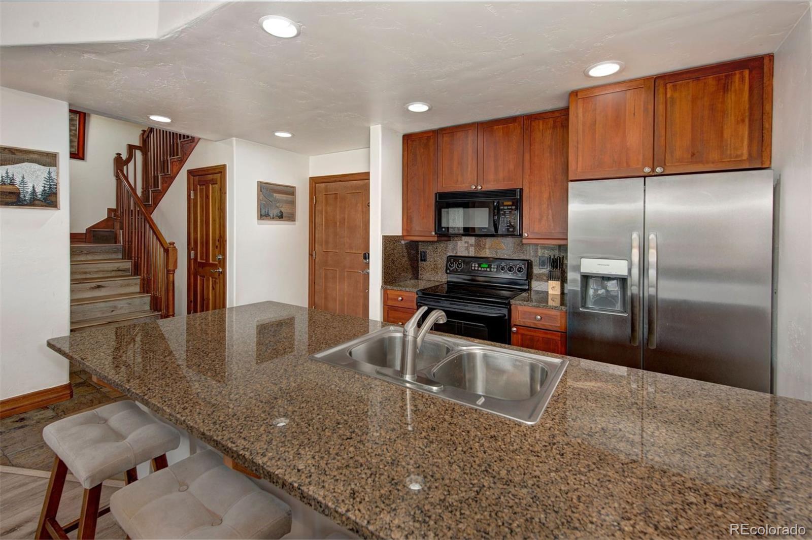 This exquisite top-floor residence in Highland Greens Lodge offers a rare blend of luxury and location. A south-facing two-story condo, with commanding views of Breckenridge Ski Resort and Mount Baldy, is bathed in natural sunlight throughout the day. The primary suite features vaulted ceilings, a generous walk-in closet and privacy on the upper floor, making it a tranquil getaway. Elegantly updated with luxury vinyl flooring, upgraded countertops, fresh designer paint, and newer furnishings, every detail reflects thoughtful sophistication. Ideally located across from the Breckenridge Golf Course and steps from the Colorado Trail, with a private winter shuttle to the gondola, this home offers seamless access to both adventure and alpine serenity.
