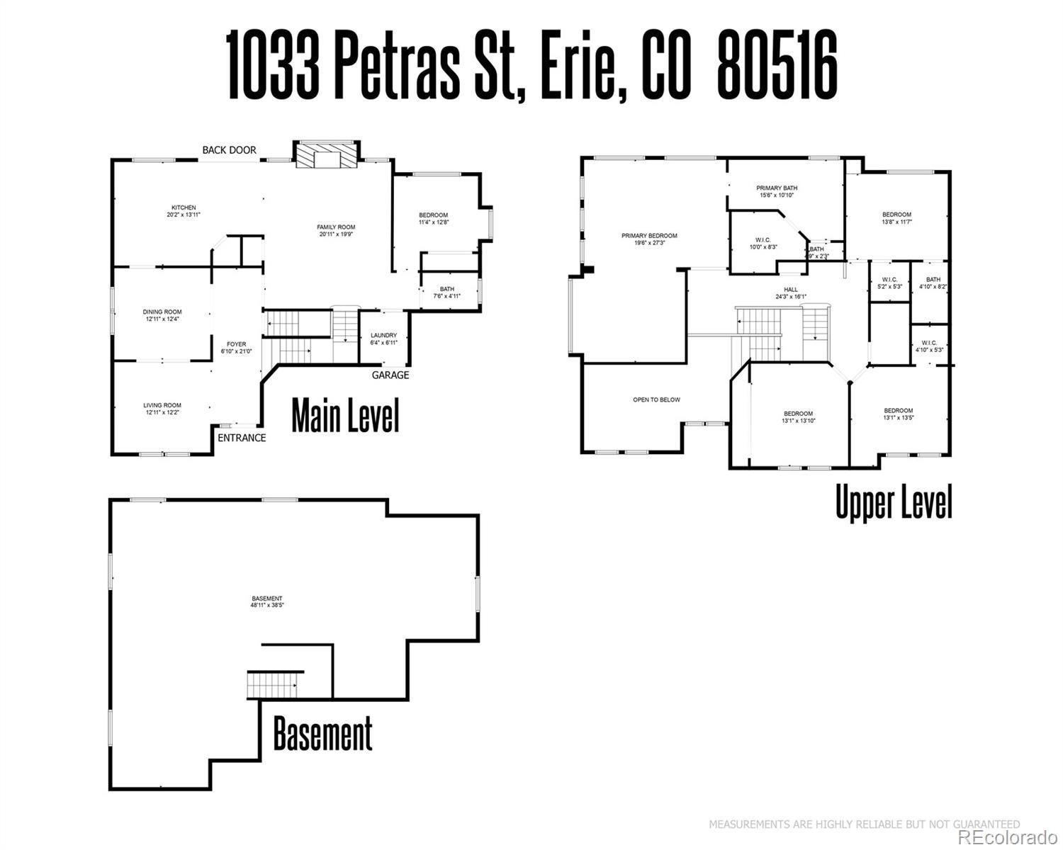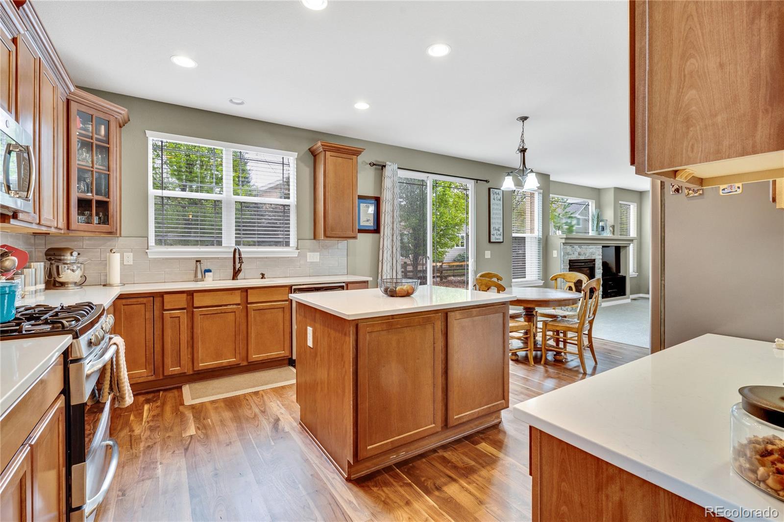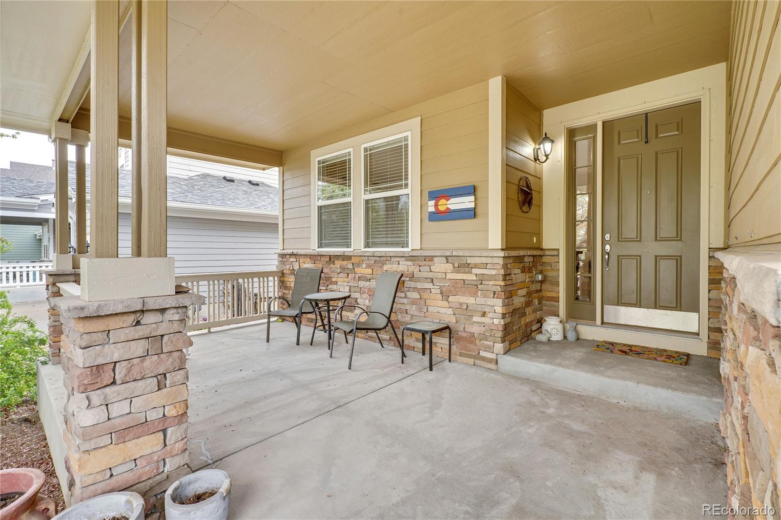 Welcome home to 1033 Petras Street in the sought after Erie Commons neighborhood! This home is the “Pike Model”, the largest Erie Commons home, built by reputable builder, Taylor Morrison. Be welcomed by a large covered patio and step into the elegant walnut floors greeting you at the front door beneath the soaring ceilings above. On the main level you find several living spaces for both formal and casual living. The stand-alone dining room and adjacent den will welcome guests, while the open kitchen and living room space (with a cozy gas fire place) will accommodate everyday living. The well-appointed kitchen boasts stainless steel appliances, an island for food prep covered with slab quartz countertops, ample cabinet space, and walk-in pantry. The first floor also has a 5th bedroom or use as an office/workout space, a full bathroom, laundry area that steps in the spacious three car garage. The second story has a fabulous loft-like hallway that serves as entry point to each of the four bedrooms, featuring the spacious primary bedroom with its own “owner’s retreat” area and enormous 5-piece private bath with soaking tub, shower, and walk-in closet, and double vanity sinks. Bonus second primary upstairs as well! The large premium unfinished basement was dug out for 10 foot ceilings and is ready for storage and future renovation. The backyard is a private fenced oasis with a large concrete patio for entertaining. Systems are solid: new roof in 2024, AC unit plus attic fan will keep you cool in the summer and the new furnace (2024) will keep you toasty in winter. The grassy lot next door is owned by the city, will never be built on, and functions as a second backyard maintained by the HOA. Walk to the nearby parks, community pool, and endless trails out your doorstep; stroll to Erie restaurants and rec center; drive your golf cart to nearby premiere Colorado National Golf Course.