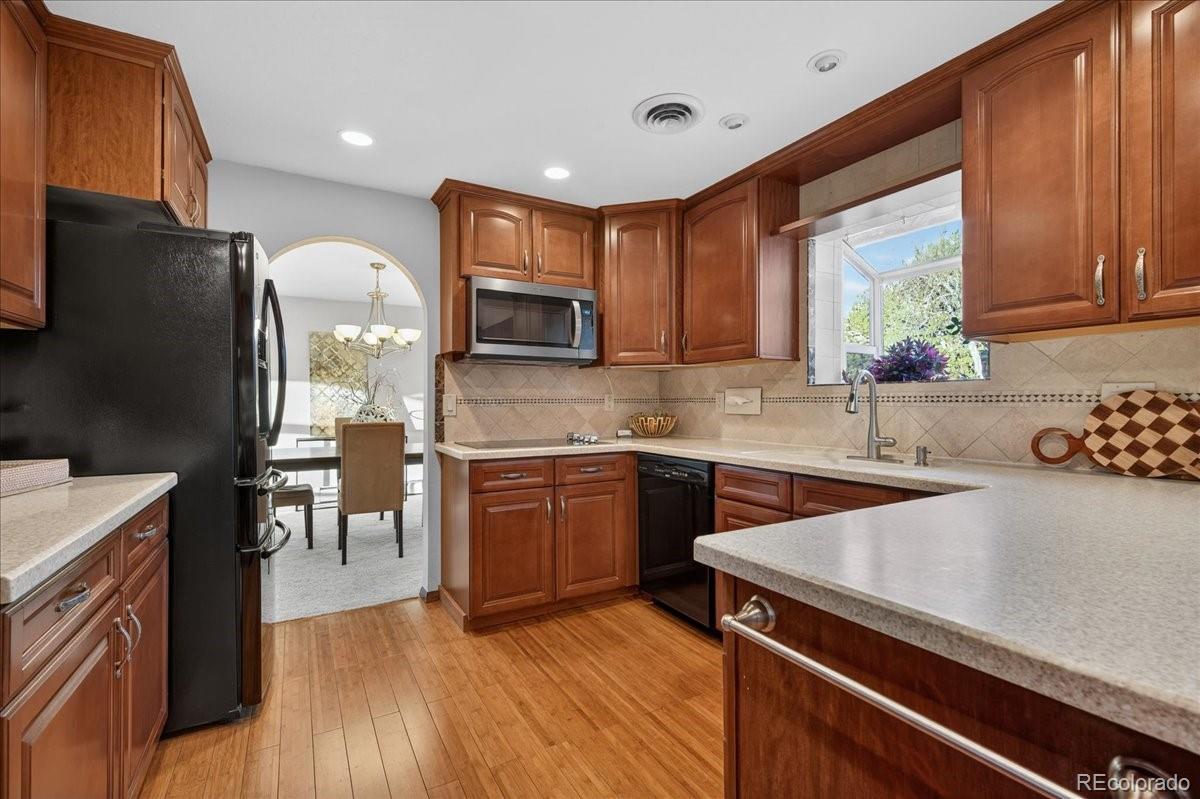 Beautiful custom multi-level home in desirable Sierra Vista, meticulously cared for and thoughtfully updated over 39 years. Offers 4 bedrooms and 4 baths (2 full, ¾, ½). Recently remodeled primary bath with heated tile floors. Spacious living and dining areas; kitchen features quality cabinetry, double ovens, and glass cooktop. Newer double-hung windows and four Milgard sliders with built-in blinds. High-efficiency hot water heat, new central A/C, whole-house fan, and cozy family room with remote-controlled gas fireplace. Newer roof and cedar privacy fence. Oversized attached 2-car garage plus generous garden-level and crawl space storage. Gardener’s dream yard with roses, fruit trees, raspberries, perennials, vegetable beds, mature trees, sprinkler system, and heated greenhouse. Enjoy outdoor living from the covered patio (ceiling fan), kitchen deck, and covered balcony—porch swing included. Located in the highly regarded Jefferson County R-1 School District, with access to Lincoln Charter School and award-recognized Sierra Vista Elementary. Close to Majestic View Park and the Ralston Creek Trail for outdoor recreation, and just minutes to Olde Town Arvada’s shops, dining, light rail access, and year-round community events.