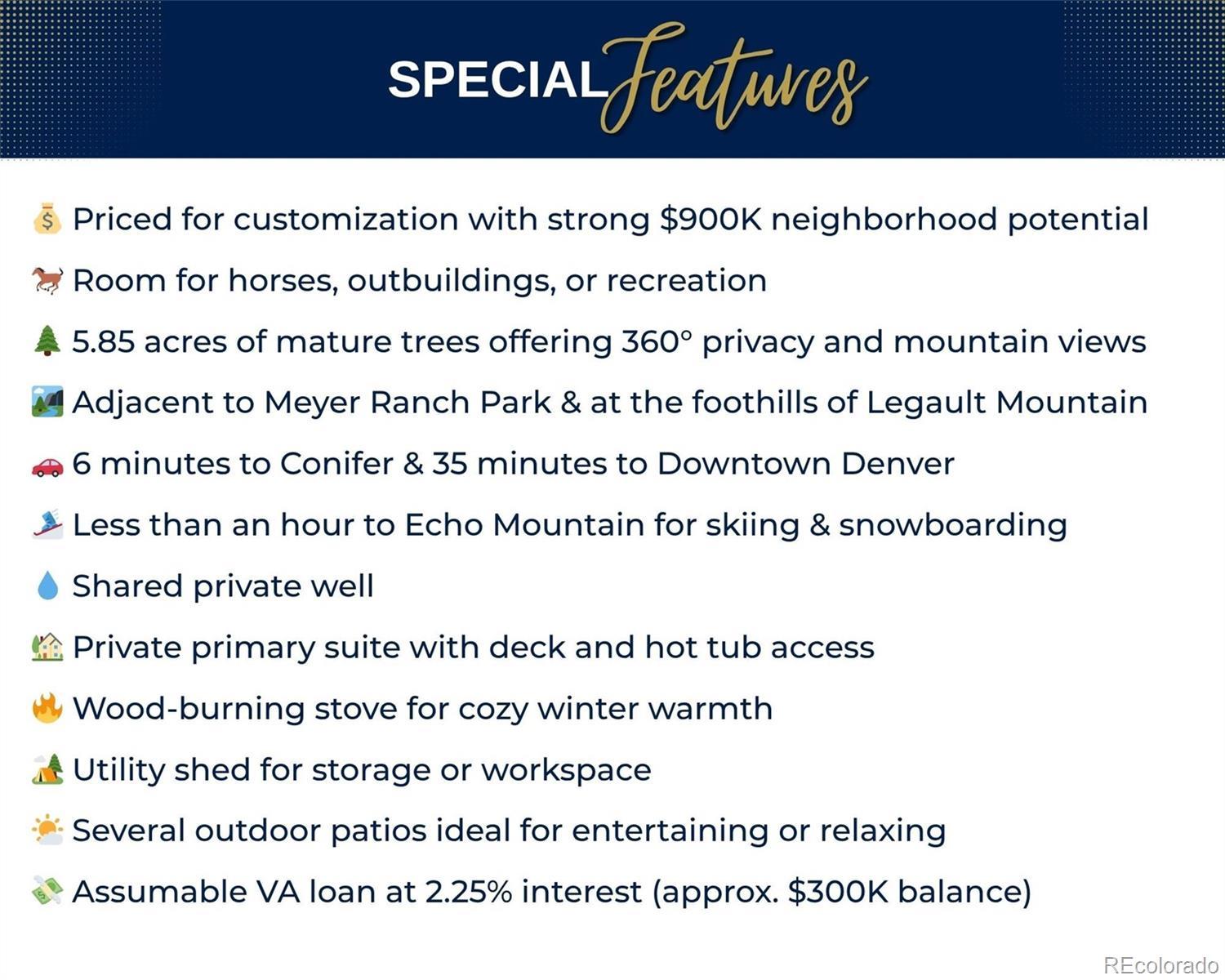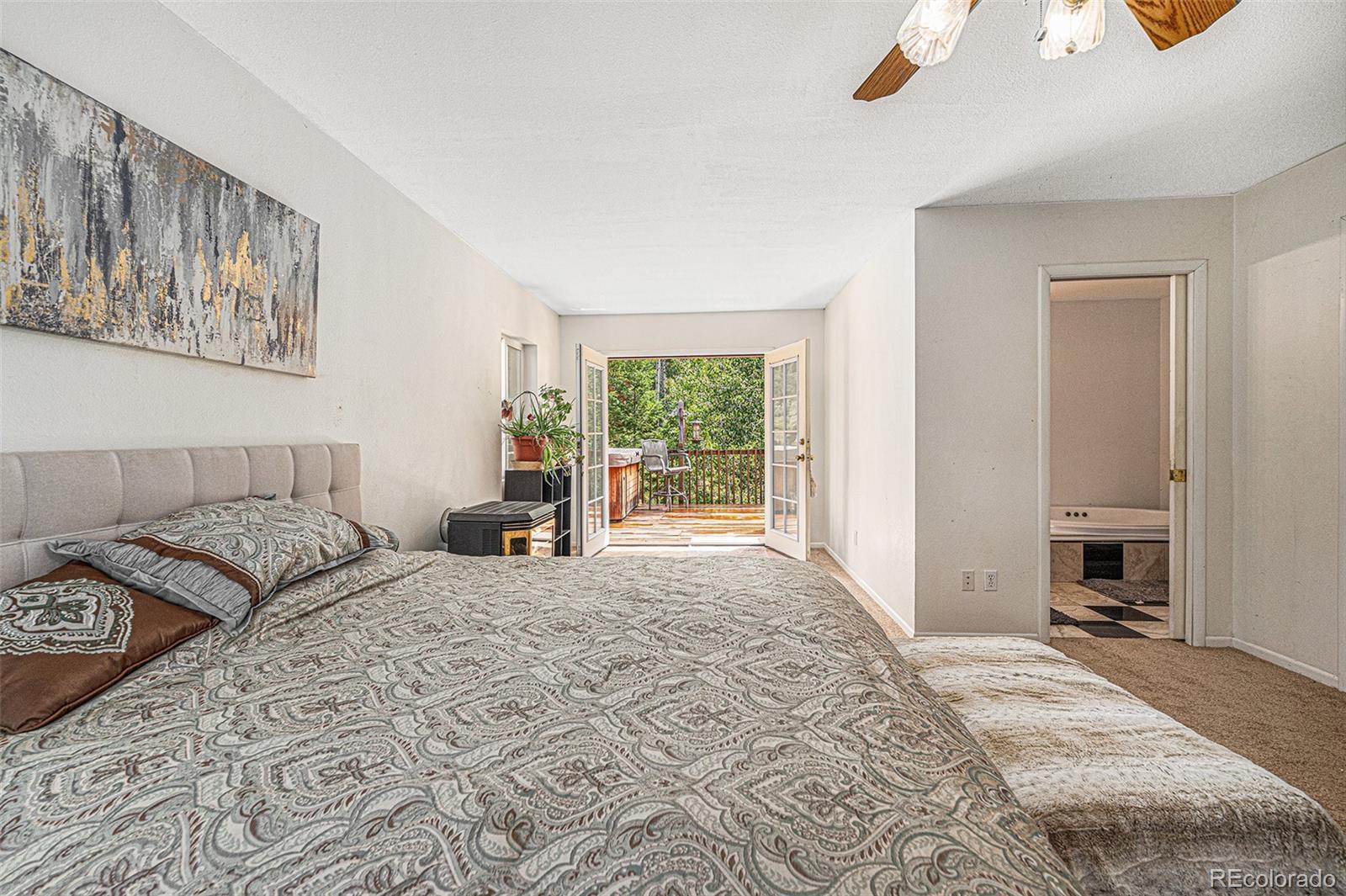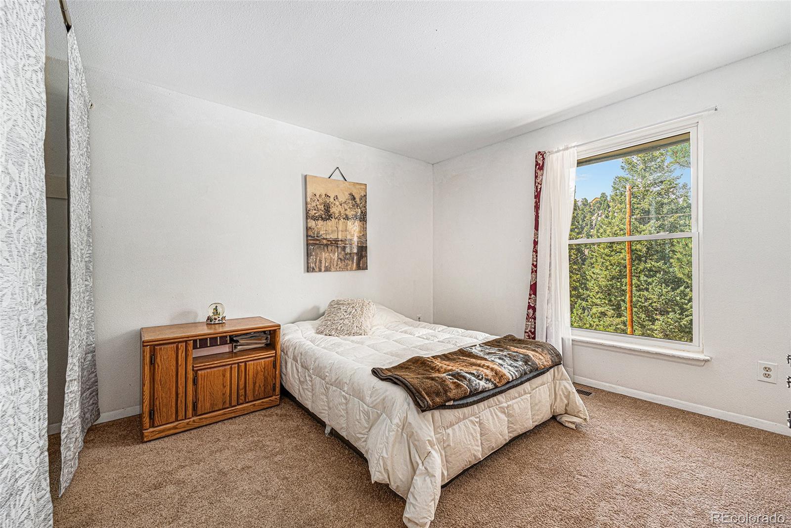 **Assumable Loan at an Ultra-Low 2.25% Interest Rate.** Experience privacy, space, and modern comfort with this 3-bedroom, 3-bathroom mountain home plus dedicated office—set on over 5 acres just off Highway 285 and only 30 minutes from Denver. Enjoy easy access to public parks, open space, and scenic trails while living in a true mountain retreat. The home features a spacious upper-level primary suite with a fully updated ensuite bathroom, complete with a jetted tub, separate shower, and dual sinks. French doors open to a private deck and hot tub, the perfect place to unwind. The main level offers two additional bedrooms, a fully remodeled full bath, a cozy family room with large picture windows, and an updated kitchen with modern finishes and functional layout. A wood-burning stove adds warmth and charm—ideal for staying comfortable during the winter months. The garden level includes a large bonus room that can serve as a second living area, game room, or workout space, along with a separate office and another recently remodeled bathroom. Additional features include an electric hookup for a generator (generator negotiable) and plenty of room for horses, outbuildings, or recreational use. A rare opportunity to own a move-in-ready mountain property with tasteful updates, outdoor access, and an assumable 2.25% interest rate, schedule your showing today!