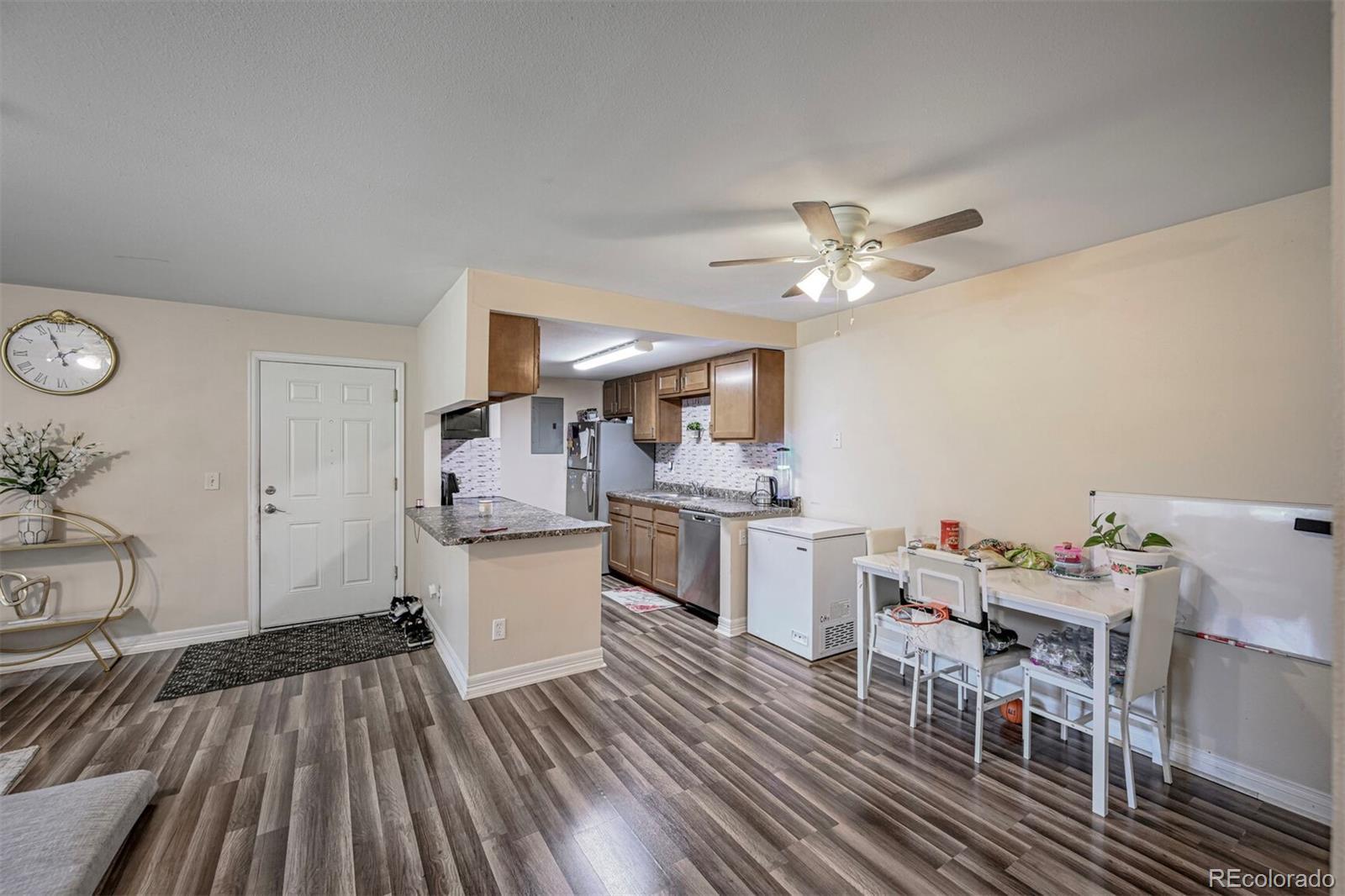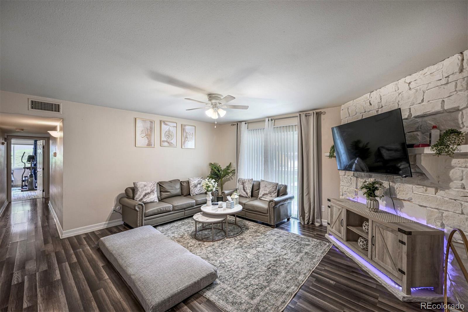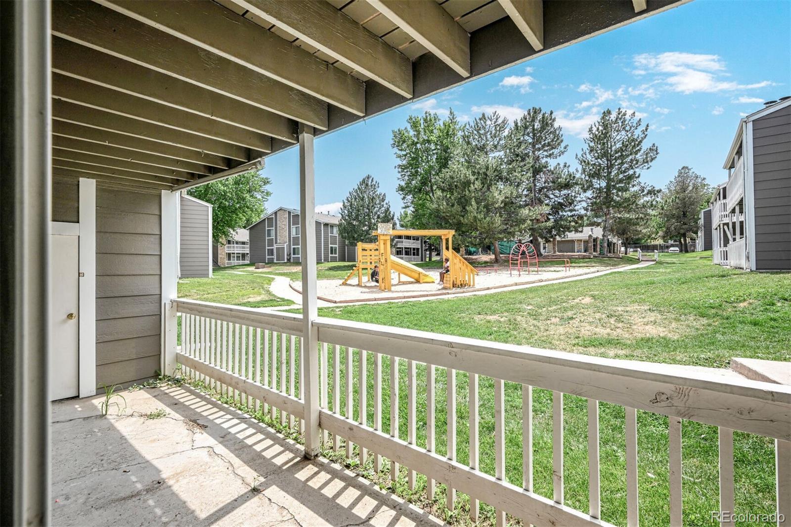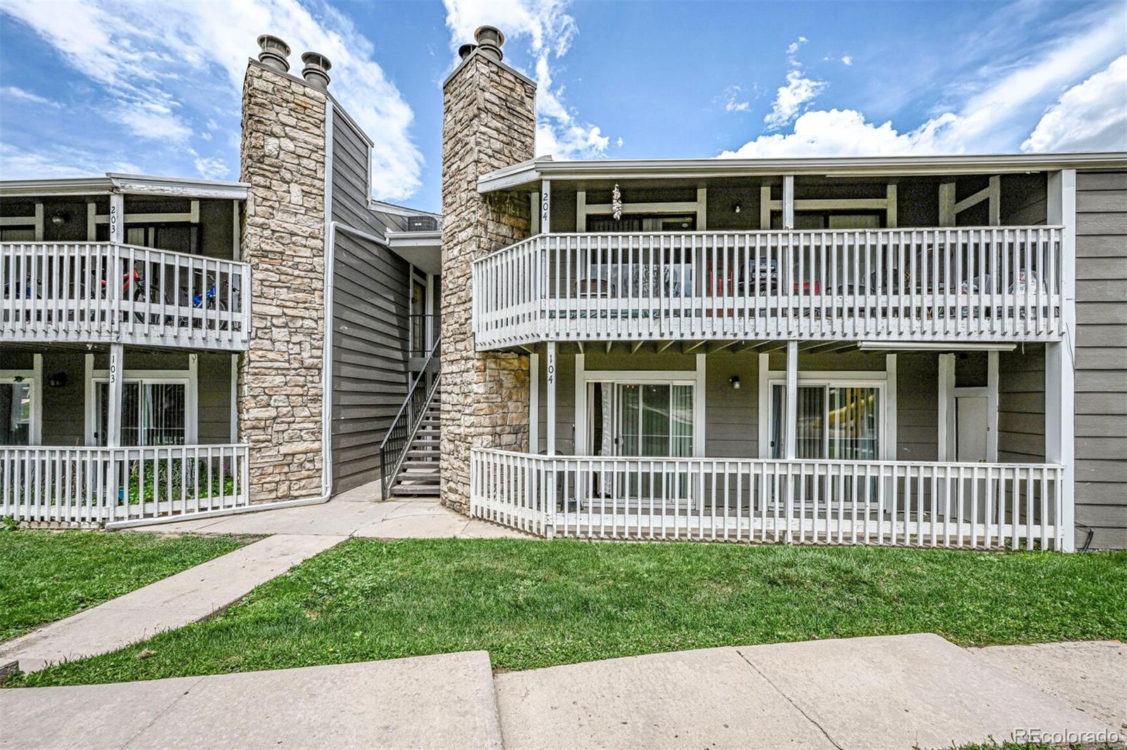 Back on the market due to buyer's financing terms! Move-in-ready, end unit, main floor condo! NO stairs to climb. Situated in a family-friendly neighborhood with 1,177 square feet, three bedrooms and two baths. Floors are laminate throughout. All kitchen appliances including washer and dryer. Spacious kitchen includes all appliances, dishwasher, disposal, microwave, oven, range, refrigerator, and plenty of counter space, including a bar-height counter where guests can sit. There is a dedicated dining area next to the kitchen, with a ceiling fan and light above. Beautiful stone wood-burning fireplace in living room provides a cozy atmosphere during winter months. Wood mantle above the fireplace provides a nice area for photos or other treasures. The master bedroom has large closets, a full bath which has been recently remodeled, and tile floors. The master bedroom comes with a sliding glass door that opens out to the porch. The second and third bedrooms also have tile floors, large closets, and large windows that let in a lot of light. Nice, neutral paint throughout the condo gives you a blank canvas for decorating. Kitchen cabinets are oak and countertops are light gray. The condo also includes a fenced porch overlooking the courtyard and playground. Overall, this is a simple, clean property. Centrally located to shopping, restaurants, and DIA.
