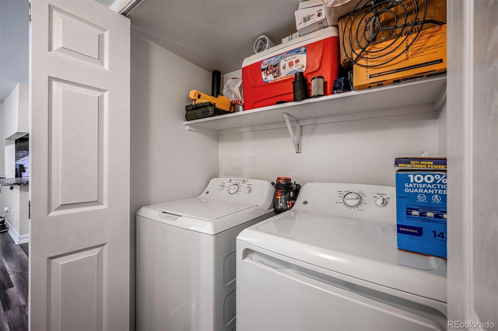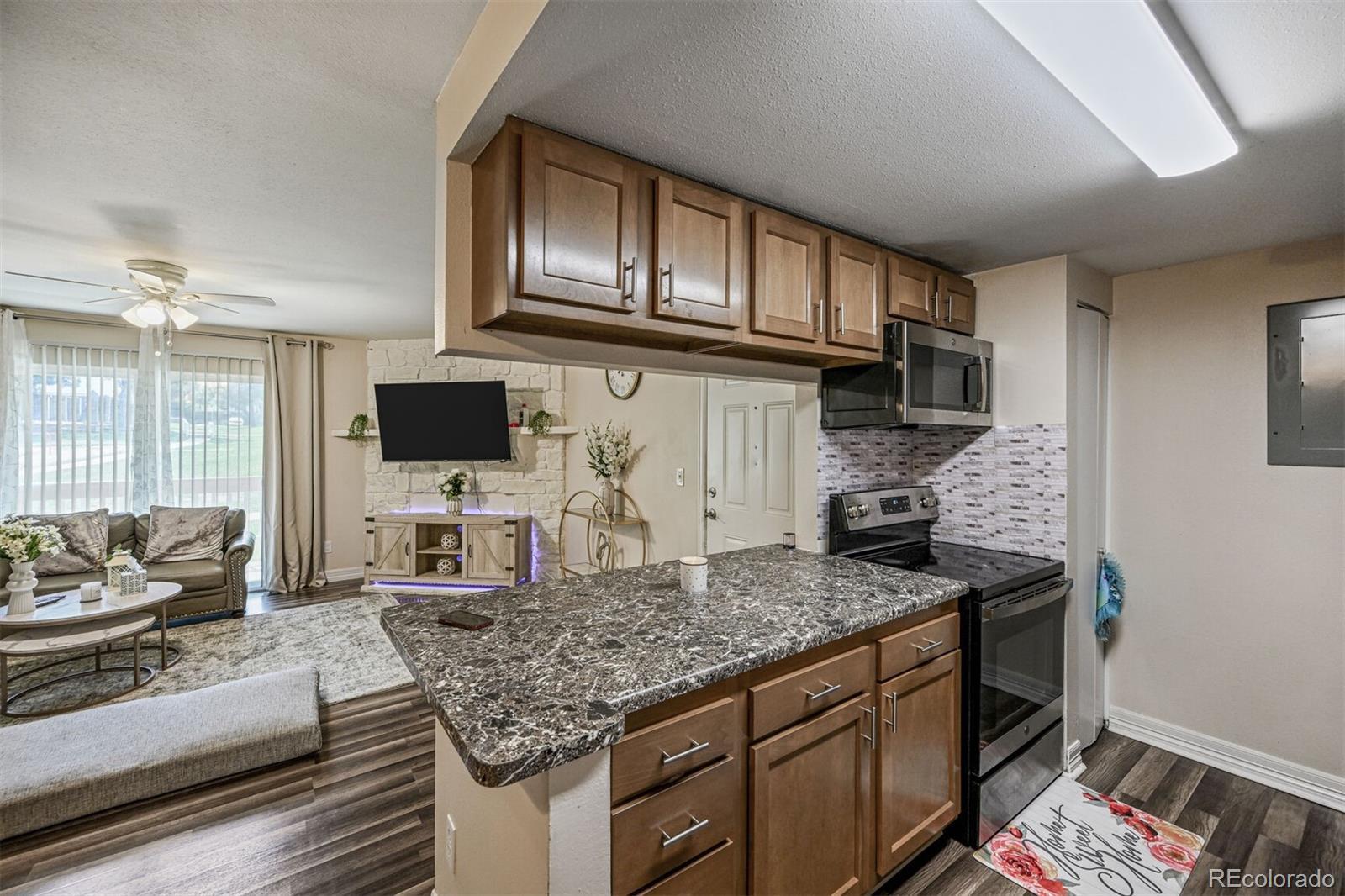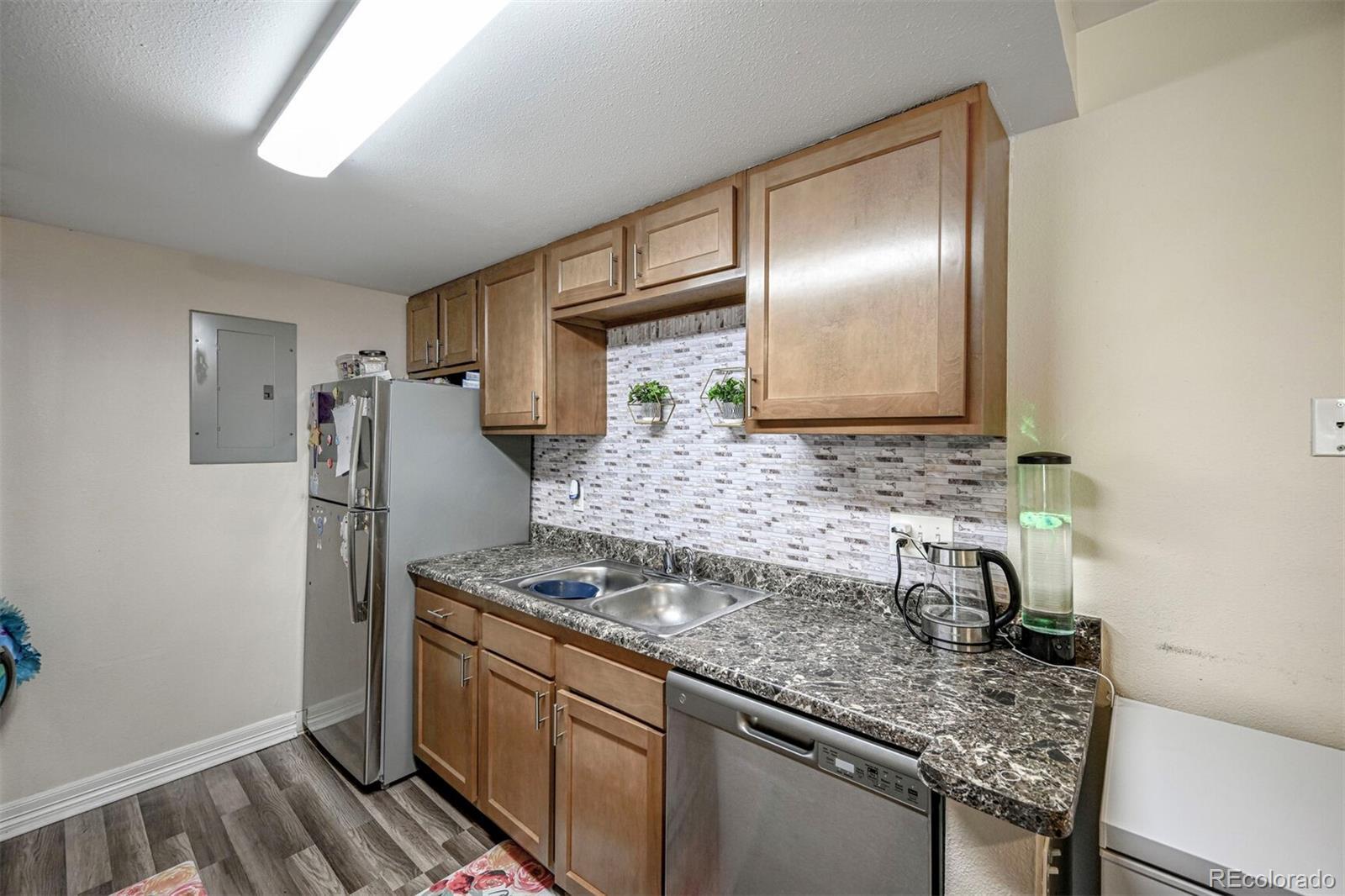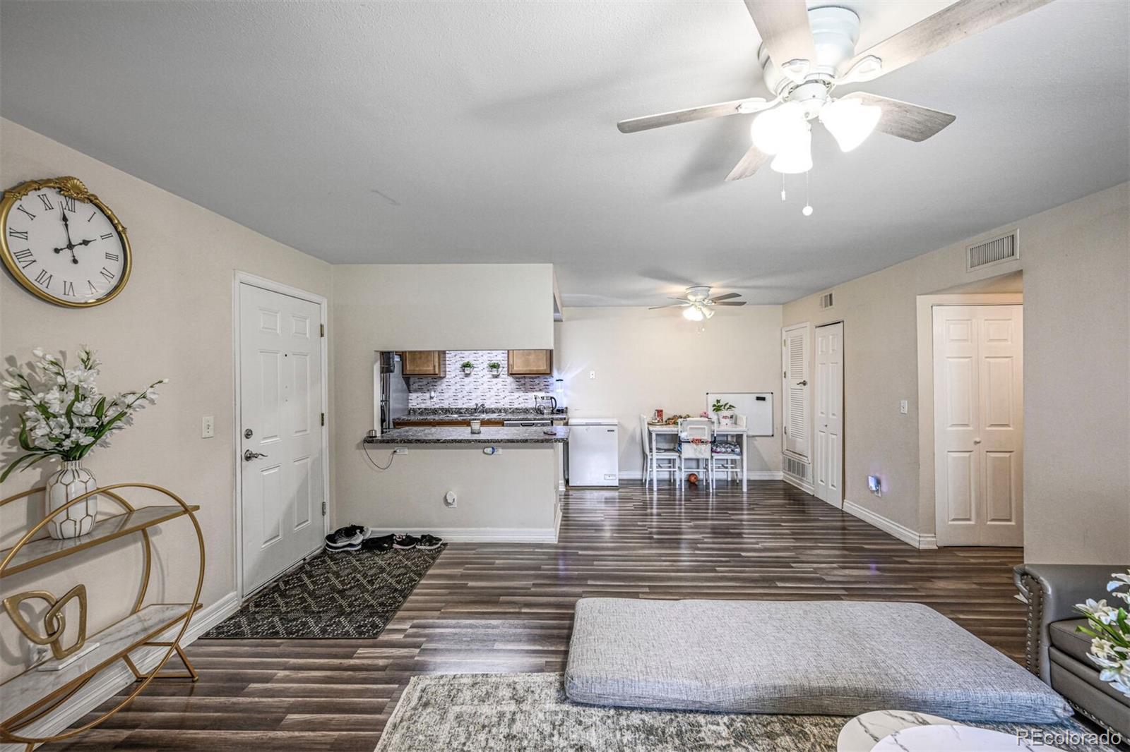 Back on the market due to buyer's financing terms! Move-in-ready, end unit, main floor condo! NO stairs to climb. Situated in a family-friendly neighborhood with 1,177 square feet, three bedrooms and two baths. Floors are laminate throughout. All kitchen appliances including washer and dryer. Spacious kitchen includes all appliances, dishwasher, disposal, microwave, oven, range, refrigerator, and plenty of counter space, including a bar-height counter where guests can sit. There is a dedicated dining area next to the kitchen, with a ceiling fan and light above. Beautiful stone wood-burning fireplace in living room provides a cozy atmosphere during winter months. Wood mantle above the fireplace provides a nice area for photos or other treasures. The master bedroom has large closets, a full bath which has been recently remodeled, and tile floors. The master bedroom comes with a sliding glass door that opens out to the porch. The second and third bedrooms also have tile floors, large closets, and large windows that let in a lot of light. Nice, neutral paint throughout the condo gives you a blank canvas for decorating. Kitchen cabinets are oak and countertops are light gray. The condo also includes a fenced porch overlooking the courtyard and playground. Overall, this is a simple, clean property. Centrally located to shopping, restaurants, and DIA.