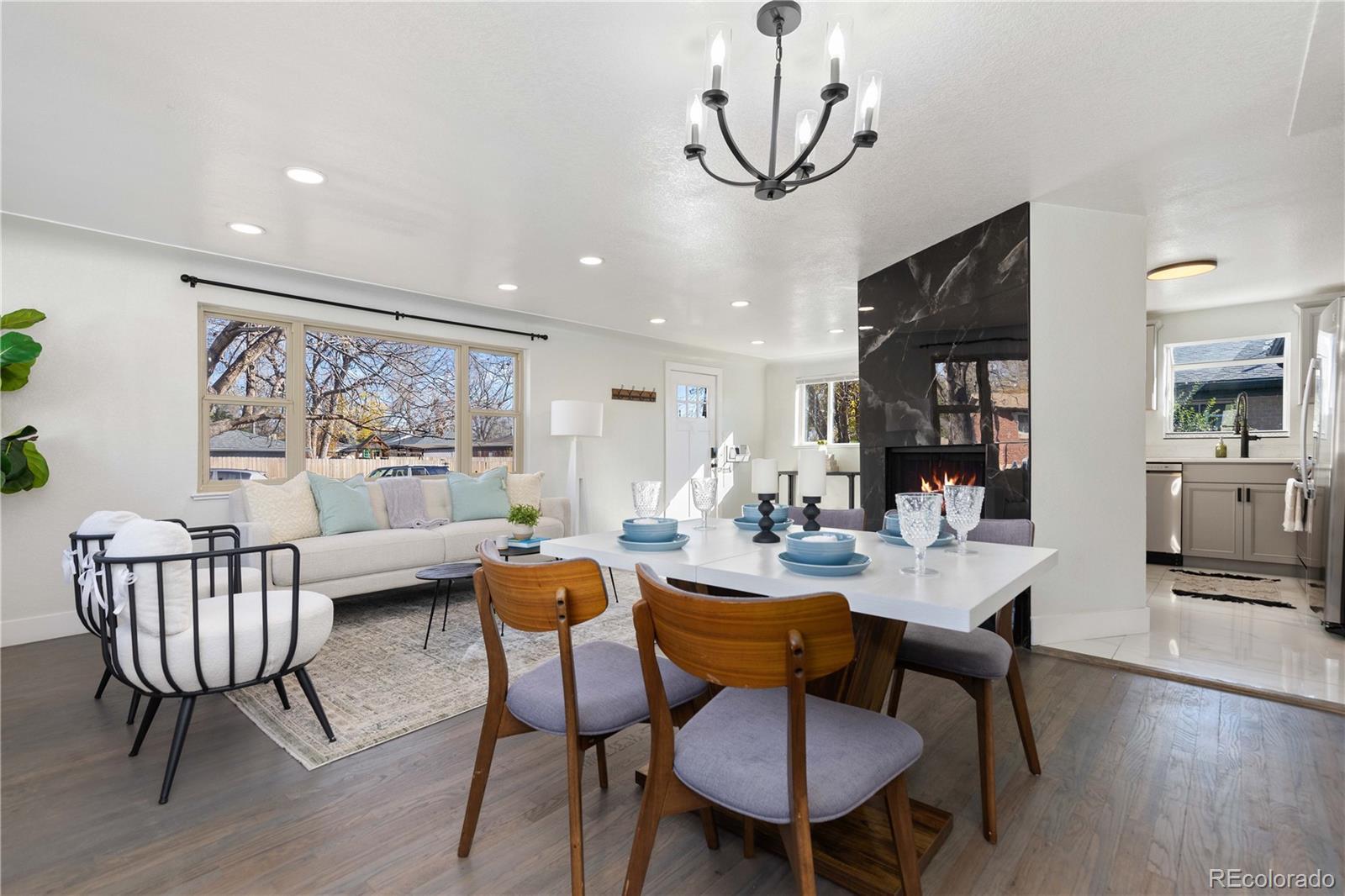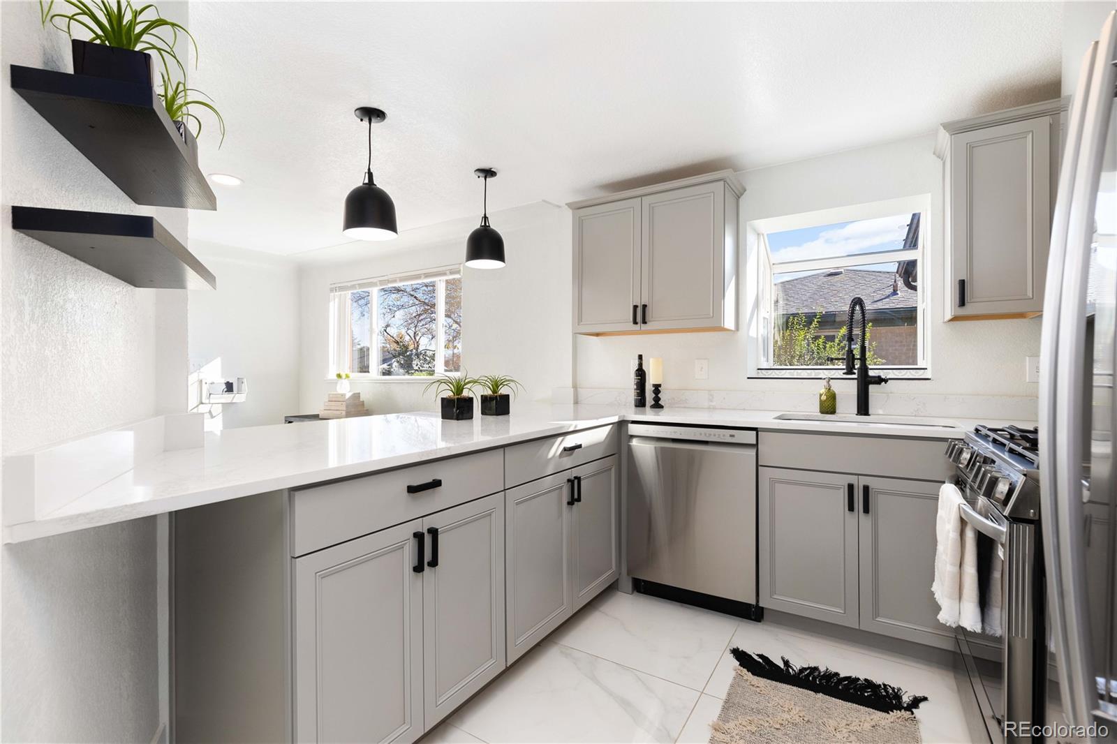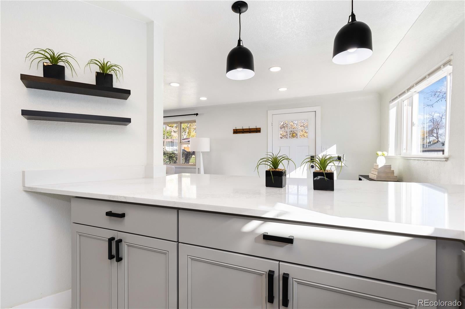 Step into style and comfort at this beautifully reimagined mid-century brick home in Westminster’s sought-after 80030 neighborhood. From the moment you enter, the open living and dining space feels warm and welcoming, highlighted by a striking floor-to-ceiling fireplace and neutral hardwood floors. The remodeled kitchen is a showstopper with sleek quartz countertops, stainless steel appliances, a breakfast bar, and modern tile floors that pull the space together. Every detail feels intentional, from the clean lines to the cohesive, modern design. Two comfortable bedrooms provide restful retreats, while the luxurious bathroom impresses with a step-in shower and bold gold accents. A separate laundry room with full-size washer and dryer adds everyday convenience. Comfort comes easy with new central air installed last summer, plus a newer furnace, water heater, and appliances—all added within the past two years for peace of mind and efficiency. Outside, the spacious lot with mature trees offers an ideal setting for relaxing, entertaining, or future outdoor projects. The attached one-car garage and long driveway provide plenty of parking. Perfectly situated between Denver and Boulder, this home delivers easy access to major routes, local parks, and neighborhood favorites. Stylish, move-in ready, and ready to welcome you home!