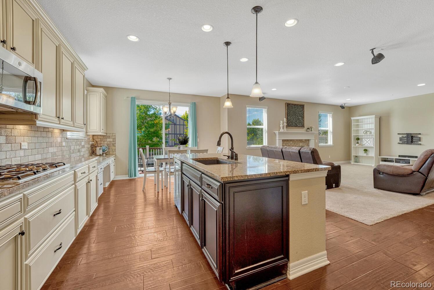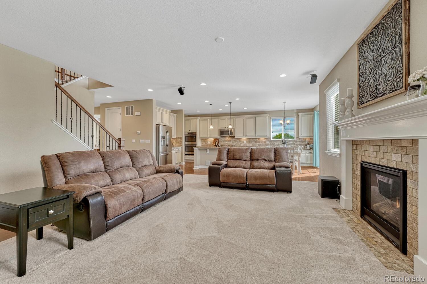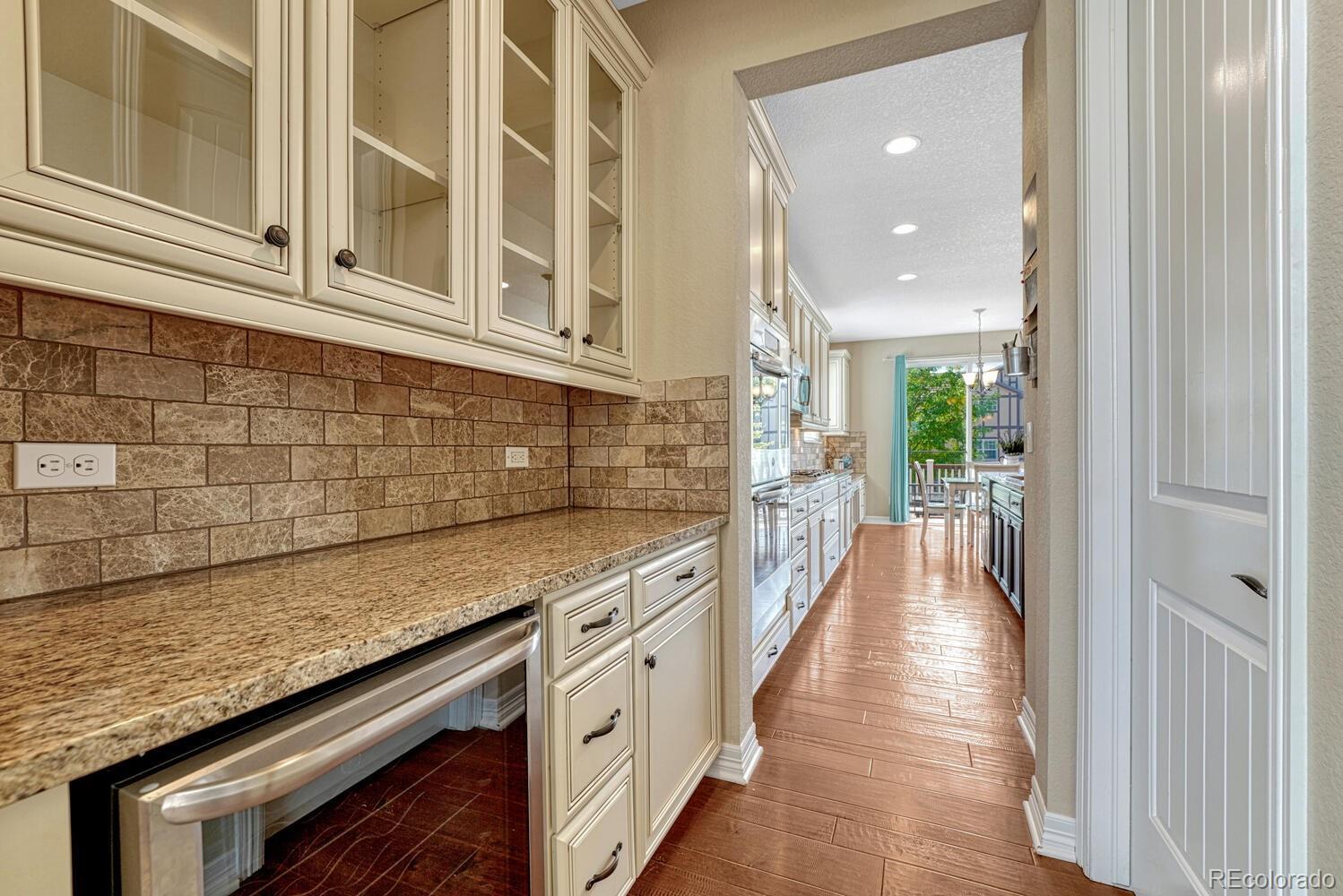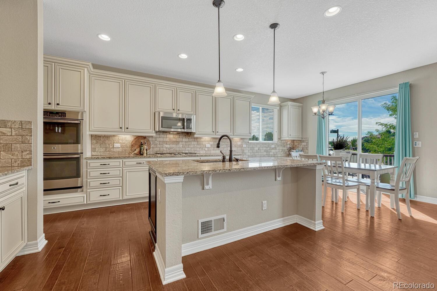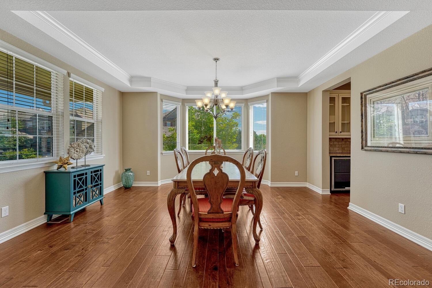 Step inside this beautifully updated 5-bed, 5-bath Richmond home on a corner lot in Meridian Village that is designed for both everyday comfort and memorable entertaining. The open main floor features a chef's kitchen with granite counters, double ovens, walk-in pantry, and a generous island that flows into the family room with a cozy fireplace for those snowy, Colorado evenings. A formal dining room and butler's pantry with wine cooler make hosting effortless. Upstairs, the spacious primary suite is a true retreat with coffered ceilings, a luxurious 5-piece bath, and large walk-in closet. Three additional bedrooms, including one with an ensuite bath, plus a bright loft offer flexibility for work or play. The finished basement extends your living space with a game room, gym, fifth bedroom, and full bath perfect for movie nights or guests. KEGINATOR AND BAR are INCLUDED! Enjoy Colorado living outdoors on the expansive deck overlooking mature landscaping, complete with a hot tub and. Recent updates include new carpet, fresh paint. The landscaping has been refreshed, as well. A 3-car garage with storage racks and bike pulleys adds practicality to this move-in-ready home. Located within walking distance of neighborhood parks and trails, with easy access to E-470, I-25, and downtown Parker, this home blends luxury, location, and lifestyle in one perfect package.