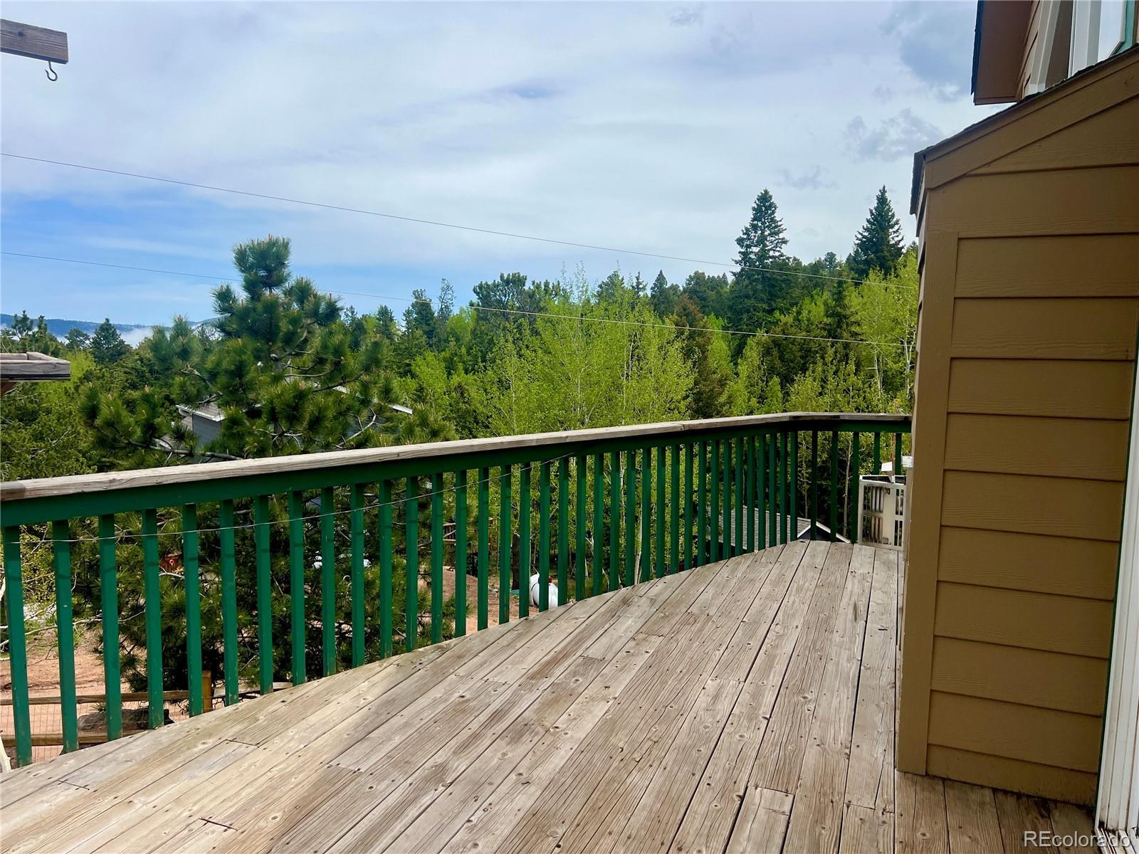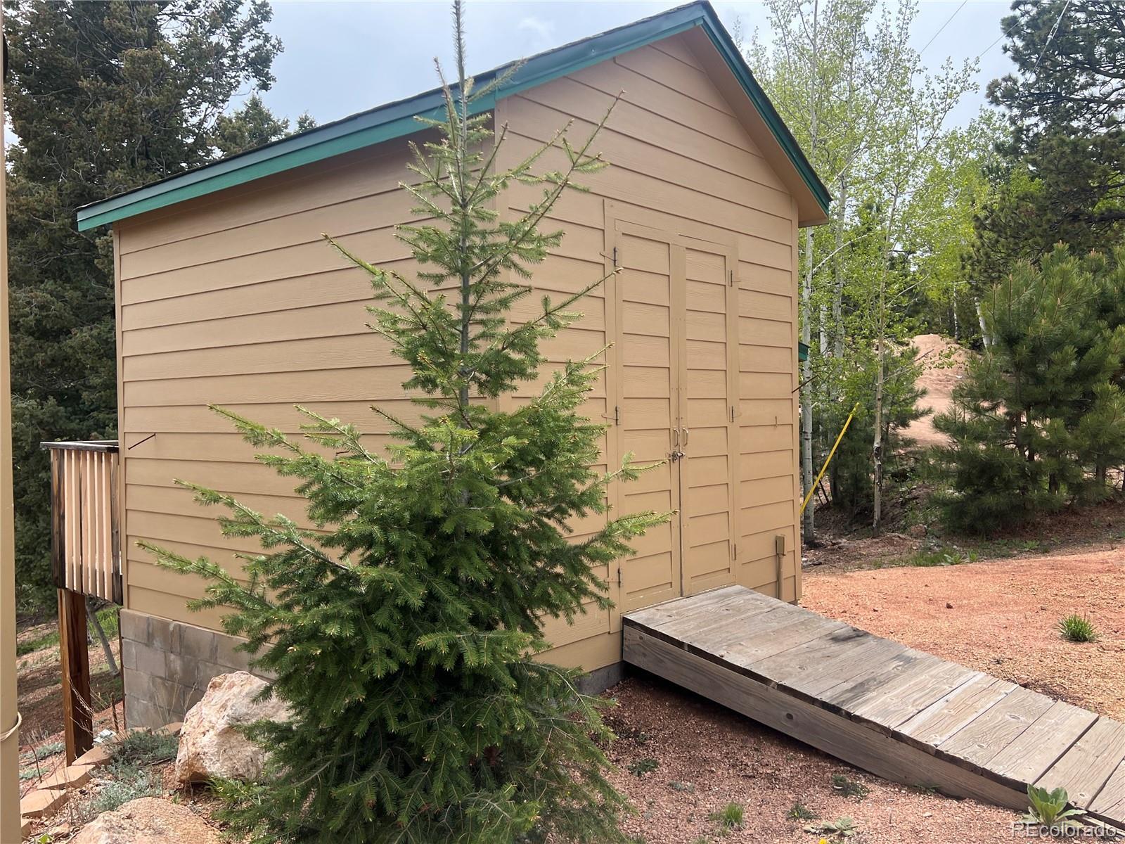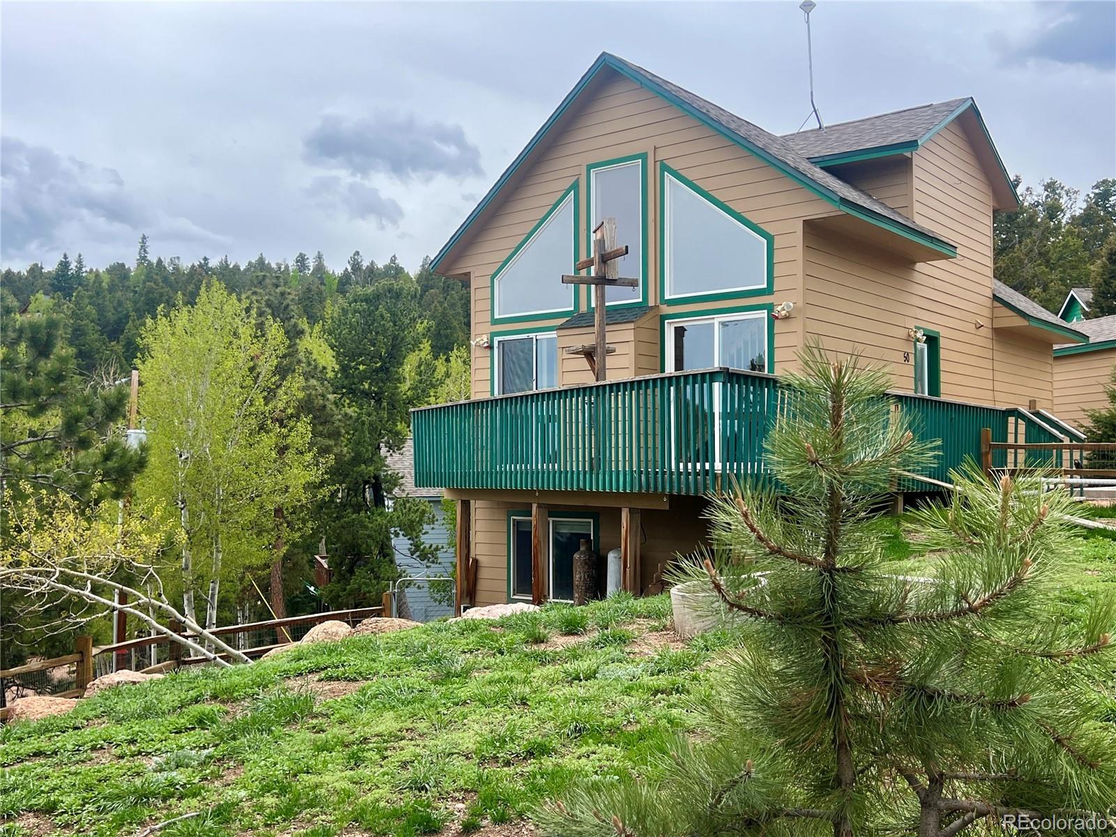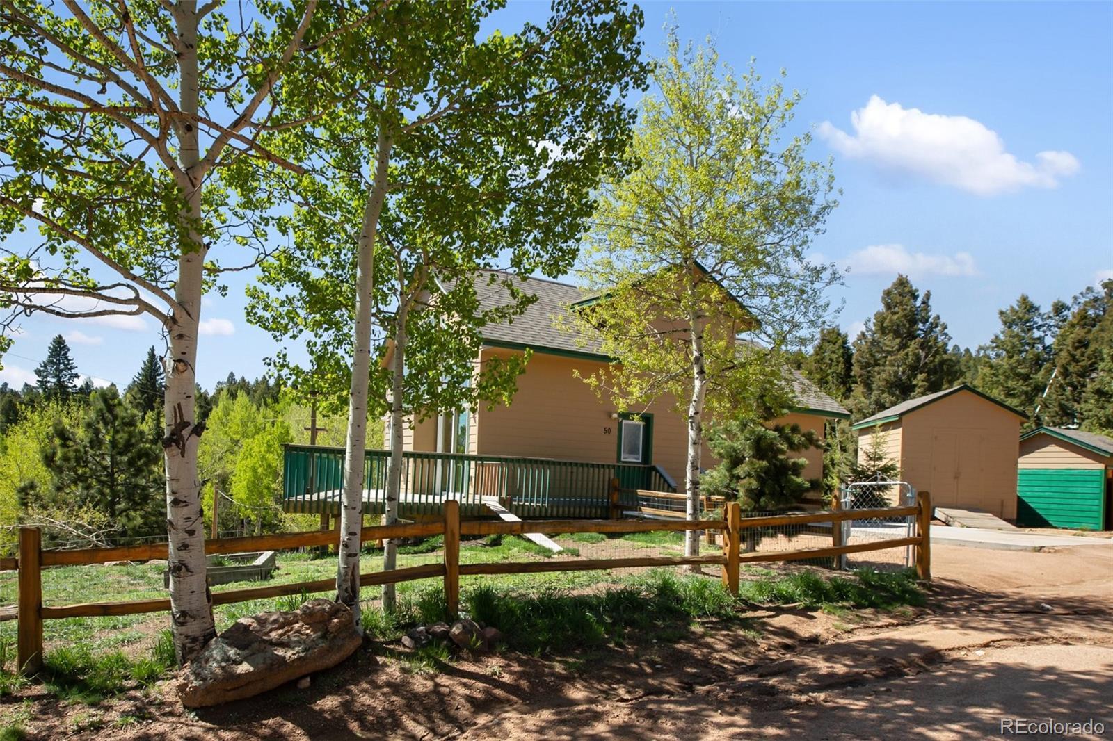 Welcome to this darling, mountain chalet located in the outskirts of Woodland Park! Upon entering the home, you walk into the living room with soaring pine ceilings and windows that allow year-round passive solar light to warm your home. There is a beautiful stone, propane fireplace that provides even more warmth and ambiance. Two sliders in the living room allow you to walk out to the inviting deck where you feel and see the mountain beauty. The area off of the living room and deck is fenced for pets/children. The kitchen has gorgeous solid hickory cabinets, an electric stove, a pantry, plus a cozy dining area! The generous sized primary bedroom is conveniently located on the main floor with an attached jack and jill 3/4 bathroom. Head upstairs to the loft-style bedroom which has a ceiling fan and a closet. On the lower level is a generous sized bedroom, a family room that is a walk out, along with a 3/4 jack and jill bath. There is a sink and refrigerator on the lower level for convenience. You could rent the lower level out for extra income! The storage shed has electric and a block foundation lower level for even more storage! The front yard is all fenced in and is a great place for children and dogs. The exterior is a fire resistant wood grain siding. Located within 30 minutes to Colorado Springs and 2 hours to great skiing. Surrounded by local attractions like world class fishing, hiking, Pike's Peak and more! Abundant wildlife can be seen year-round - elk, bear, deer, turkeys and even some moose. This home would make an excellent full-time residence, second home or income property. Vacation rentals are allowed here. There is incredible hiking located off of nearby Edlowe Road. The voluntary HOA fees cover the road maintenance. All new carpeting has been installed and new luxury vinyl in the bathrooms!