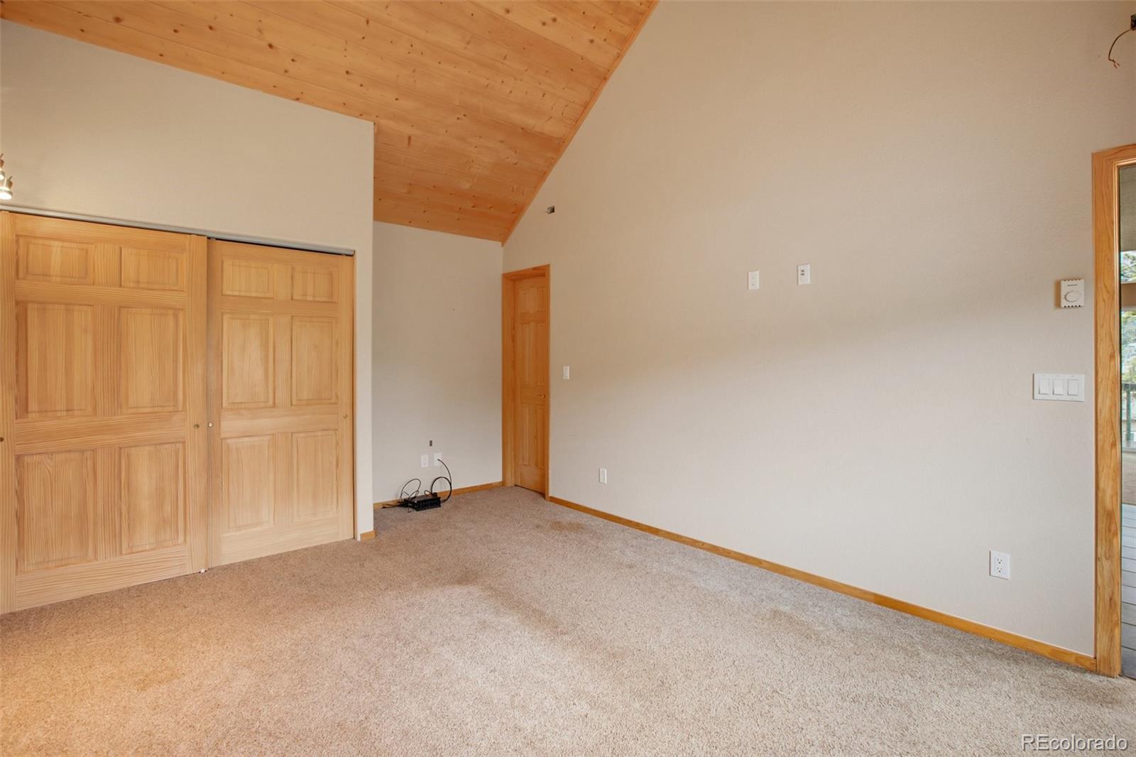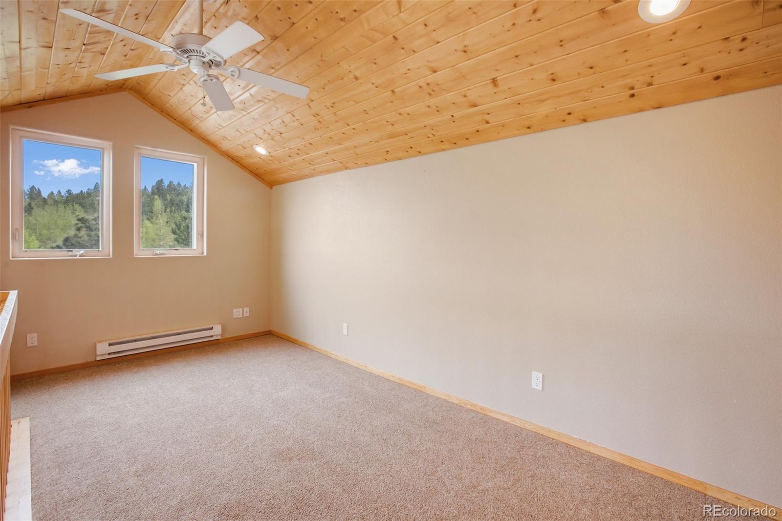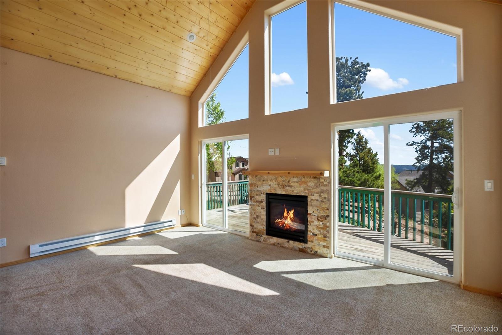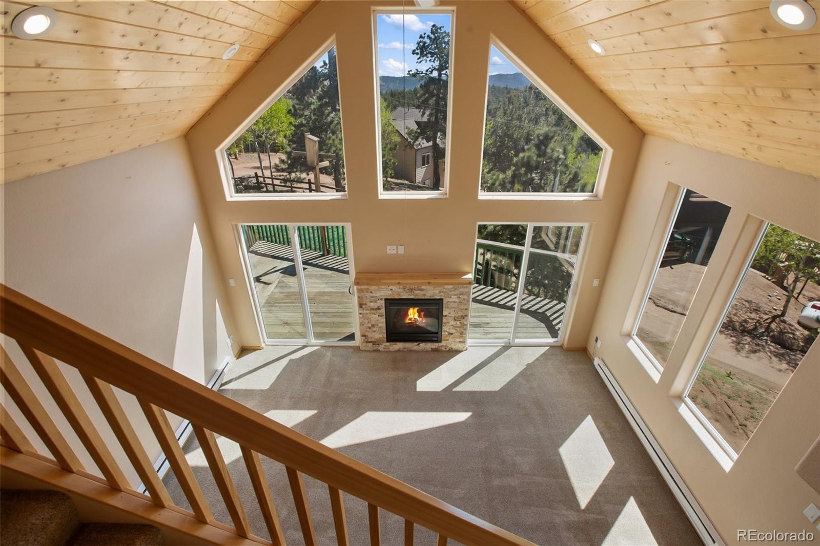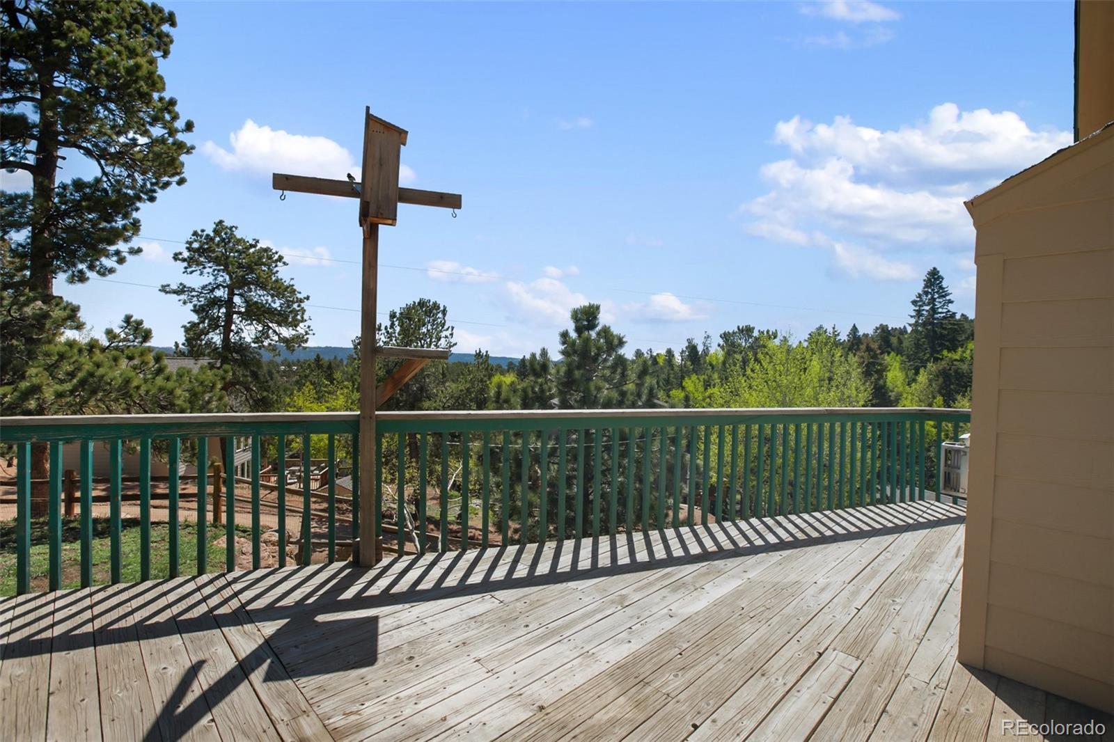 Welcome to this darling, mountain chalet located in the outskirts of Woodland Park! Upon entering the home, you walk into the living room with soaring pine ceilings and windows that allow year-round passive solar light to warm your home. There is a beautiful stone, propane fireplace that provides even more warmth and ambiance. Two sliders in the living room allow you to walk out to the inviting deck where you feel and see the mountain beauty. The area off of the living room and deck is fenced for pets/children. The kitchen has gorgeous solid hickory cabinets, an electric stove, a pantry, plus a cozy dining area! The generous sized primary bedroom is conveniently located on the main floor with an attached jack and jill 3/4 bathroom. Head upstairs to the loft-style bedroom which has a ceiling fan and a closet. On the lower level is a generous sized bedroom, a family room that is a walk out, along with a 3/4 jack and jill bath. There is a sink and refrigerator on the lower level for convenience. You could rent the lower level out for extra income! The storage shed has electric and a block foundation lower level for even more storage! The front yard is all fenced in and is a great place for children and dogs. The exterior is a fire resistant wood grain siding. Located within 30 minutes to Colorado Springs and 2 hours to great skiing. Surrounded by local attractions like world class fishing, hiking, Pike's Peak and more! Abundant wildlife can be seen year-round - elk, bear, deer, turkeys and even some moose. This home would make an excellent full-time residence, second home or income property. Vacation rentals are allowed here. There is incredible hiking located off of nearby Edlowe Road. The voluntary HOA fees cover the road maintenance. All new carpeting has been installed and new luxury vinyl in the bathrooms!