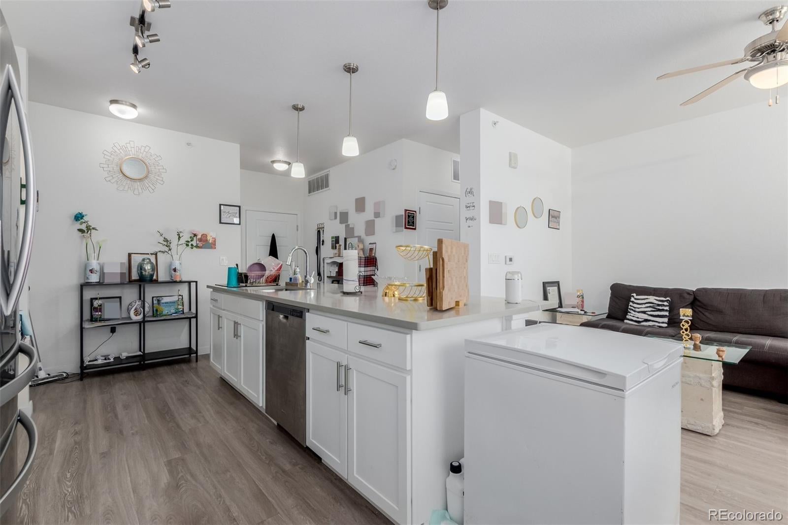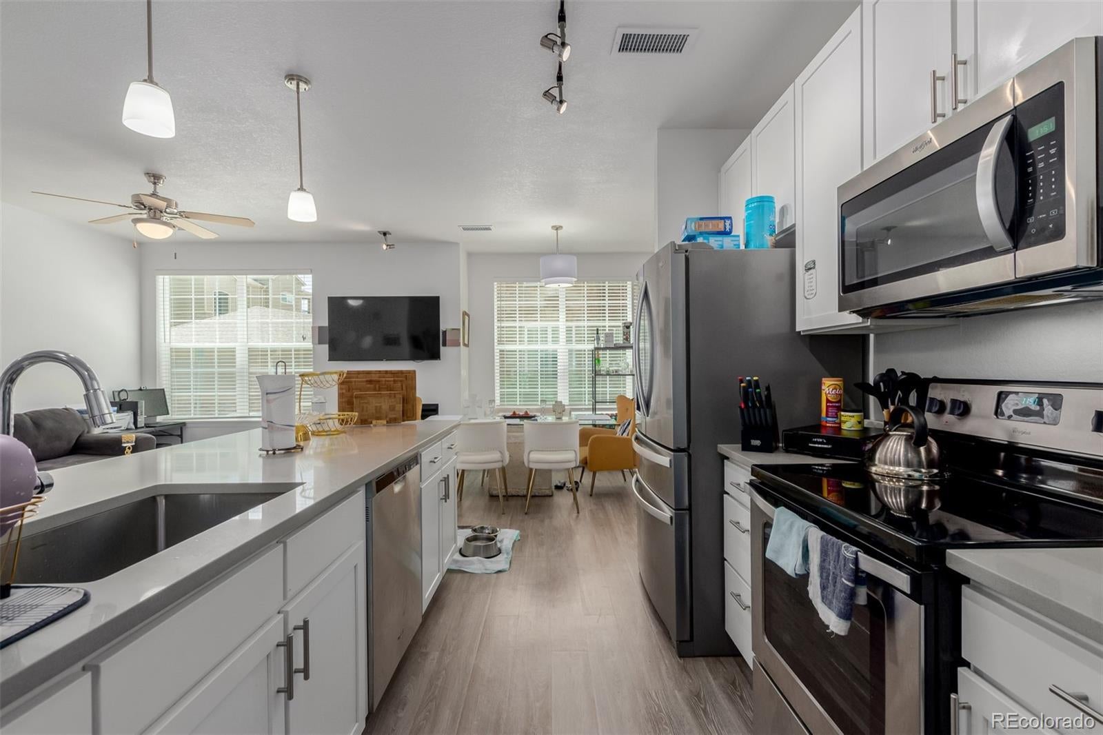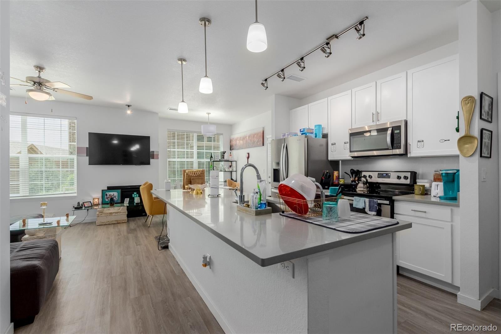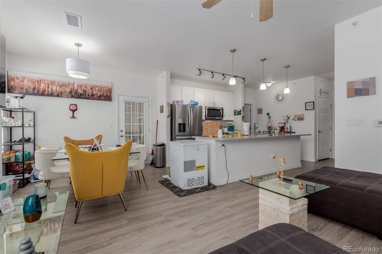 Best Deal on a 3-bedroom unit at Prairie Walk on Cherry Creek! This charming 3-bed, 2-bath ground-floor condo unit blends effortless style with everyday comfort in a layout designed for modern living. The inviting interior showcases abundant natural light, a neutral palette, 9-foot ceilings, chic light fixtures, and vinyl plank flooring throughout. If entertaining is on your mind, you'll love the desirable great room paired with a fireplace for chilly nights! The impeccable kitchen makes a striking first impression, showcasing sleek matching SS appliances, gray quartz counters, white shaker cabinetry, and a large prep island with a breakfast bar. Retreat to the primary bedroom to find a walk-in closet and an ensuite with a sit-down shower. Two secondary bedrooms occupy their own wing, sharing a full bath that's easily accessible and ideal for guests, home office setups, or creative spaces. Sip your morning coffee or unwind with evening drinks on your private covered patio! A detached one-car garage offers added convenience, located just a short stroll away. Take advantage of the resort-style Community amenities, including a clubhouse, fitness center, a sparkling outdoor pool, a hot tub, outdoor grills, and a park with playground equipment. Enjoy easy access to the iconic Cherry Creek Trail and quick connectivity to E-470! Downtown Parker is just minutes away, offering an array of dining, shopping, and entertainment options. Don't miss this opportunity!