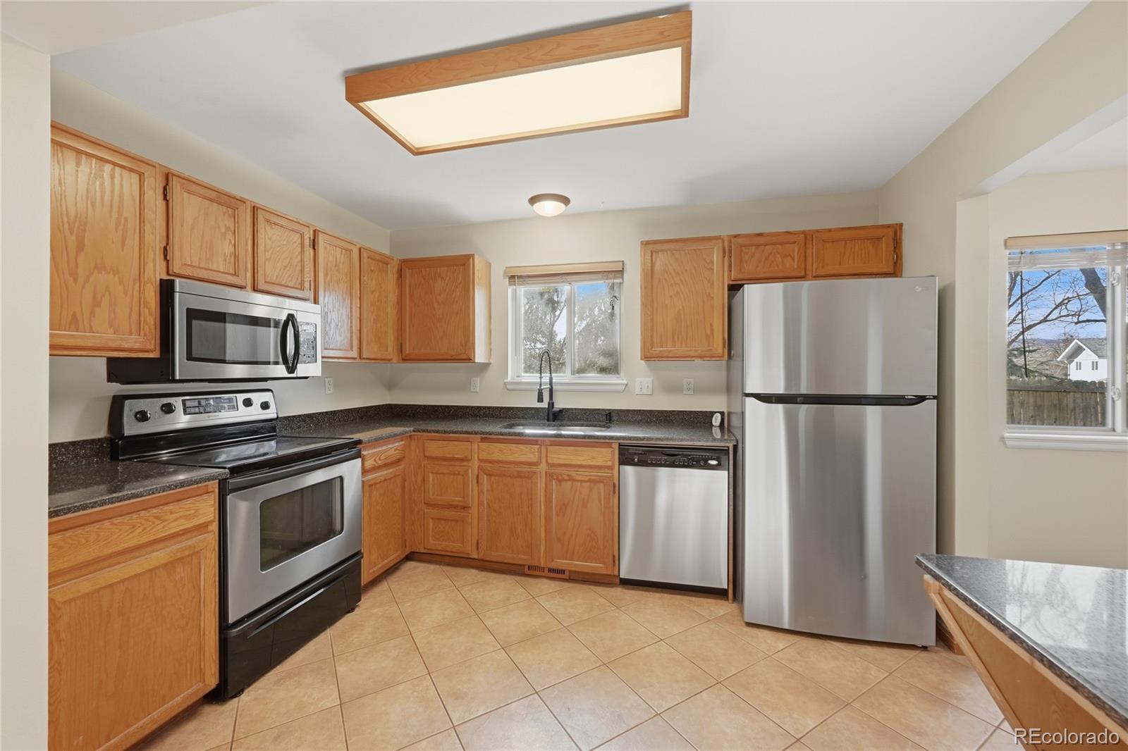 Beautifully updated two-story home nestled in a hidden, secluded enclave backing to open space! Fresh paint and carpet throughout. The main level features soaring vaulted ceilings, a skylight that fills the space with natural light, and a bright, open layout with a spacious kitchen complete with generous cabinetry, slab granite countertops, stainless steel appliances, tile flooring, and a large eat-in area plus a formal dining room and a large, vaulted family room with a cozy fireplace. Upstairs, you’ll find three generously sized bedrooms, including a huge primary suite with its own private bath. The finished basement offers even more living space with a large secondary family/rec room, a full bath, and a bonus room that easily serves as a 4th bedroom. Outside, enjoy a private fenced yard that backs to open space featuring a flagstone patio area and raised garden beds, perfect for BBQs, gardening, and backyard fun! An attached 2-car garage adds convenience, and the location is unbeatable. Walk to parks, trails, restaurants, shopping and Apex Center. Easy access to Golden, Downtown, Boulder, Standley Lake. Bonus: Private gate access to Gibbs Open Space and the Ralston Creek Trail!