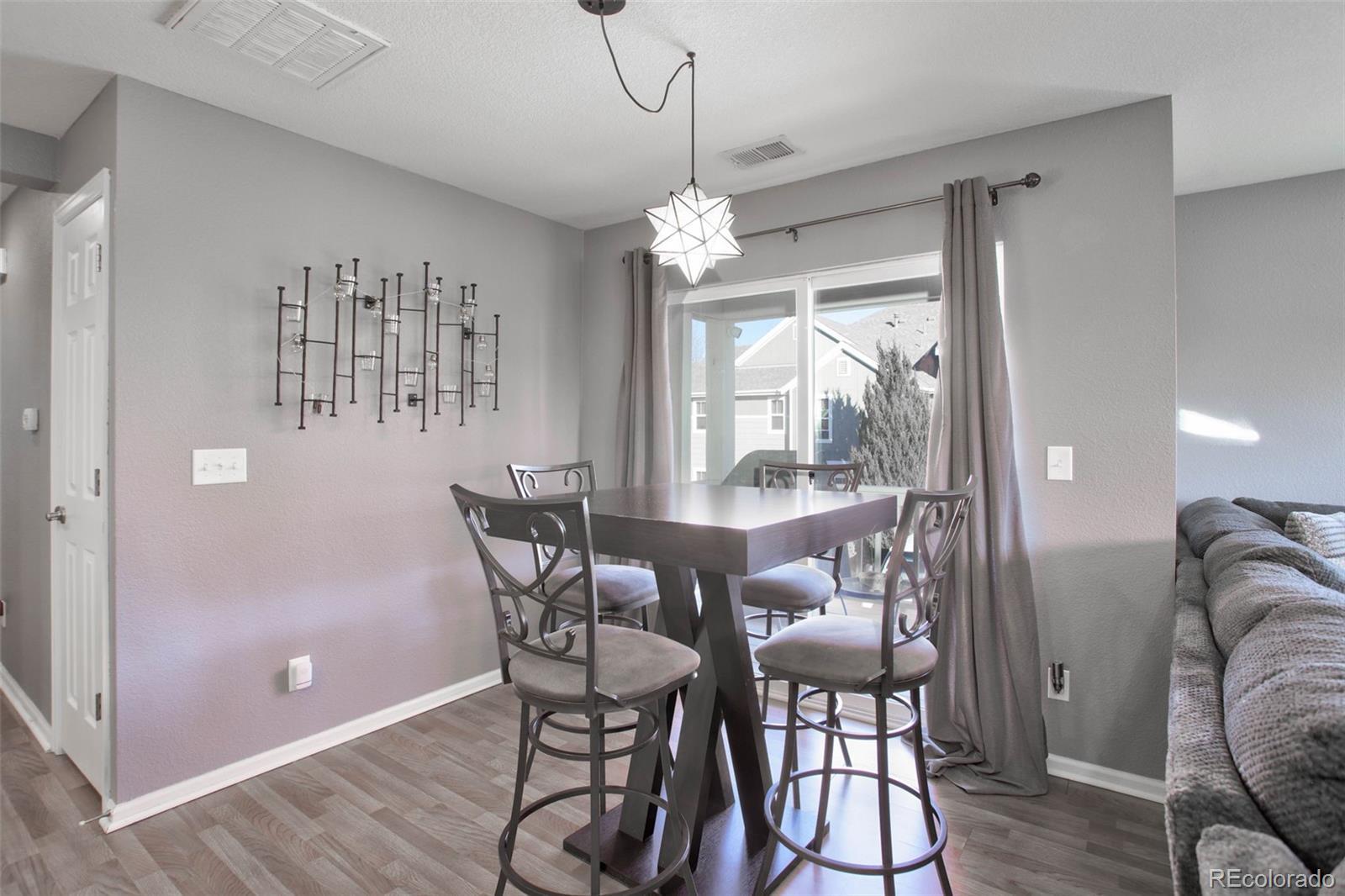 Welcome to this inviting two-bedroom, two full bathroom corner condo with an attached garage and all the living space on one convenient level. The spacious kitchen is a culinary haven, featuring a breakfast bar with pendant lighting, stainless steel appliances, cabinets with pull-out shelving and an open layout that seamlessly connects to the dining room and living room. Go out onto the balcony from the dining area to enjoy beautiful Colorado and get some fresh air. The primary bedroom is a retreat with ensuite bath and a spacious walk-in closet. An additional bedroom and full bath provide flexibility and convenience. Washer and dryer are included. Located in a fantastic spot with easy access to Denver, DIA, shopping, dining, parks and more, this home offers a lifestyle of convenience and comfort. Plus, enjoy peace of mind with a one-year home warranty included.