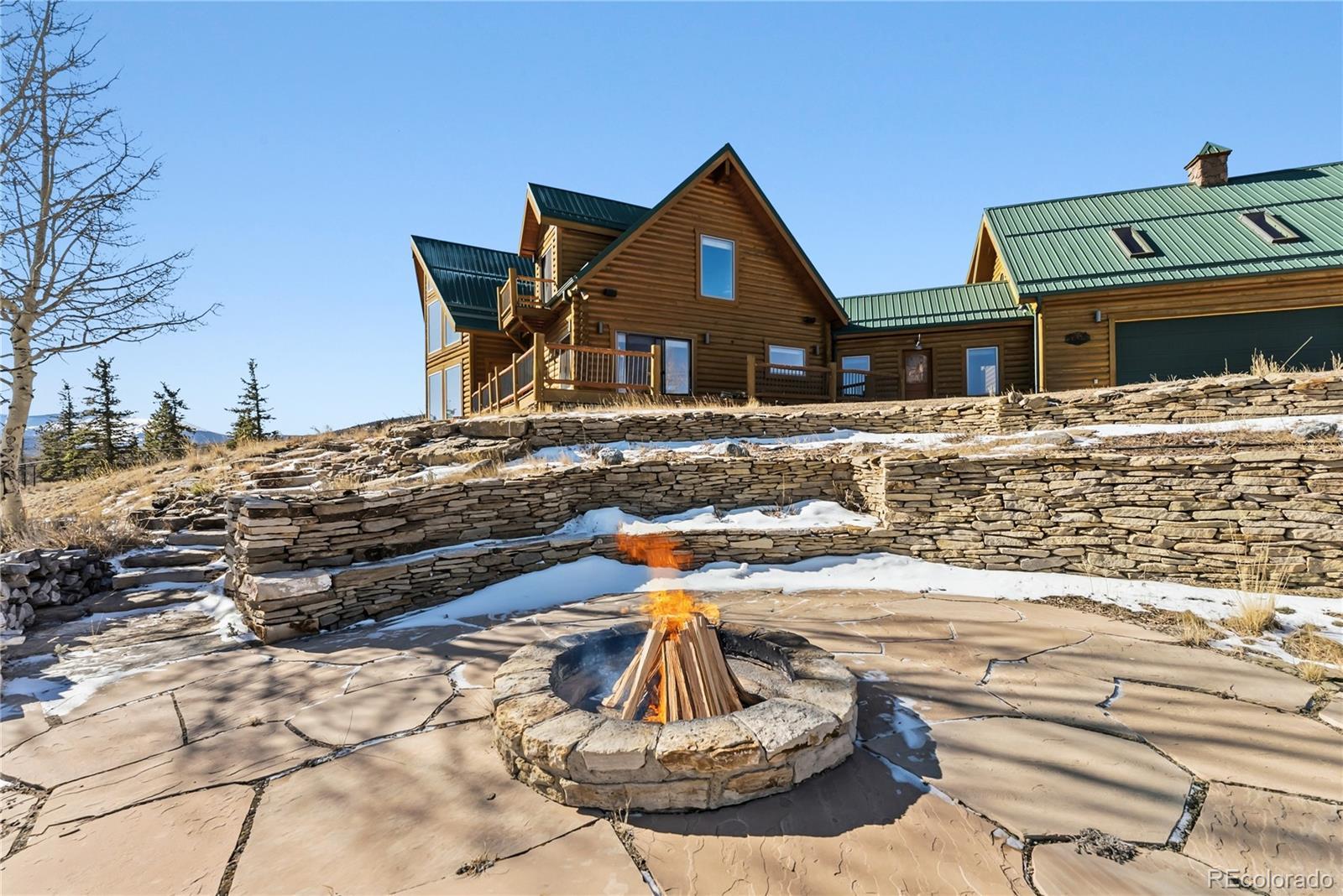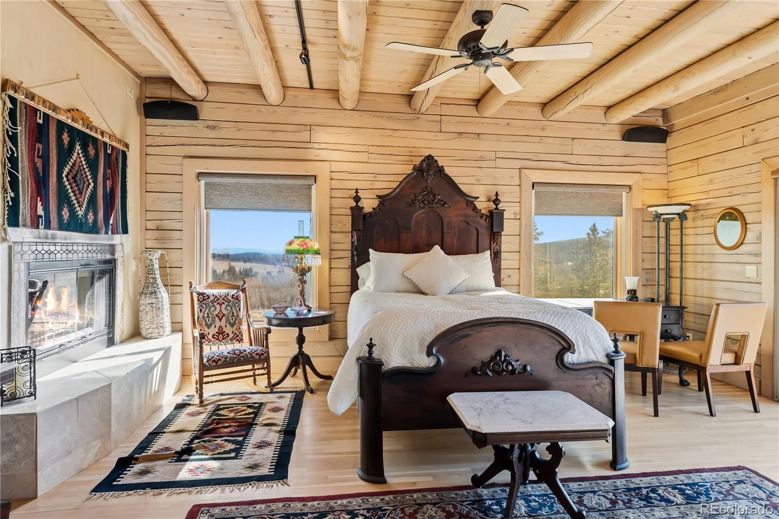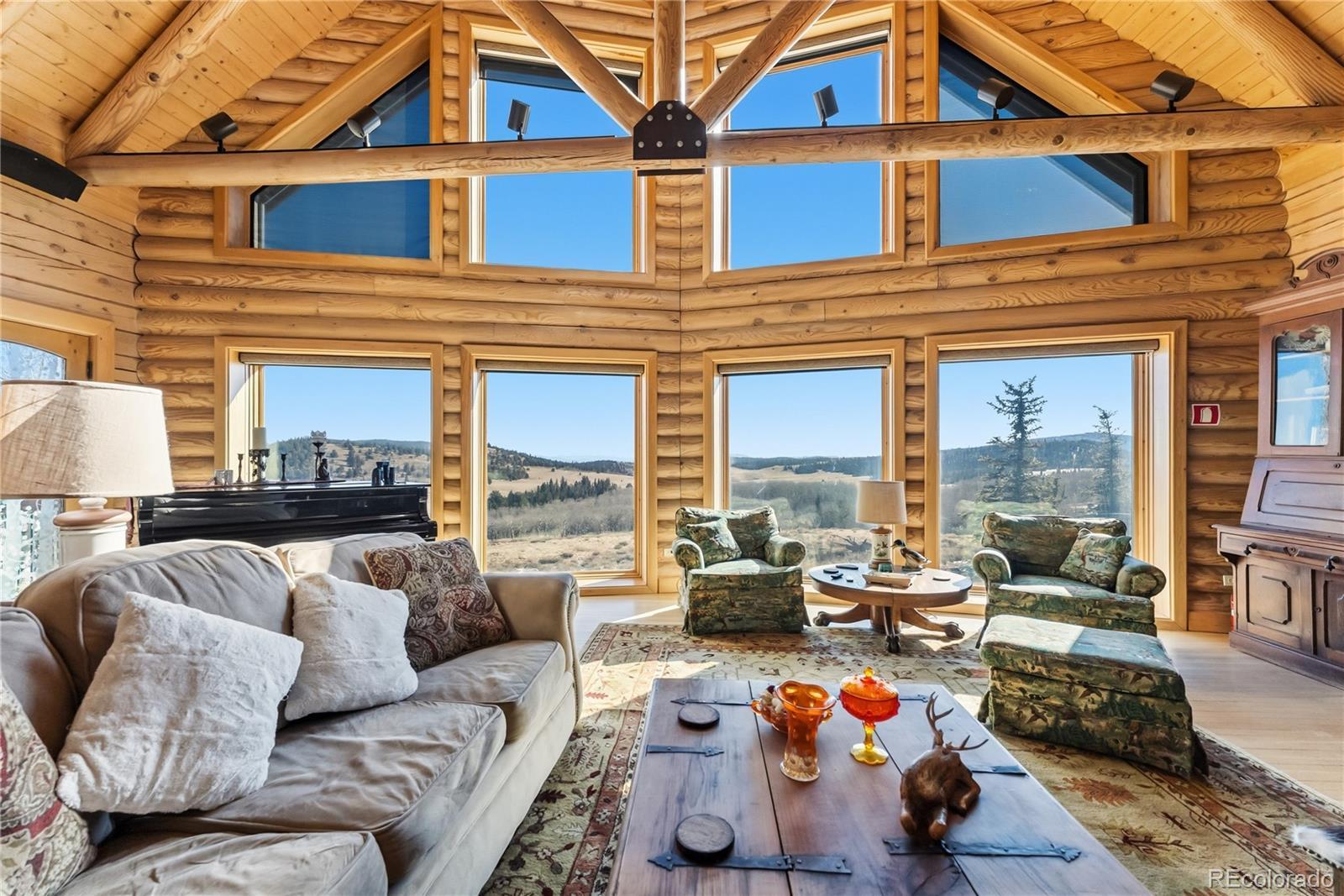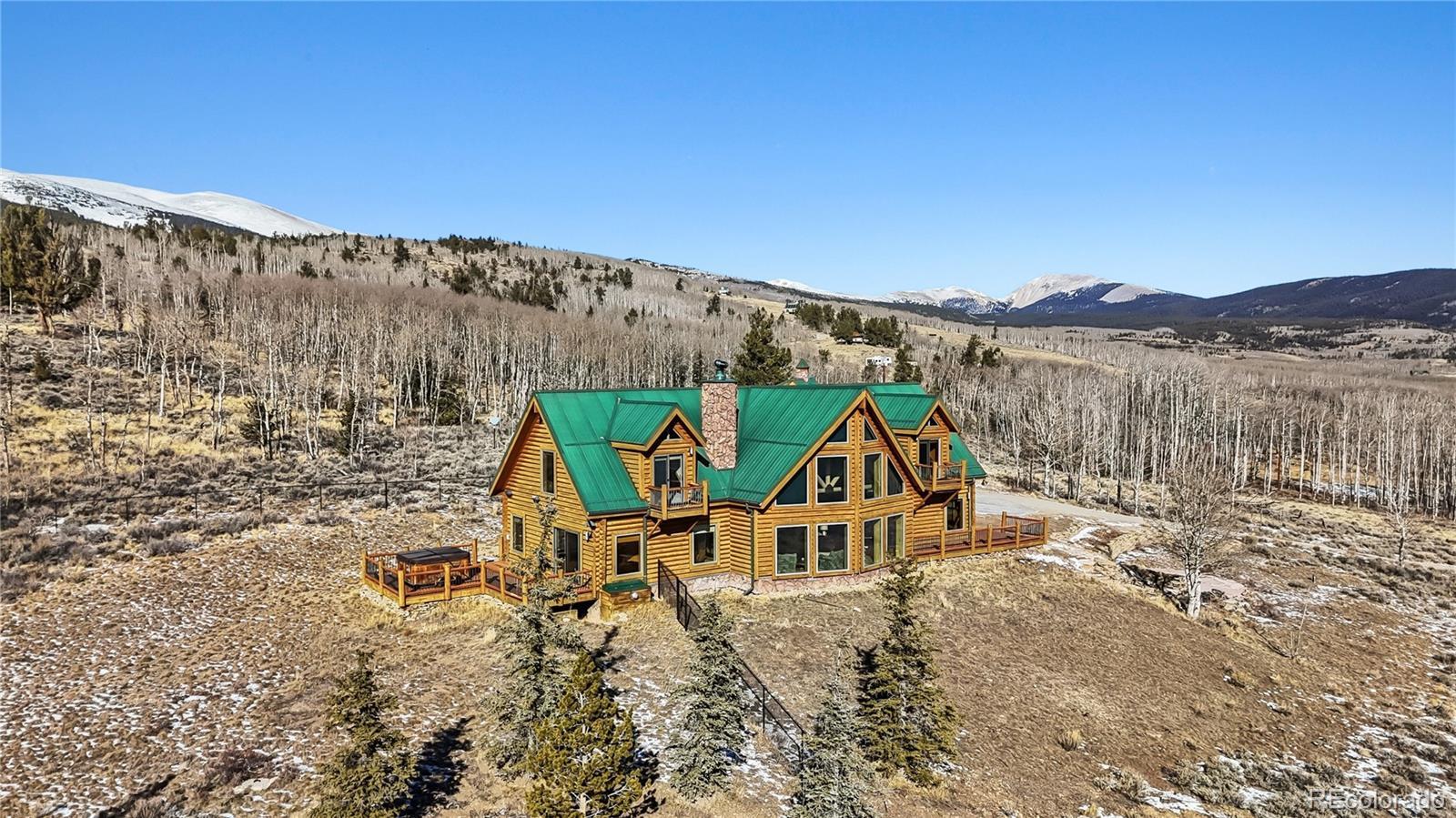 Step through the welcoming gate and venture down a winding road framed by elegant Aspen trees that dance with the mountain breeze. The path leads to an enchanting log home nestled among the awe-inspiring and unobstructed views of Pikes Peak, Lamb Peak, Buffalo Peak, and the Sheep Mountains. This rustic sanctuary feels perfectly in tune with nature, both powerful and peaceful, refined yet wild. Inside, the home offers a sense of comfort and grandeur. Four spacious bedrooms provide restful havens, while the primary suite on the main level epitomizes mountain luxury. A five-piece bath invites relaxation, and the generous walk-in closet ensures space to breathe. Ascend the stairs above the three-car garage and discover the newly created adaptable space. The gourmet kitchen welcomes both culinary creativity and companionship. Outfitted with Bosch and Sub-Zero appliances and framed by glistening Brazilian granite countertops, it’s a space where meals become memories. The living room’s stunning double-sided rock fireplace radiates warmth, while the vaulted tongue-and-groove ceilings and wide windows open the home to breathtaking natural views. The property itself feels alive. Aspens gleam in the sunlight, and a year-round stream brings music to the air. Moose, elk, and deer are frequent visitors—gentle reminders that this retreat coexists with the wild heart of the Rockies. Evenings settle into quiet magic: the glow of the fire pit, the shimmer of the stars overhead, or the soothing bubbles of the private hot tub. For those with furry companions, a fully enclosed acre offers both safety and adventure. Every detail—from the stained decks to the circular driveway—reflects thoughtful care and connection to the place. This mountain sanctuary offers not just a home, but an experience; not just comfort but belonging. There is something timeless about this space—an invitation to pause, to breathe, and to live where nature and serenity dwell in perfect harmony.