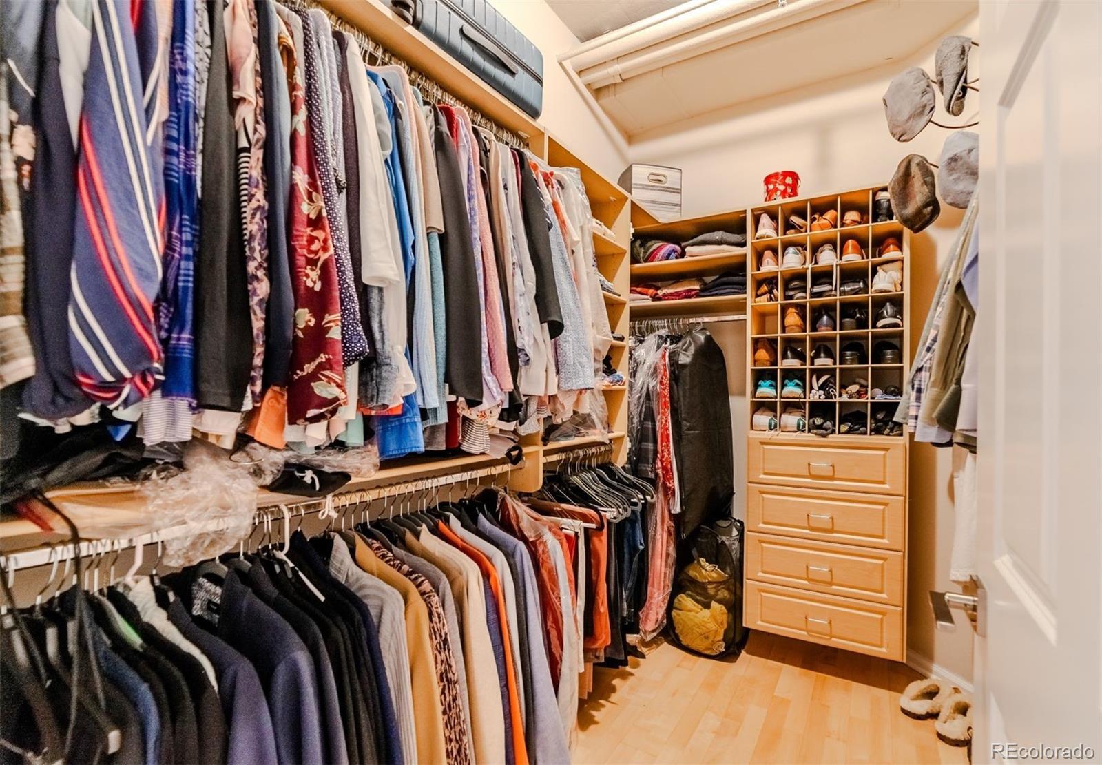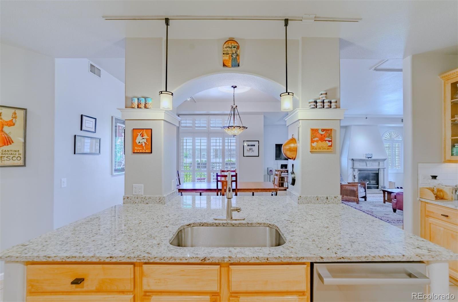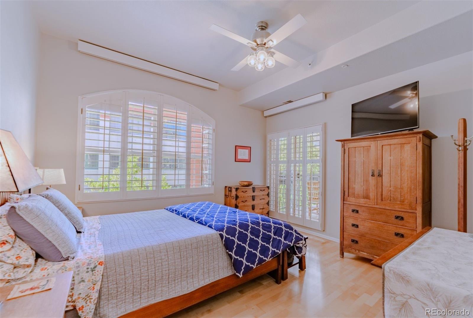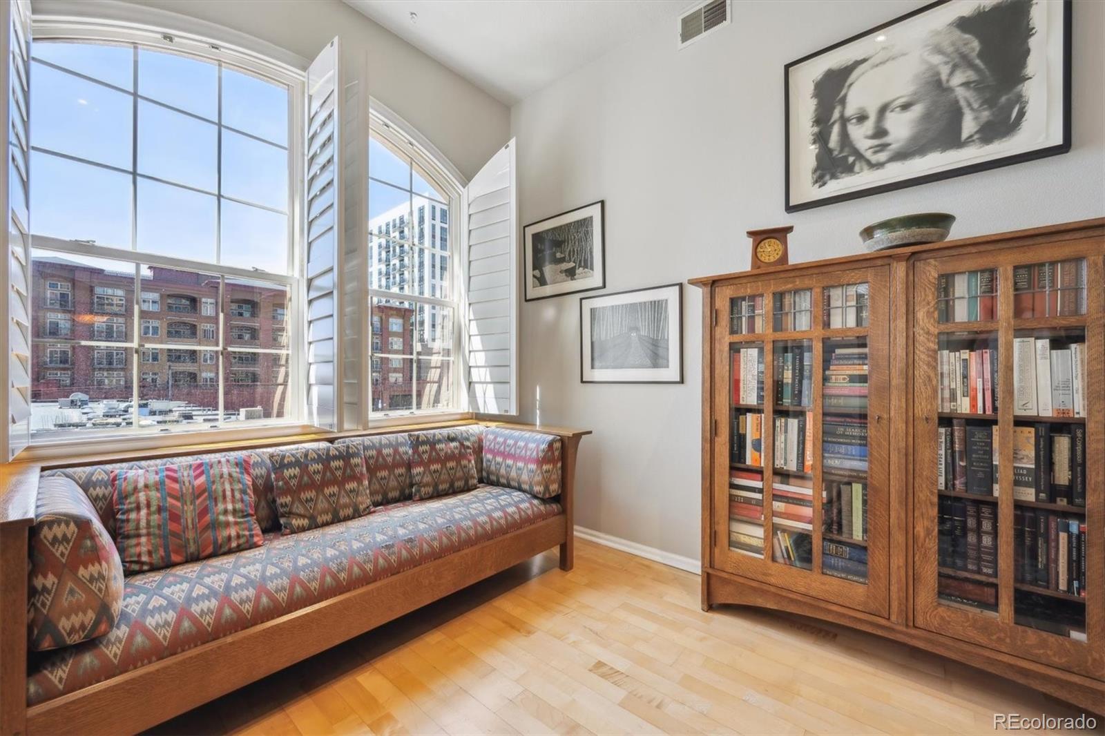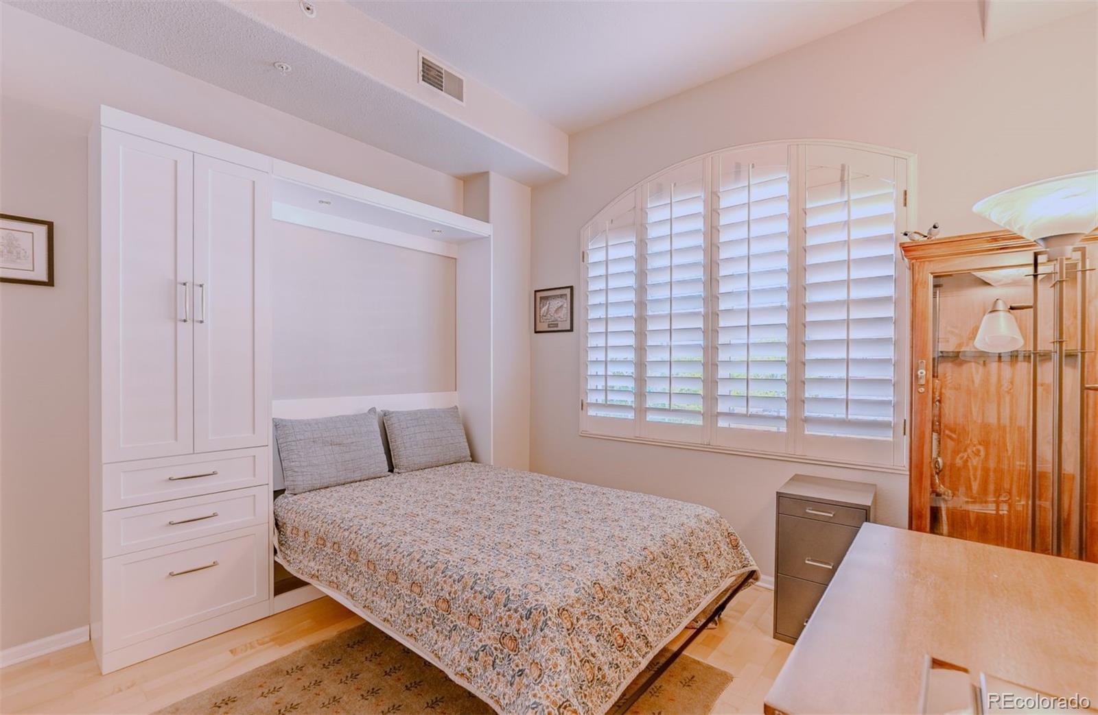Spacious & gracious condo in the Trieste building, this SW corner unit welcomes all with generous sized windows and two balconies, outfitted with plantation shutters throughout. Large, elegant updated kitchen, new Bosch appliances, including range, dishwasher and refrigerator replaced in the past six months! A rare pantry closet, 42" cabinets and loads of counter space will make your cooking and entertaining dreams easy to realize! The primary suite has direct access to one of the balconies, a huge outfitted closet, a w/5 piece bath with dual sinks as a newly expanded shower. An office with built-ins, make it easy to work or indulge in hobbies from from you private space. The second bedroom features a murphy bed for guests, while offering a study or den for daily use. The great room with large dining and living areas centered by dramatic gas fireplace and access to two balconies to complete this spacious 1665sf home. In addition, the furnace and washer/dryer have all been recently replaced. Parking is easy, with the two best spots in the building, just inside the garage, and next to your private storage closet. There is also an additional shared storage space on your floor. TAKE ADVANTAGE OF LOWER RATES, AND BUY THE BEST VALUE IN DENVER! The Golden Triangle neighborhood is a walkable urban paradise, home to the Still, Kirkland, Colorado History and Denver Art Museums, Main Library branch, Civic Center Park, a variety of restaurants and easy access to the Cherry Creek Trail and the DCPA. The Trieste building is centrally located, convenient to places you might want to visit, plus easy access to highways, when you want to get away. With secure entry and a capable HOA, this is the ultimate in downtown living and easy lock & leave residence. Explore the neighborhood at https://www.goldentriangleofdenver.com/