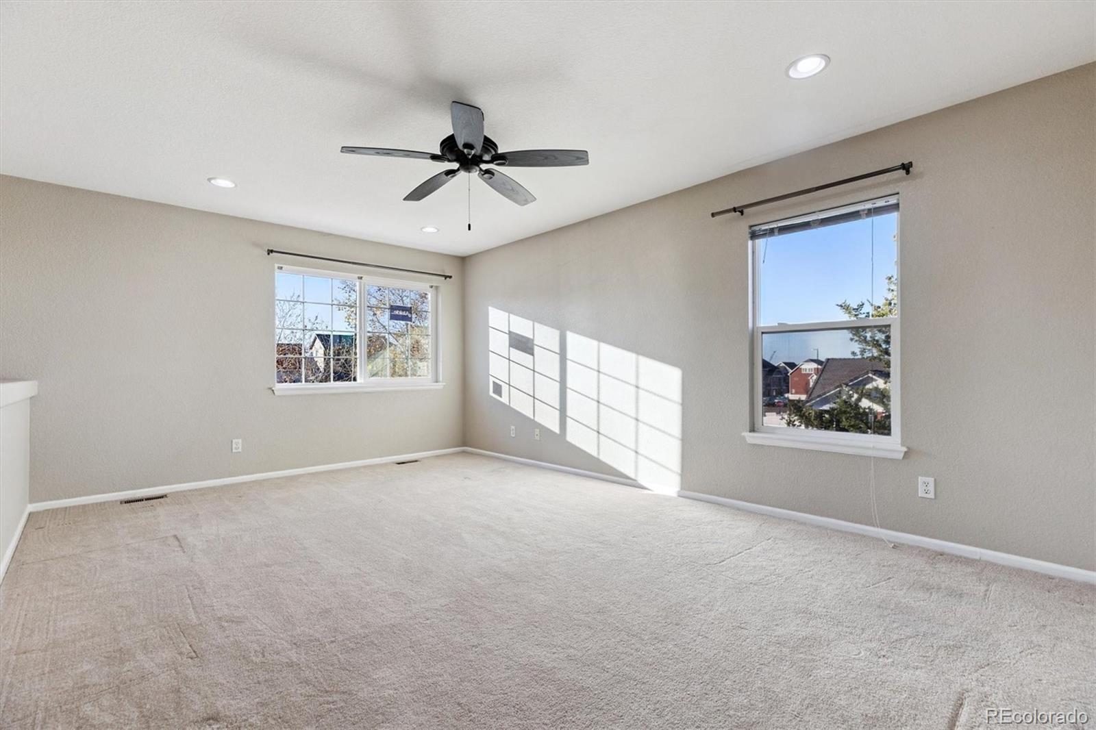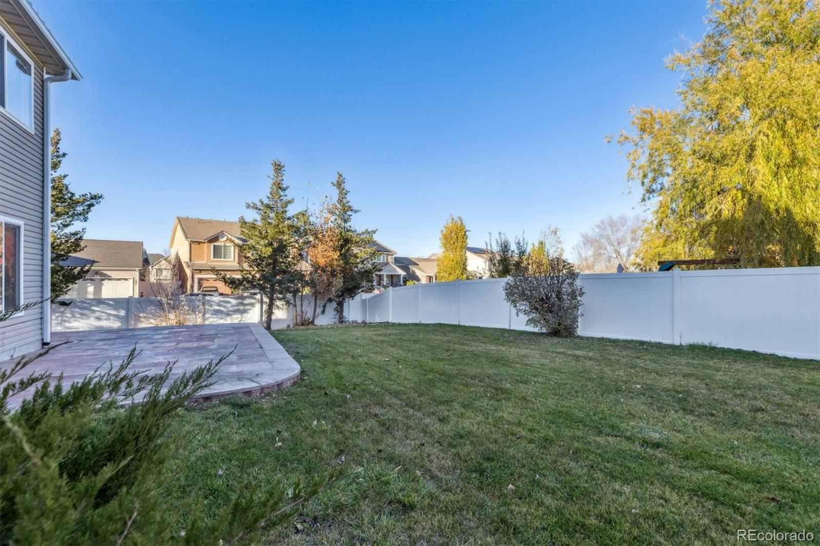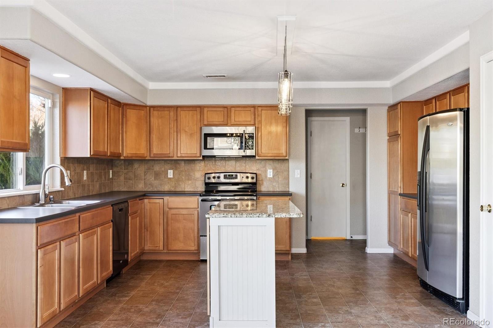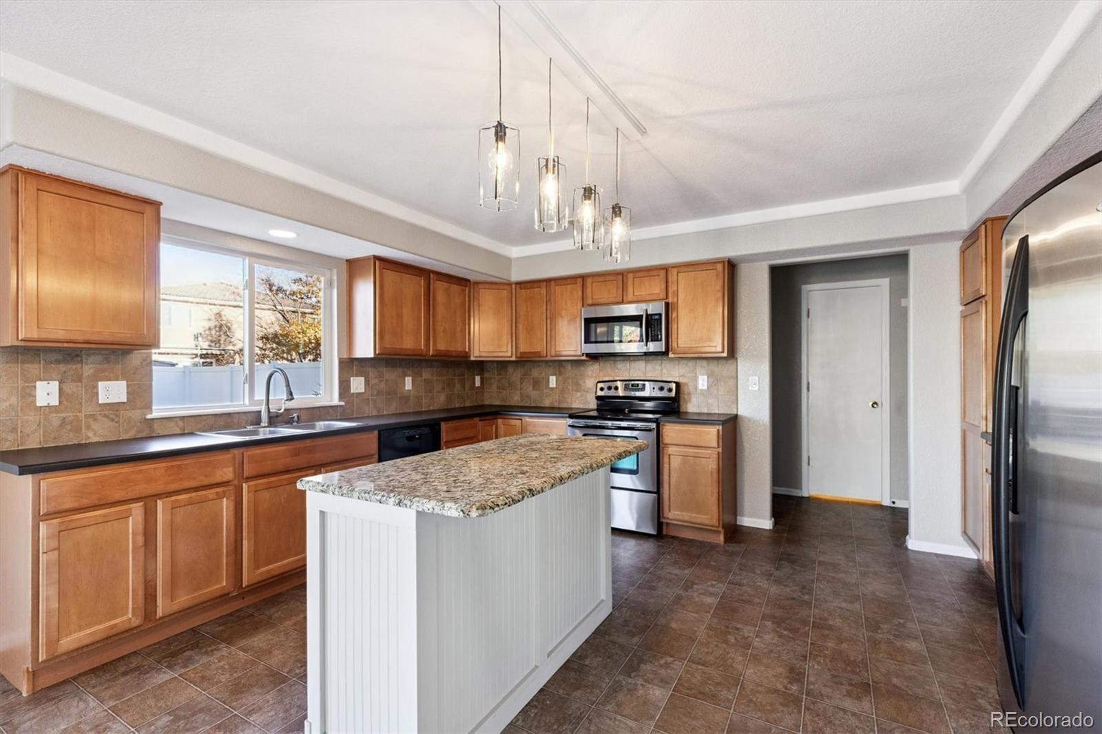 Light-filled 3 bed / 3 bath home with a huge loft on a private corner lot. The open floorplan is flooded with natural light. Large living room and an open kitchen with maple cabinets, generous island, stainless appliances, and roomy dining area with a new sliding door to the wraparound patio and large yard. Upstairs offers 3 bedrooms, 2 baths, and a giant loft—perfect as a second living area, playroom, home office, or easily converted to a 4th bedroom. The primary suite includes a spacious walk-in closet and a soaker tub. Outside features a landscaped yard with privacy fencing, mature trees, and an expansive patio. West-facing front for natural snowmelt and shaded backyard in summer. Corner lot with no shared driveway and extra privacy. Garage is on the same level as the house; insulated garage door. Cozy front porch, stucco front exterior, and low-maintenance vinyl siding. 2025 updates: New Class 4 impact-resistant roof (insurance discount potential), new gutters, new fencing, and some new siding. Washer/dryer included (2019). Prime location: Quick access to DIA and light rail; walkable to Town Center Park, rec center with pool and slides, farmers market on Wednesdays, Beer Garden, Chipotle, and King Soopers. Close to Costco, Sprouts, Dunkin, Panera, GVR PGA golf course, trails, creeks, parks, and nature areas.