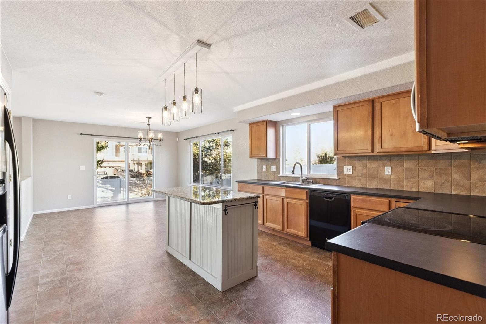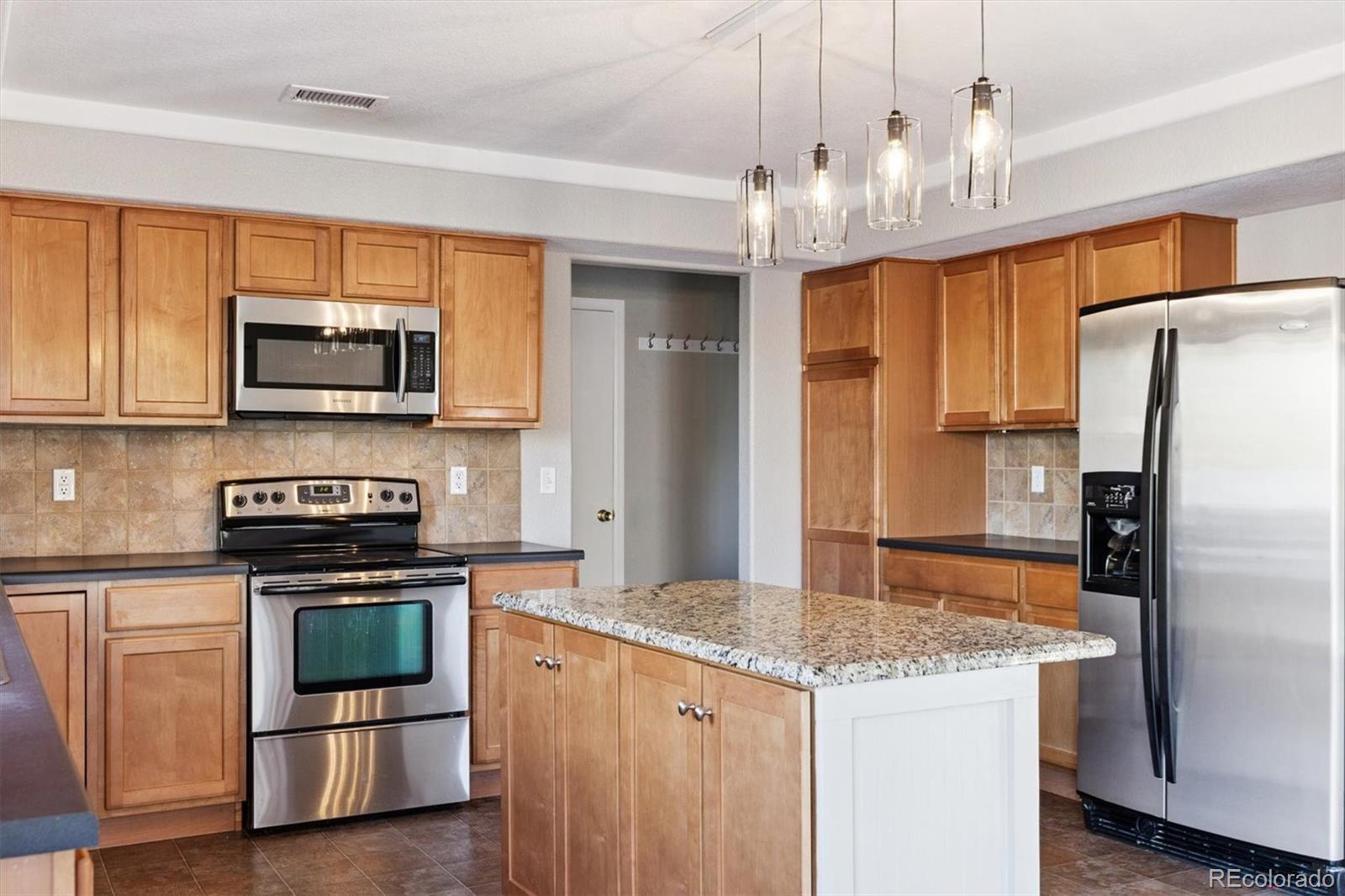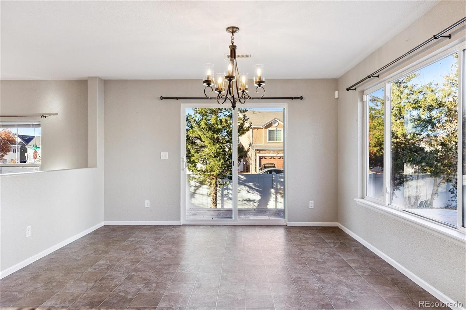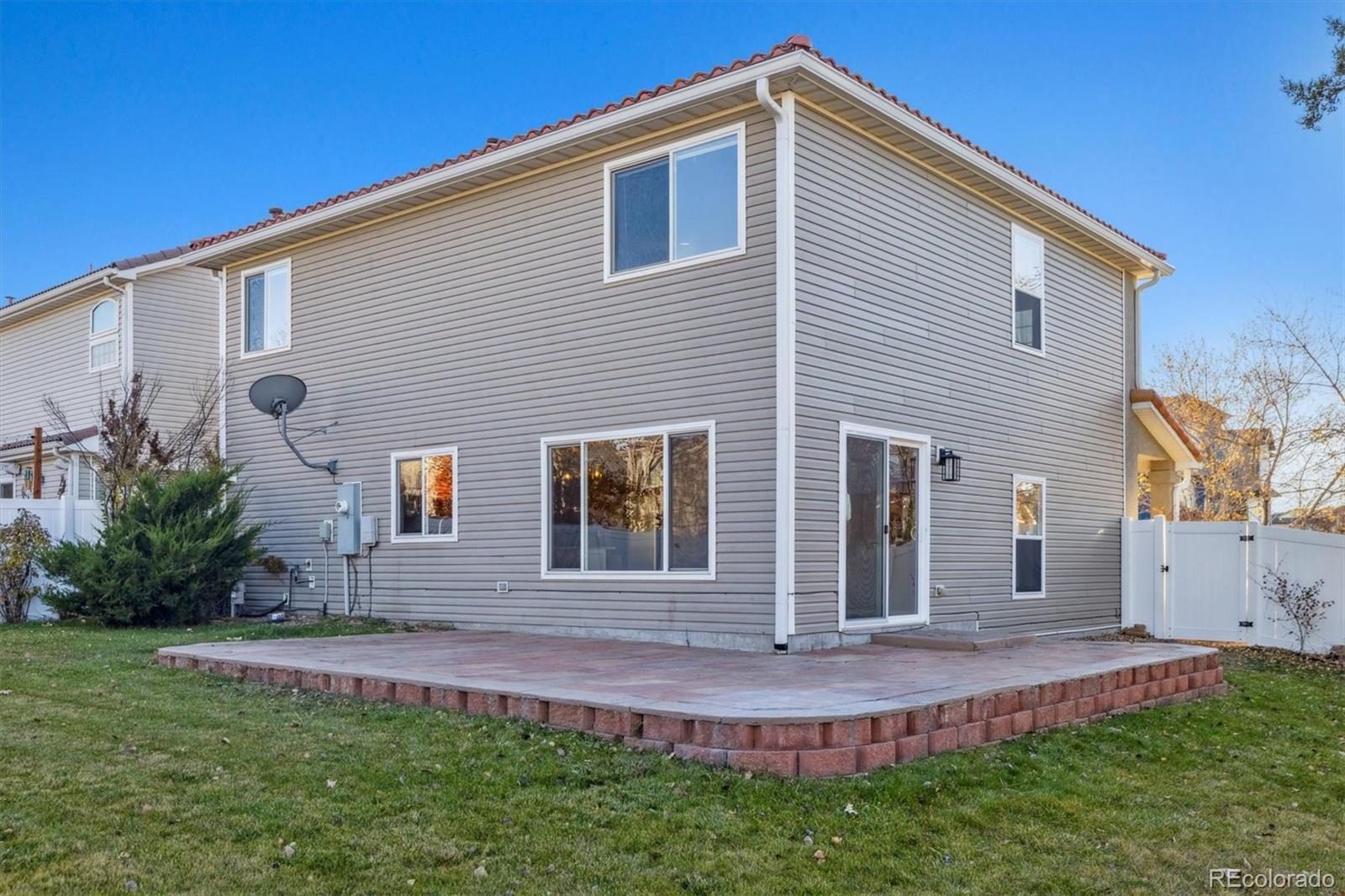 Light-filled 3 bed / 3 bath home with a huge loft on a private corner lot. The open floorplan is flooded with natural light. Large living room and an open kitchen with maple cabinets, generous island, stainless appliances, and roomy dining area with a new sliding door to the wraparound patio and large yard. Upstairs offers 3 bedrooms, 2 baths, and a giant loft—perfect as a second living area, playroom, home office, or easily converted to a 4th bedroom. The primary suite includes a spacious walk-in closet and a soaker tub. Outside features a landscaped yard with privacy fencing, mature trees, and an expansive patio. West-facing front for natural snowmelt and shaded backyard in summer. Corner lot with no shared driveway and extra privacy. Garage is on the same level as the house; insulated garage door. Cozy front porch, stucco front exterior, and low-maintenance vinyl siding. 2025 updates: New Class 4 impact-resistant roof (insurance discount potential), new gutters, new fencing, and some new siding. Washer/dryer included (2019). Prime location: Quick access to DIA and light rail; walkable to Town Center Park, rec center with pool and slides, farmers market on Wednesdays, Beer Garden, Chipotle, and King Soopers. Close to Costco, Sprouts, Dunkin, Panera, GVR PGA golf course, trails, creeks, parks, and nature areas.