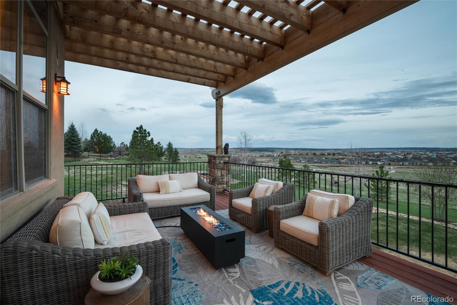 Welcome to this exquisite 6-bedroom, 7-bath custom home nestled in the highly sought-after Pradera Country Club. Perfectly positioned on over an acre and backing to open space, this home captures breathtaking views and offers the ultimate in privacy, luxury, and functionality. Step into a grand entrance that sets the tone for the quality craftsmanship found throughout. The stunning chef’s kitchen features Sub-Zero and Wolf appliances, a spacious island, and a walk-in butler’s pantry—perfect for entertaining. The adjoining family room boasts vaulted ceilings and a showstopping fireplace, flowing seamlessly to a large covered deck overlooking scenic open space. Enjoy formal dining and living rooms ideal for hosting guests, and a versatile main-floor bedroom with a private entry to the deck, perfect for a home office or guest suite. Upstairs, the luxurious primary suite offers a cozy fireplace, sitting area, and built-in coffee bar. The spa-like primary bath features radiant heated floors, a soaking tub, dual-head steam shower, and a walk-in closet with direct access to the laundry room. Each of the three secondary bedrooms upstairs includes its own en-suite bathroom for ultimate comfort and privacy. The recently finished basement is an entertainer’s dream, complete with a full bar featuring a refrigerator and dishwasher, a spacious rec area with a stylish half bath, an additional master suite with a marble tiled en-suite full bathroom, a massive storage area closet with custom shelving. Relax in the private hot tub while soaking in panoramic views. With dual furnaces, two A/C units, an industrial-grade water heater, and a state-of-the-art PURONICS water system, this home delivers year-round comfort and efficiency. All of this, set on a beautifully landscaped 1+ acre lot in a premier golf community.*SELLER WILL PAY GOLF INITIATION FEE AND UP TO $2,500 FOR MONTHLY DUES DIRECTLY TO THE CLUBHOUSE ON BEHALF OF THE BUYER - With a full price offer*