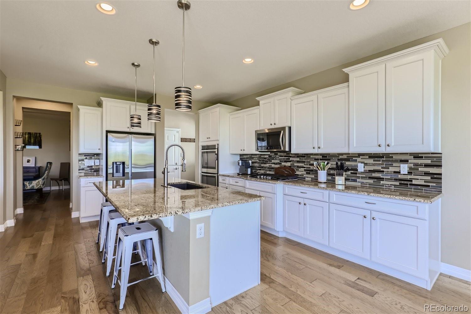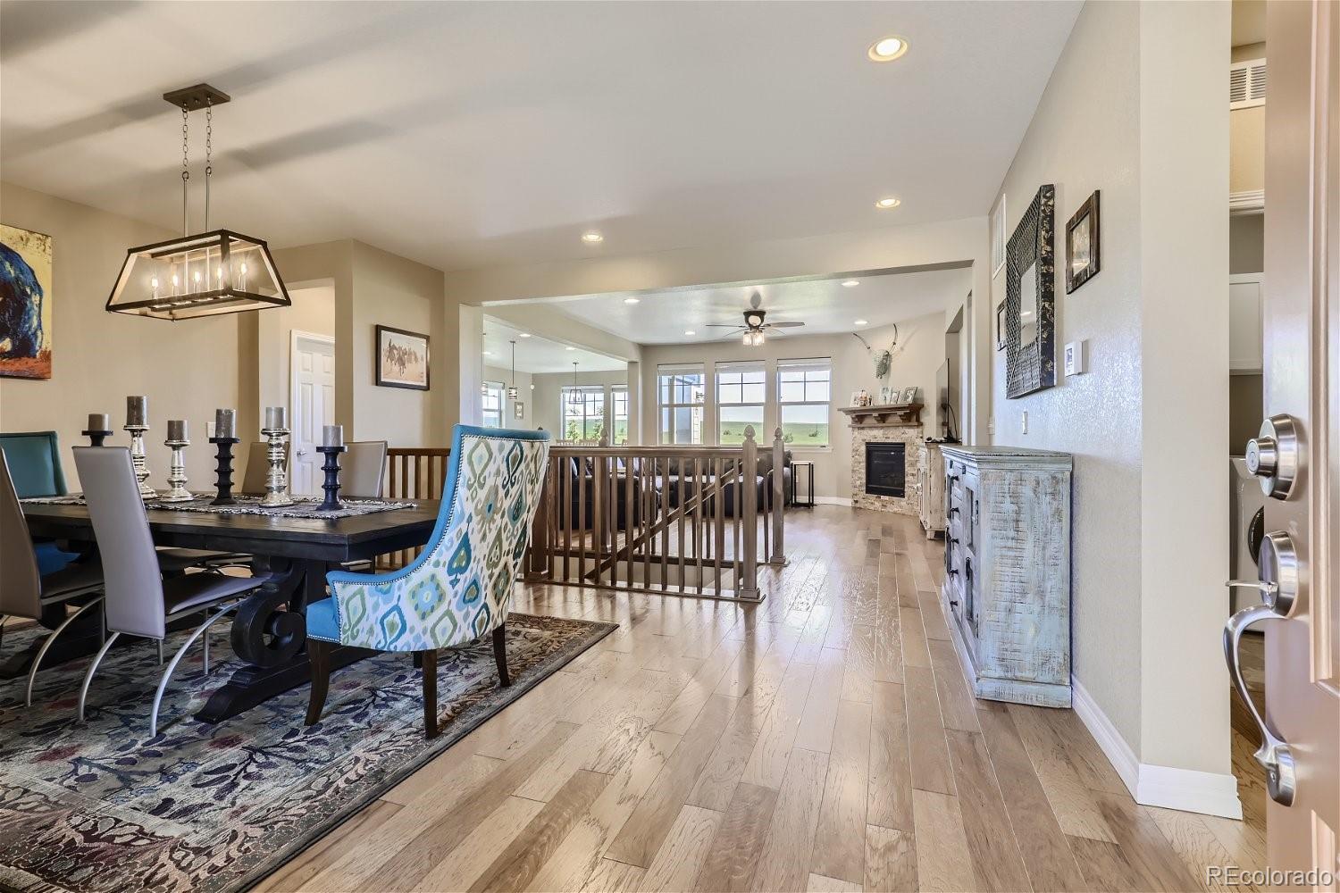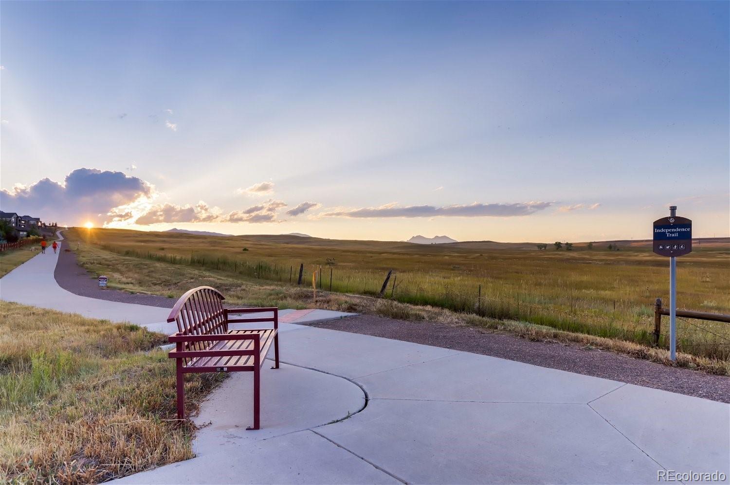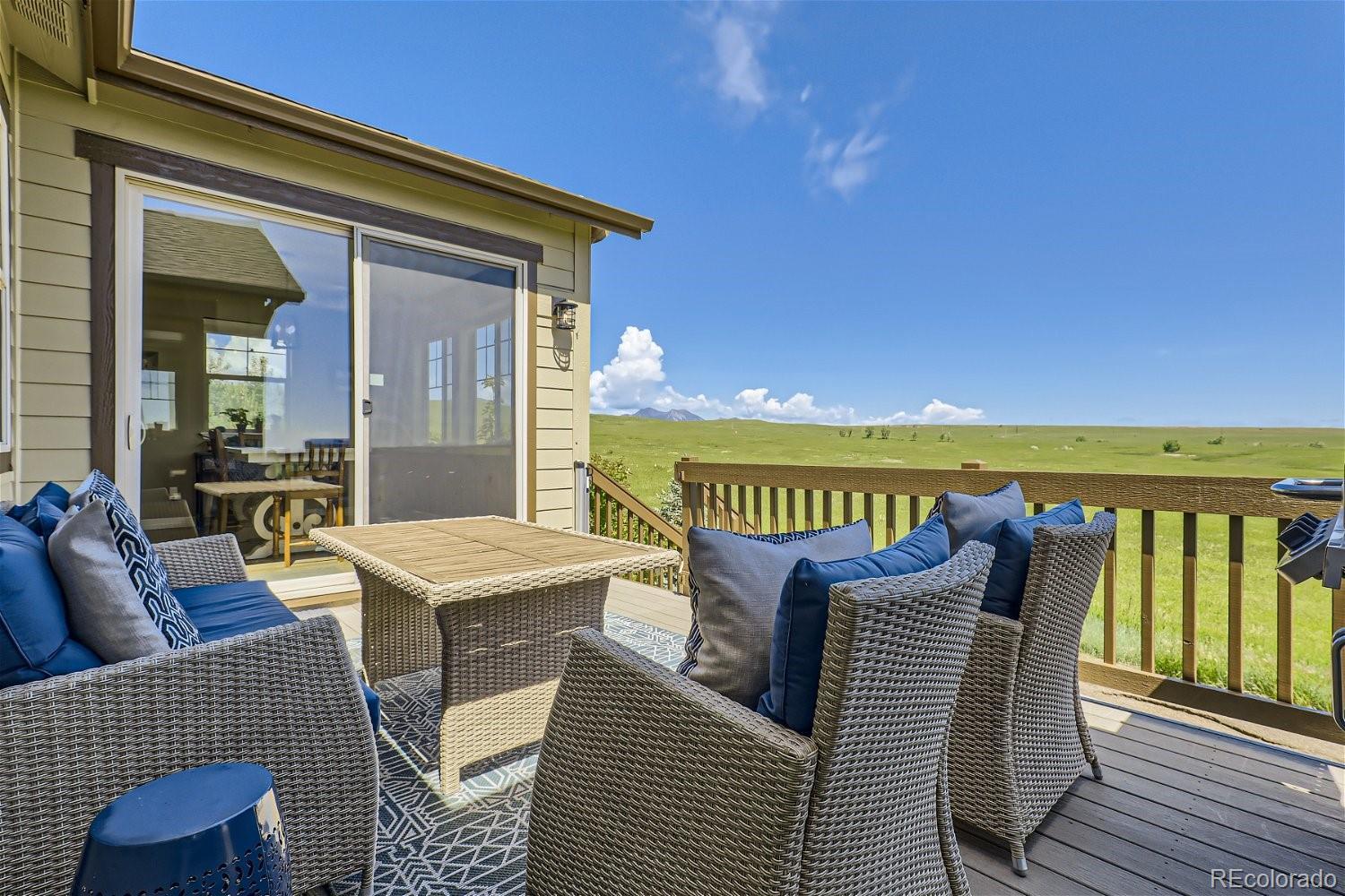 MOTIVATED SELLER! Nestled against a wildlife refuge, this home provides unparalleled privacy and tranquility, boasting sweeping views of mountains, grasslands, and city lights. Enjoy these breathtaking vistas from the upper deck or the backyard patio. Inside, the home features an inviting open concept living space with engineered hardwood floors throughout the main living space. The kitchen is a chef's dream with granite countertops, a walk-in pantry, island, and stainless steel appliances, including double ovens and a gas cooktop. The dining options are flexible, offering both an informal dining space and a formal dining room. The spacious great room is anchored by a gas fireplace, perfect for cozying up during winter nights. The expansive primary suite offers walkout access to the deck, along with two walk-in closets and a luxurious 5-piece bathroom. Two additional bedrooms share a full bathroom, with an additional powder room nearby for guests. The fully finished walkout basement is a standout feature, featuring a large bonus room with rough-in plumbing, ideal for a future bar or kitchenette. French doors lead into a superb home office with built-ins and patio access, offering ultimate setting and privacy for those who work from home. An additional bedroom, bathroom, and ample storage (175 sq ft) complete the basement, with potential to convert the storage into another bonus room. Another notable feature is the fully owned solar panels…save $ on your electric usage! And the full exterior of the home was recently painted with premium grade Sherman Williams Duration paint. Located in the coveted Candelas neighborhood, this home offers the ultimate in community living with amenities such as a fitness center, clubhouse, pool, tennis courts, basketball courts, parks, trails, and vibrant community events. Come discover this exceptional property, perfectly positioned in one of Candelas' finest settings.