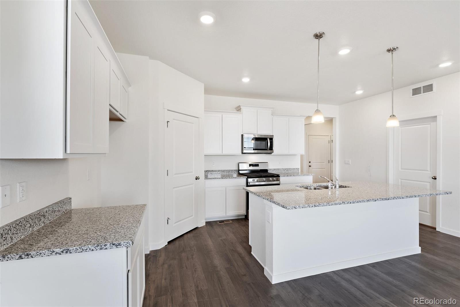 This ranch style home features 3 bedrooms, 2 baths, 2.5 car garage and 1,635 sq. ft. of living space and front and backyard landscaping. As you walk through the hallway you will pass the stairs and enter the open concept living area. The kitchen provides plenty of space with a walk-in pantry, stainless steel appliances, granite countertops, white cabinets, and an expansive kitchen island. Flowing from the kitchen is the dining nook, with access to the backyard and the great room. The walk-in closets, walk-in laundry room, linen closets, and spacious hallways can be found on the main level as well. The primary bedroom includes an attached bathroom, with a double vanity sink, countertops, a toilet, and an expansive walk-in closet with added storage space. Added features of this new home include a laminate flooring, 9' ceilings, tankless water heater as well as energy-efficient appliance, and Smart Home technology. Residents in this new home community have access to the 7,000 sq.ft. Venture community amenity center that provides an award-winning fitness facility complete with state-of-the-art equipment, flex rooms, plenty of gathering space, a catering kitchen and even two pools! ***Estimated Delivery Date: November. Photos are representative and not of actual property***