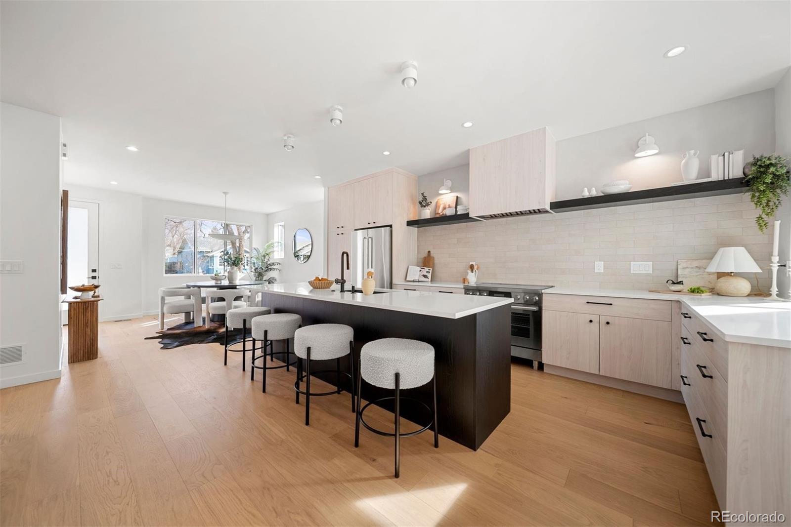 Seller Offering Permanent Rate Buy-Down Incentive (for Jumbo Loans)! Striking in form and intentional in every detail, this newly constructed residence redefines modern living through clean architecture, layered textures, and highly functional design. Natural light pours through expansive windows, illuminating wide-plank flooring and a thoughtfully curated open layout on the main level. The kitchen serves as the heart of the home, anchored by a over-sized island, quartz surfaces, custom cabinetry, roman clay accents and premium stainless appliances, creating a space that is as inviting for quiet mornings as it is for vibrant gatherings. A refined powder bath and tailored mudroom introduce both elegance and everyday practicality. Upstairs, three well-appointed bedrooms offer privacy and comfort, including a calming primary retreat, a generous walk-in closet, and a spa-style five-piece bath designed for daily indulgence. Two additional bedrooms and conveniently located laundry hookups provide a flexible layout ideal for evolving lifestyles. The top floor is purposefully designed as the home’s social centerpiece, featuring an expansive entertaining lounge with wet bar that opens seamlessly to a sprawling rooftop deck. With sweeping mountain views and dramatic sunset backdrops, this space becomes an extension of your living environment, perfect for hosting, unwinding, and making memories. The finished basement introduces an additional bedroom, full bathroom, and laundry room alongside generous open space, offering endless versatility for guests, recreation, fitness, or creative use. A two-car garage completes the residence, blending storage, security, and convenience. Situated in Overland Park, just moments from South Broadway’s celebrated restaurants, coffee shops, parks, and light rail, this home offers a rare blend of architectural clarity, modern comfort, and effortless access to downtown Denver, an exceptional opportunity to experience elevated urban living.