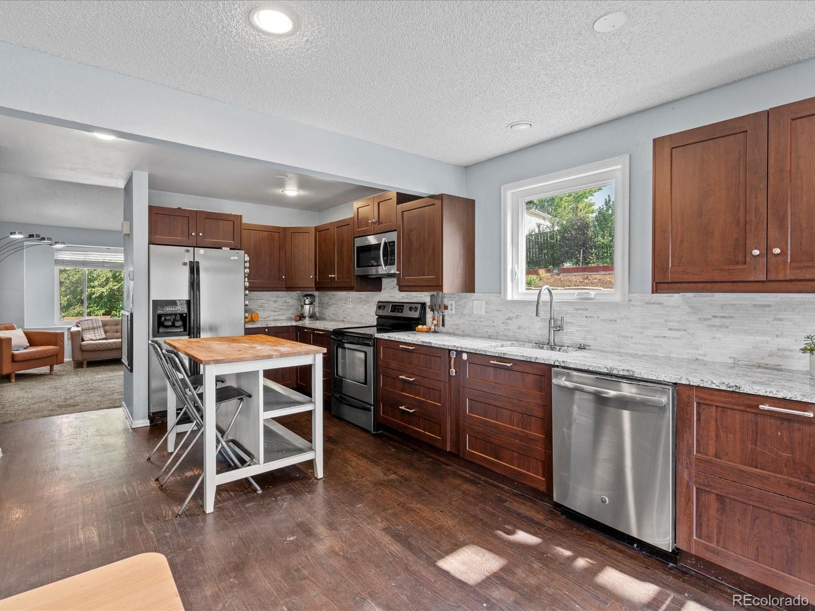 Tucked at the end of a quiet Northridge cul-de-sac, this home delivers what many promise but few achieve—true upgrades, thoughtful design, and that unmistakable “this is the one” feeling. The kitchen has been completely reimagined with custom soft-close cabinetry, slab granite counters, stainless steel appliances, and a new window that fills the space with warm southern light. Upstairs offers three comfortable bedrooms and a beautifully updated bathroom. The finished basement expands your living space with a versatile family room, a fourth bedroom, and a ¾ bath—perfect for guests or a home office. Every update has been made with care, from the new furnace and exterior paint to the upgraded garage door and newer concrete driveway. Step outside to a private backyard oasis surrounded by mature trees and a 550 sq. ft. stamped concrete patio—ideal for outdoor dining, entertaining, or relaxing. Minutes from C-470, parks, scenic trails, and top-rated Douglas County schools, this home also includes low HOA dues with access to pools, rec centers, and tennis courts.