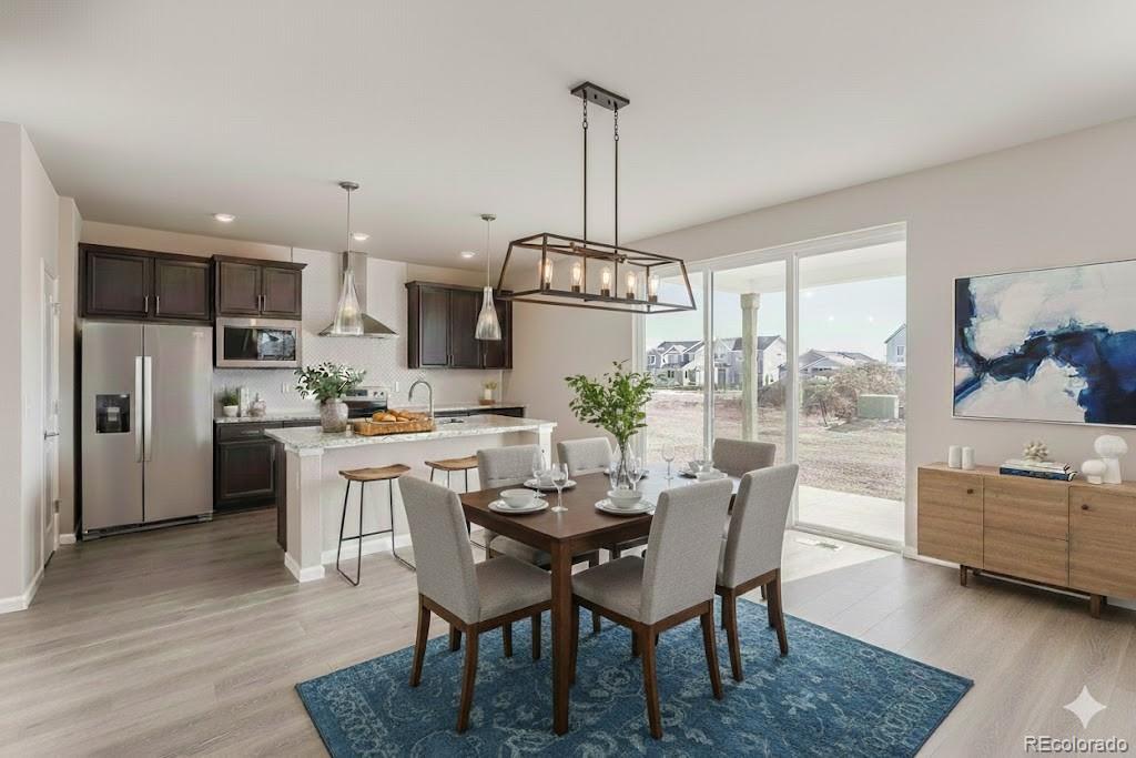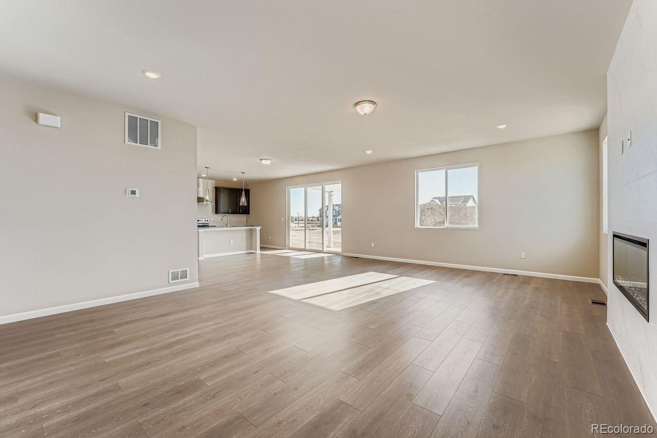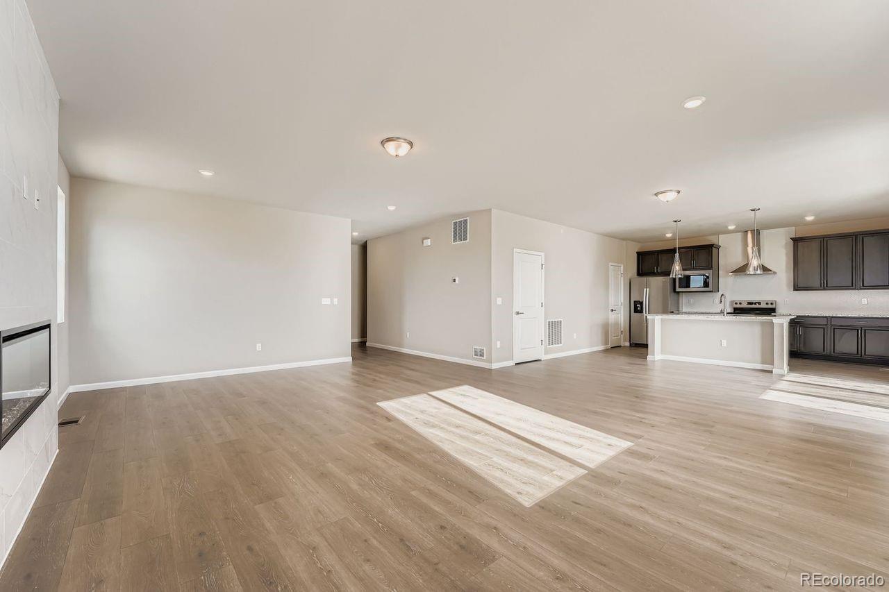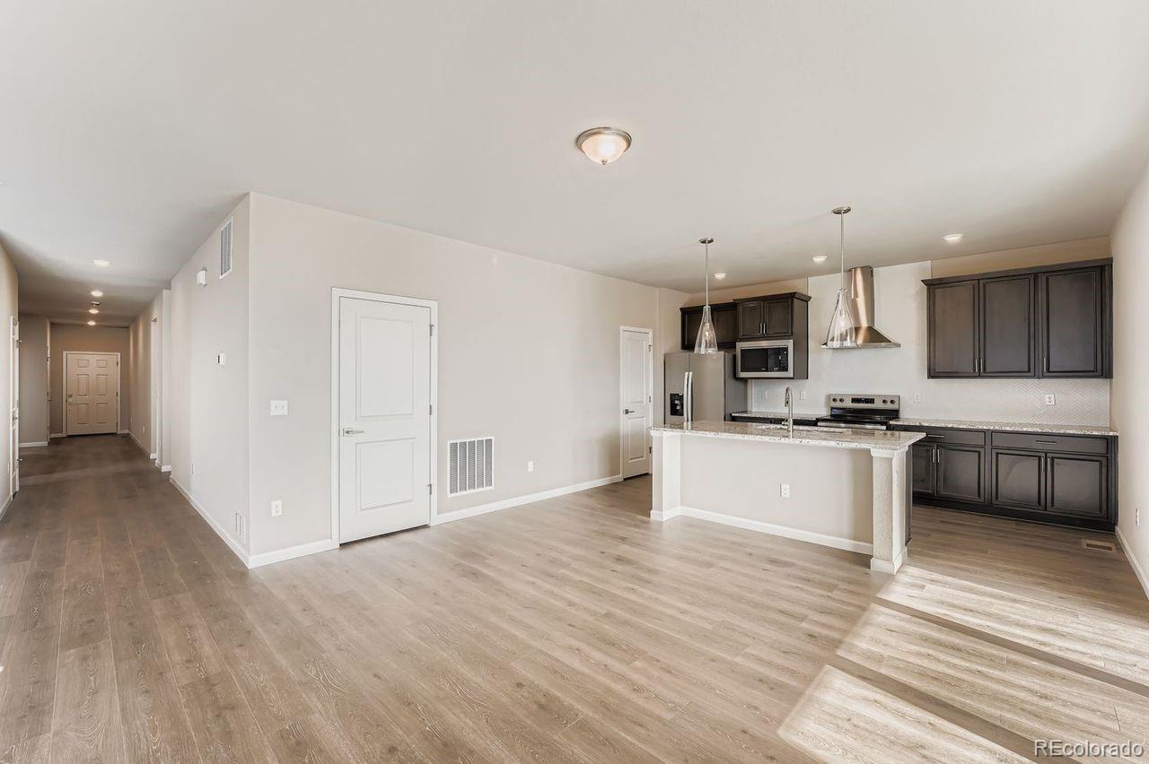 Great financing incentives available! MOVE-IN READY! Beautiful new ranch home on a corner lot! 3-bedroom, 2-bath home with 1,894 square feet. Located in the heart of Strasburg, CO, this home combines modern comfort with small-town living just 30 minutes from Denver. Step inside to an open-concept main level featuring bright natural light and an oversized living area that flows effortlessly into the kitchen and dining space. The 9’ ceilings create a bright and airy living space. The kitchen boasts stainless steel appliances, a large island with seating, plenty of counter space, upgraded cabinets, granite countertops, and built in microwave. The home also includes a private primary suite with oversized walk-in closet and ensuite bathroom featuring dual vanities. Wolf Creek offers the tranquility of remote living with an easy commute to the Denver metro area.