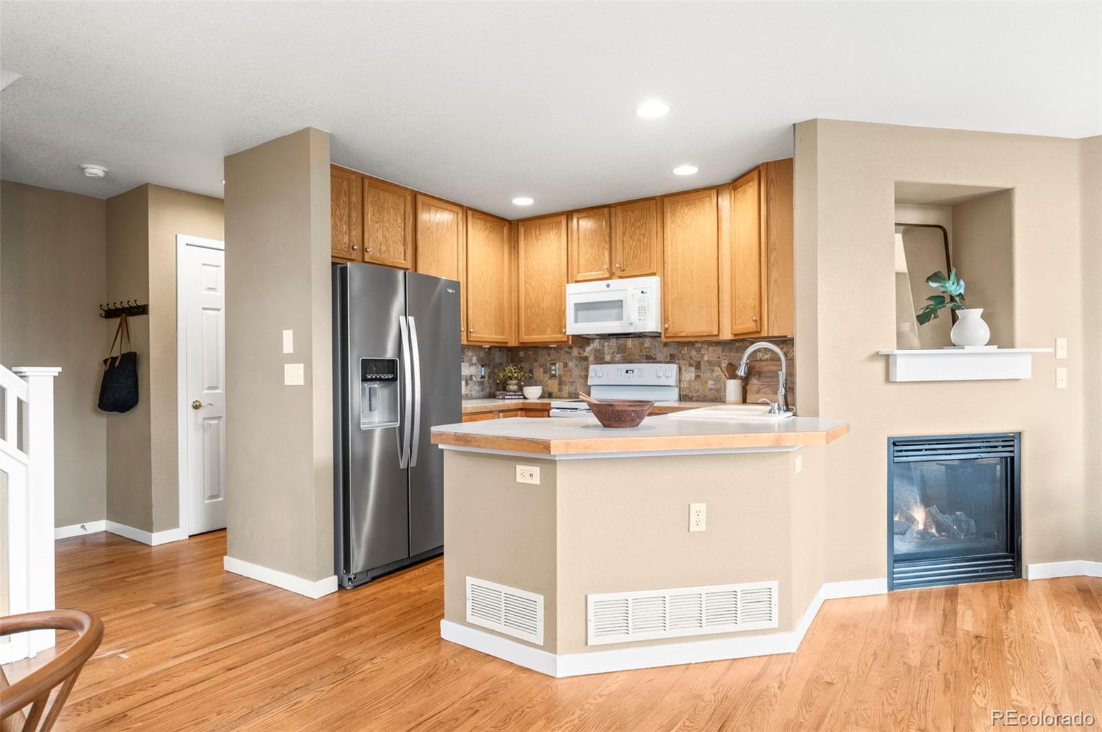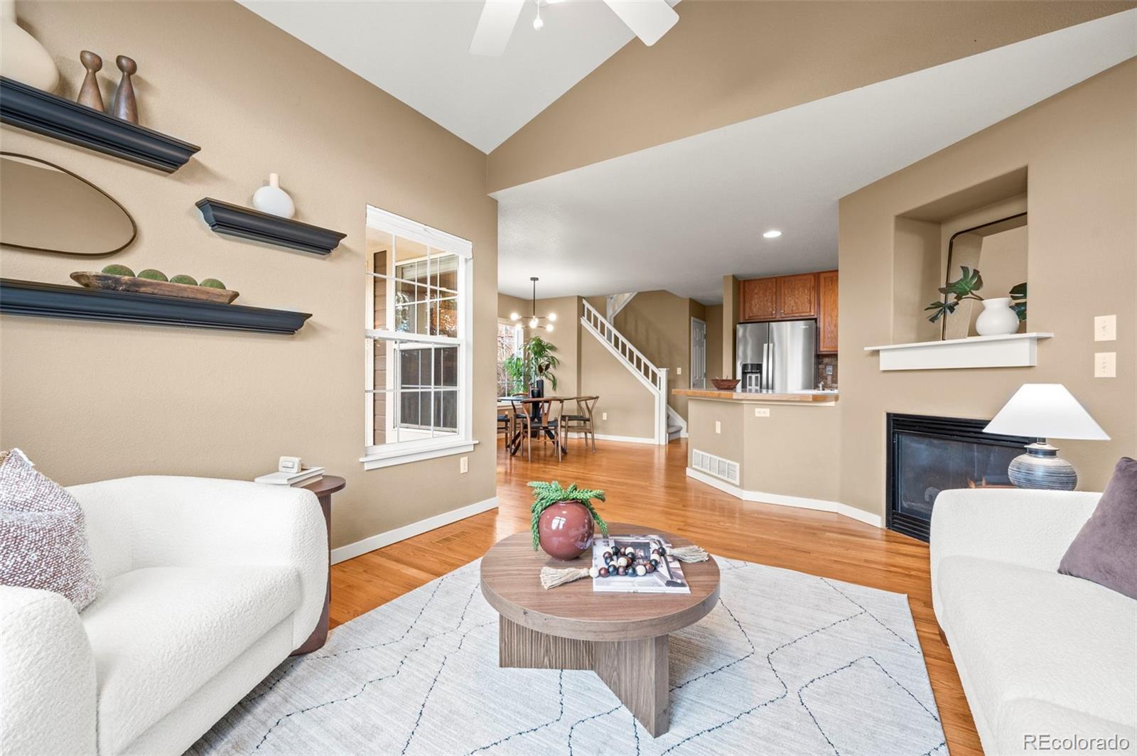 Beautiful end-unit townhome overlooking Indian Peaks Golf Course with stunning mountain views. Bright and open floor plan featuring wood and tile floors throughout. The kitchen offers 42-inch cabinets and newer appliances, including dishwasher, refrigerator, and microwave. All appliances are included. The home features a convenient floor plan with the primary suite on its own level, providing privacy and comfort. The primary bedroom is filled with beautiful windows and natural light and includes a luxurious 5-piece bathroom. Another level offers two additional bedrooms and a full hall bath. The main level features an open floor plan with a cozy fireplace and a half bath, perfect for entertaining. The finished lower level includes a large family room with an included Murphy bed—ideal for out-of-town guests, a full bathroom, and a generously sized laundry room with ample storage. Recent updates include new carpet, new window panes, and a recently installed whole-house fan for enhanced energy efficiency. Additional highlights include an attached 2-car garage and a private front courtyard with scenic views. Located in a top-rated school district, close to downtown Lafayette and Louisville, with an easy commute to Boulder. HOA includes exterior insurance, grounds maintenance, snow removal, trash, recycling, and compost.