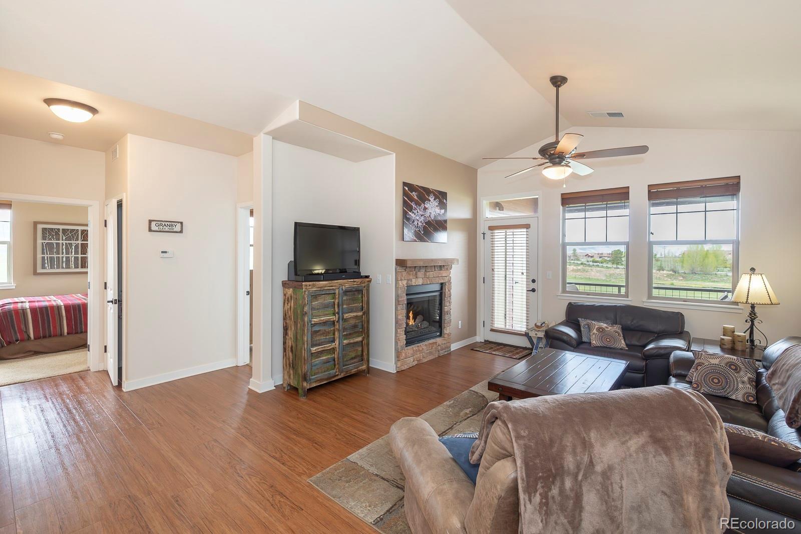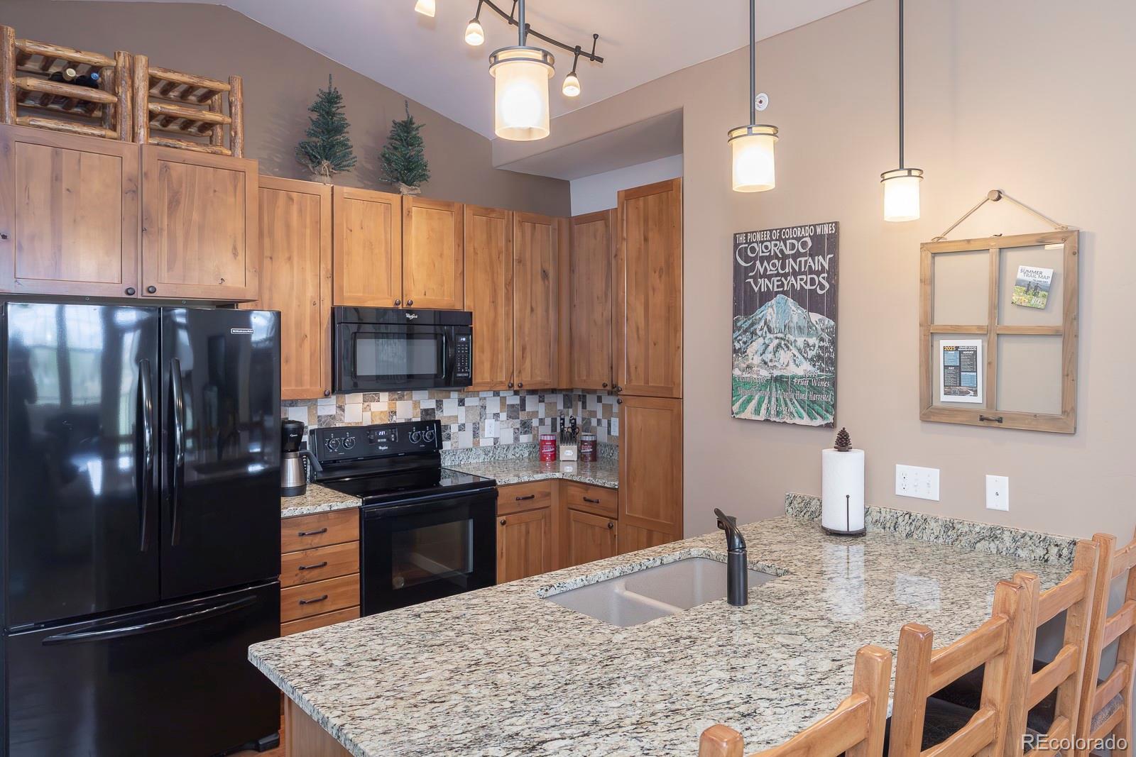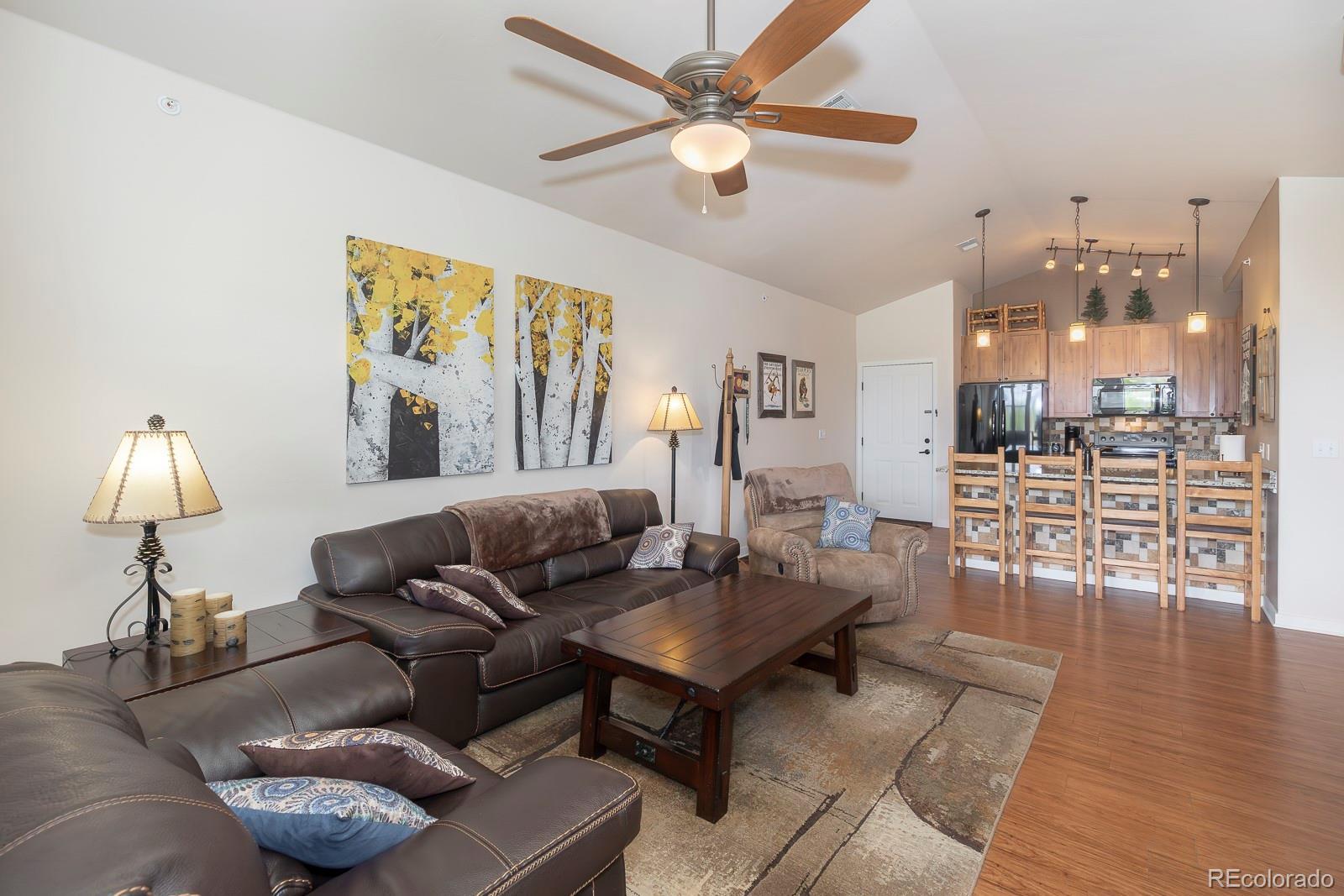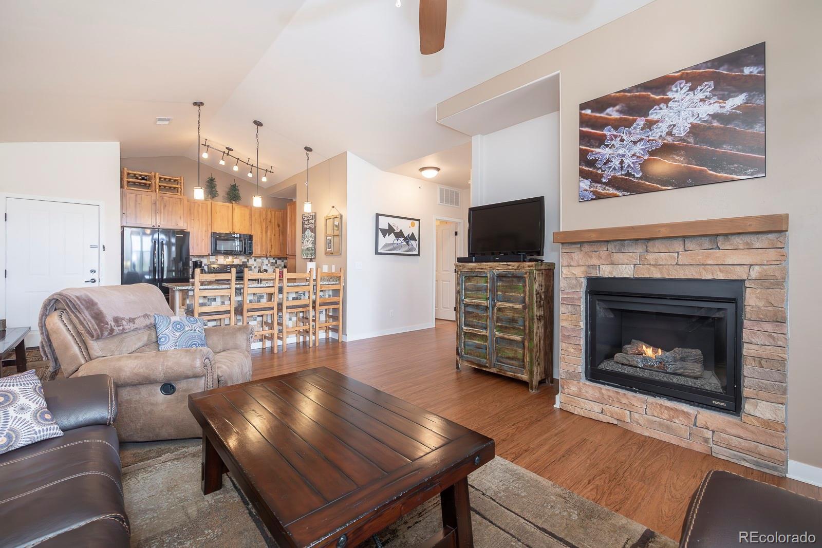 Experience the best of Aspen Meadows in this stunning 2-bedroom, 2-bath top-floor condo, complete with a private garage and soaring vaulted ceilings. Enjoy sweeping views of the surrounding ranchlands and majestic mountains — a breathtaking backdrop in every season. Located in one of the newest buildings, this residence features high-end finishes throughout, including craftsman-style cabinetry, bright granite countertops in the bathrooms and primary suite, and a custom tile backsplash. The property is impeccably maintained and filled with thoughtful, upscale details. You'll appreciate the convenience of a dedicated garage plus additional outdoor storage for all your mountain gear. Situated in the heart of Granby Ranch, you'll have access to a full range of amenities — ski, golf, fish, and hike right from your doorstep.