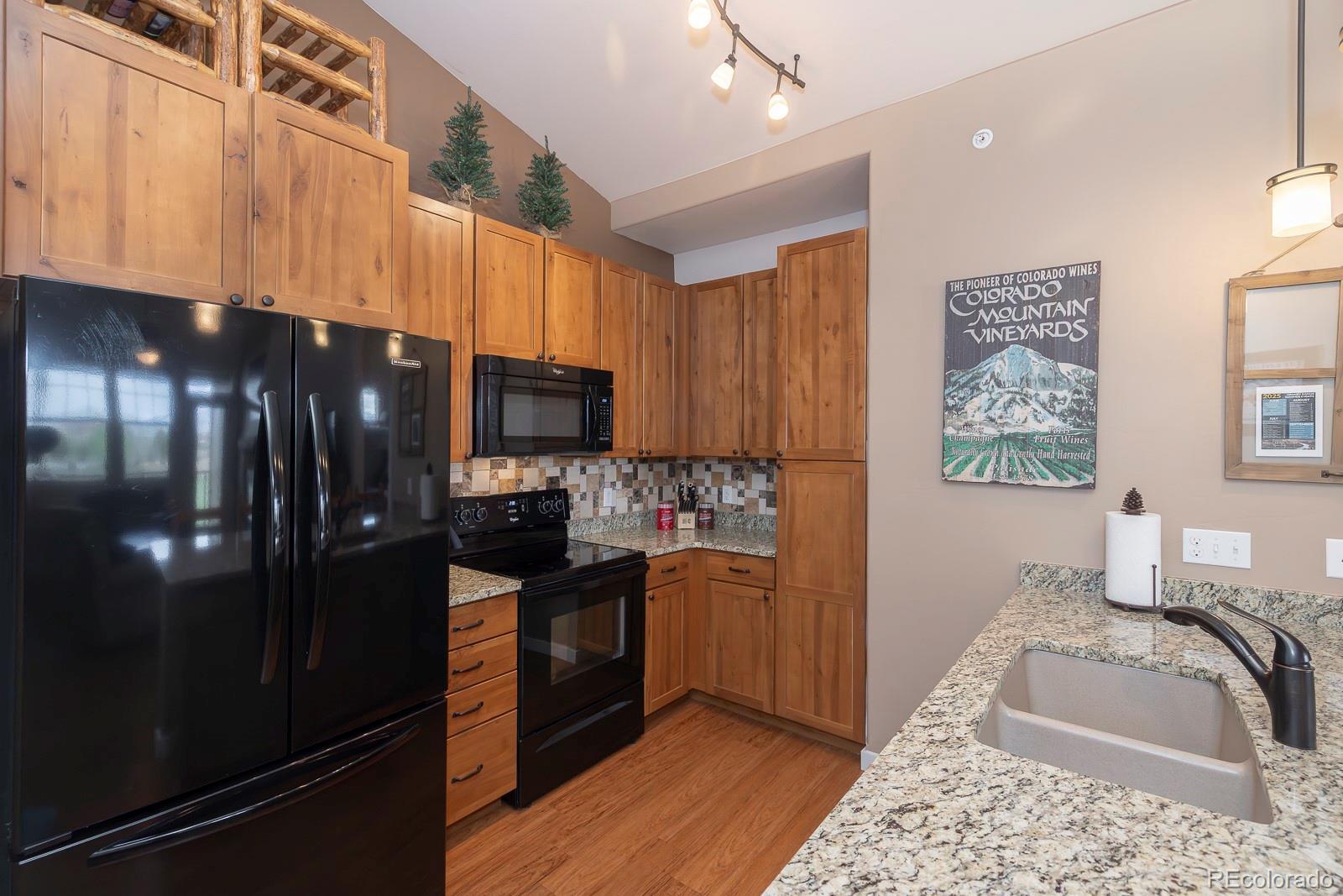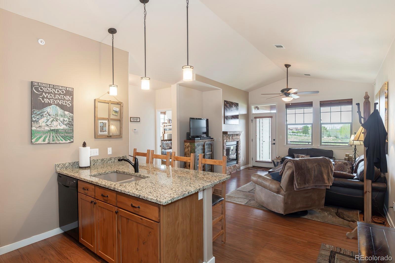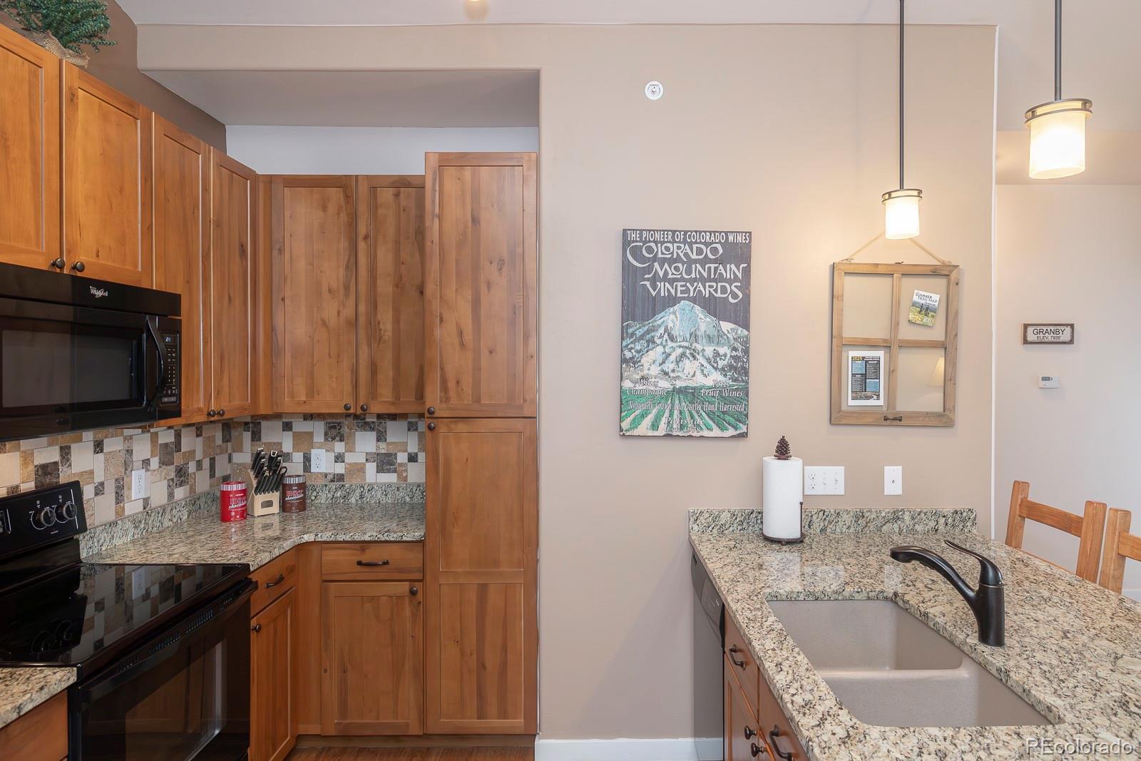 Experience the best of Aspen Meadows in this stunning 2-bedroom, 2-bath top-floor condo, complete with a private garage and soaring vaulted ceilings. Enjoy sweeping views of the surrounding ranchlands and majestic mountains — a breathtaking backdrop in every season. Located in one of the newest buildings, this residence features high-end finishes throughout, including craftsman-style cabinetry, bright granite countertops in the bathrooms and primary suite, and a custom tile backsplash. The property is impeccably maintained and filled with thoughtful, upscale details. You'll appreciate the convenience of a dedicated garage plus additional outdoor storage for all your mountain gear. Situated in the heart of Granby Ranch, you'll have access to a full range of amenities — ski, golf, fish, and hike right from your doorstep.