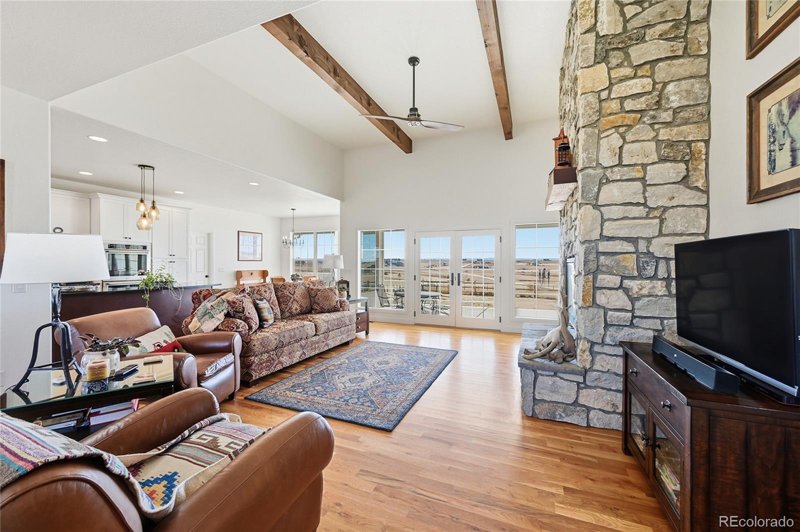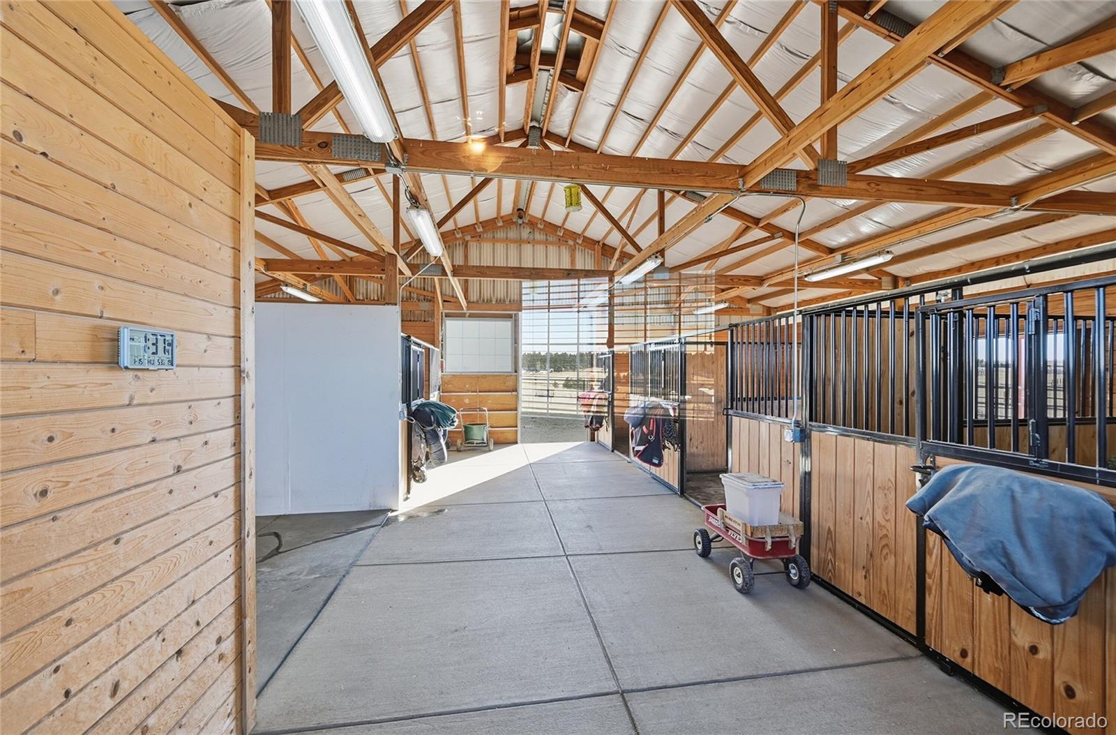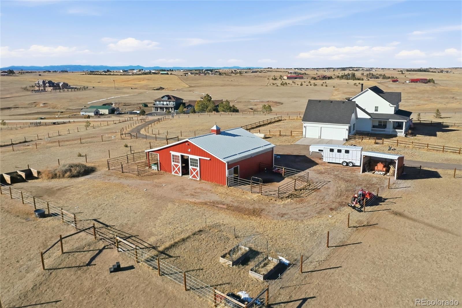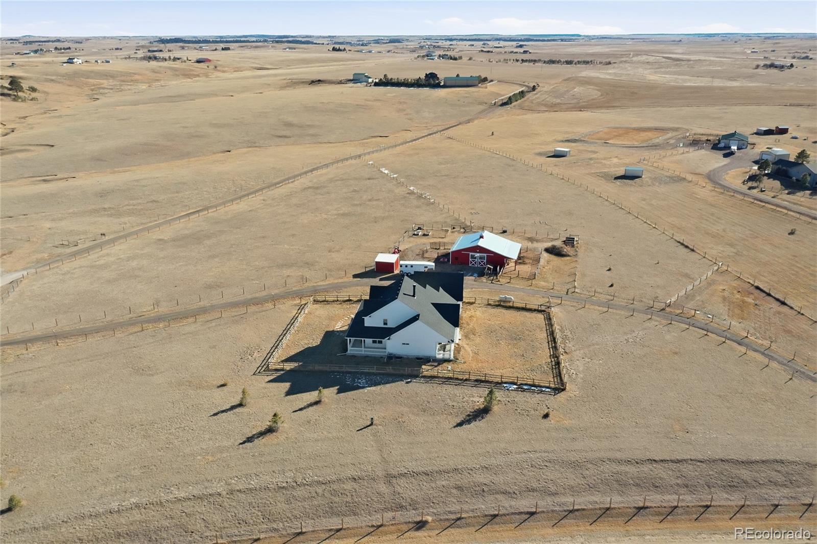 NEWER CONSTRUCTION, NEARLY 10 ACRES, FINISHED & FENCED HORSE FACILITIES! Welcome to 1498 Santa Fe Trail, a rare and thoughtfully designed equestrian estate nestled on nearly 10 acres offering sweeping views of Pikes Peak, the Front Range, and the Eastern Plains. Just a scenic 30-minute drive from downtown Parker, Castle Rock, and Colorado Springs, this property was designed with the horse enthusiast in mind. The well-appointed barn features four oversized stalls, a heated tack room with washer and dryer hookups, wash and grooming stall, insulated ceilings, abundant electrical outlets, multiple turnout areas, three separate fenced and gated pastures, electric fencing, and a freestanding hay shed—providing functionality, comfort, and efficiency for both horse and owner. The home is elevated on the property, maximizing views and privacy, with expansive front and back porches ideal for enjoying Colorado’s sunsets and wide-open skies. Inside, an open and airy floor plan is filled with natural light and timeless finishes. Hardwood floors are complemented by a distinctive brick inlay in the kitchen, entryway, and mudroom, adding warmth and character throughout. The main-level primary suite with ensuite bath, spacious office, and additional full bath provide convenient main-floor living. The gourmet kitchen features soapstone countertops, subway tile backsplash, farmhouse sink, stainless steel appliances, and an eat-in area perfectly positioned to take in west-facing views. A formal dining room, large mudroom, and three-car garage complete the main level. Upstairs offers two generously sized bedrooms with walk-in closets and peaceful views of the pines and plains, along with a full bath. The unfinished basement is ready for your custom finish and future expansion. This is a rare opportunity to own a true horse property that seamlessly blends refined living, exceptional equestrian facilities, and breathtaking Colorado scenery.