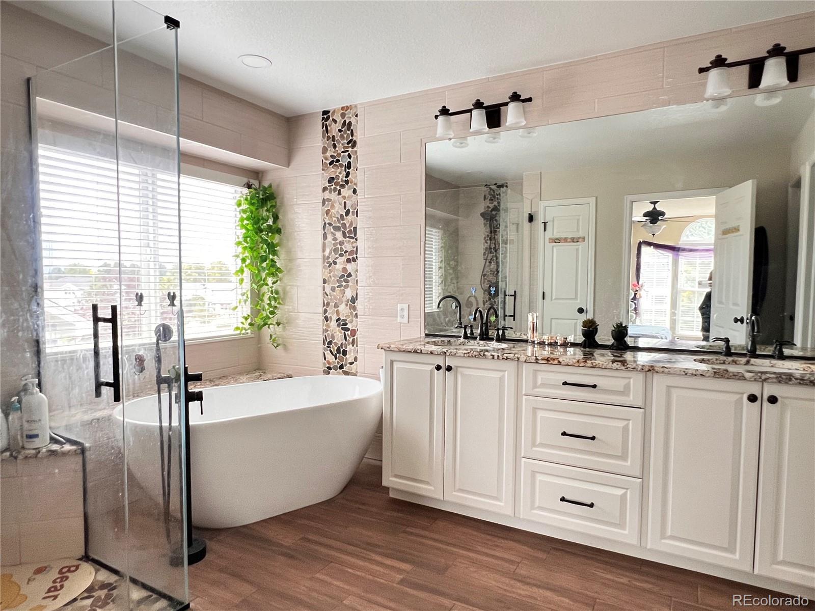 Welcome home!! Enjoy stunning golf course and mountain views from this beautiful 2-story home in the highly desirable Hunter’s Glen community. The main level features gleaming hardwood floors, new carpet in the formal dining and living rooms, and soaring vaulted ceilings that fill the home with natural light. The kitchen shines with refinished white cabinetry, granite counters, and premium Jenair appliances. Step outside to a spacious deck overlooking Thorncreek Golf Course, a tranquil pond, and the Rocky Mountains—perfect for relaxing or entertaining. A lower patio with a hot tub extends your outdoor living space. Upstairs, the remodeled primary suite is a true retreat, offering dual walk-in closets and a luxurious spa-style bathroom. Two additional bedrooms, a full bath, and a versatile loft complete the upper floor. The finished walk-out basement is ideal for movie nights or game day gatherings, and includes a private 4th bedroom, full bath, and steam shower. Hunter’s Glen residents enjoy a neighborhood pool, tennis courts, and parks. Conveniently located near the Premium Outlets and with quick access to I-25, commuting and shopping are a breeze. Don’t miss your chance to make this incredible home yours. Schedule a showing today!
