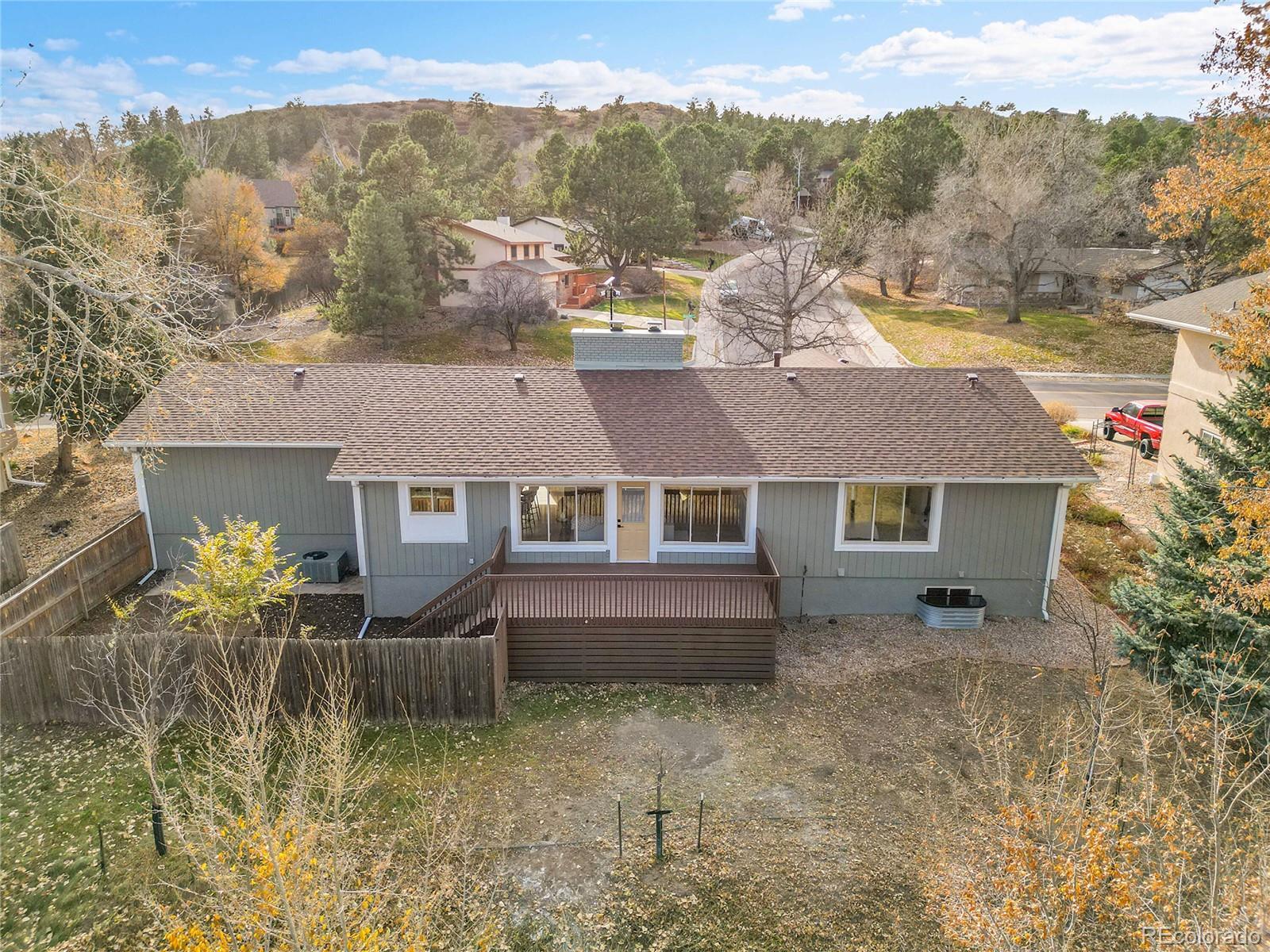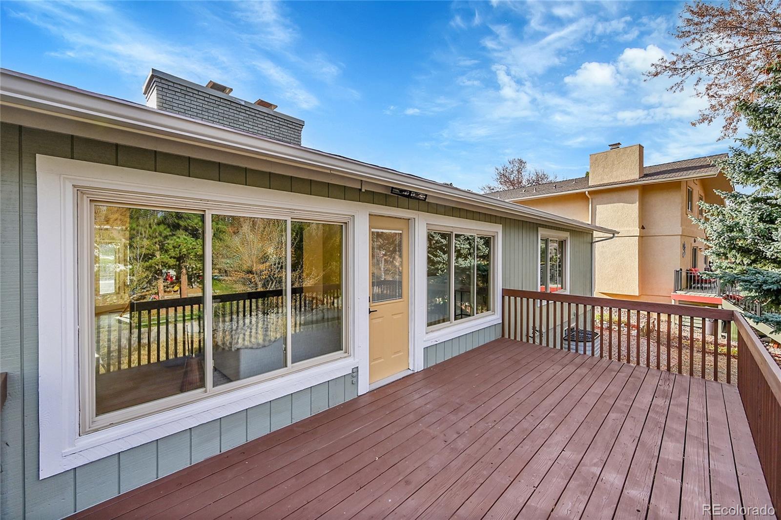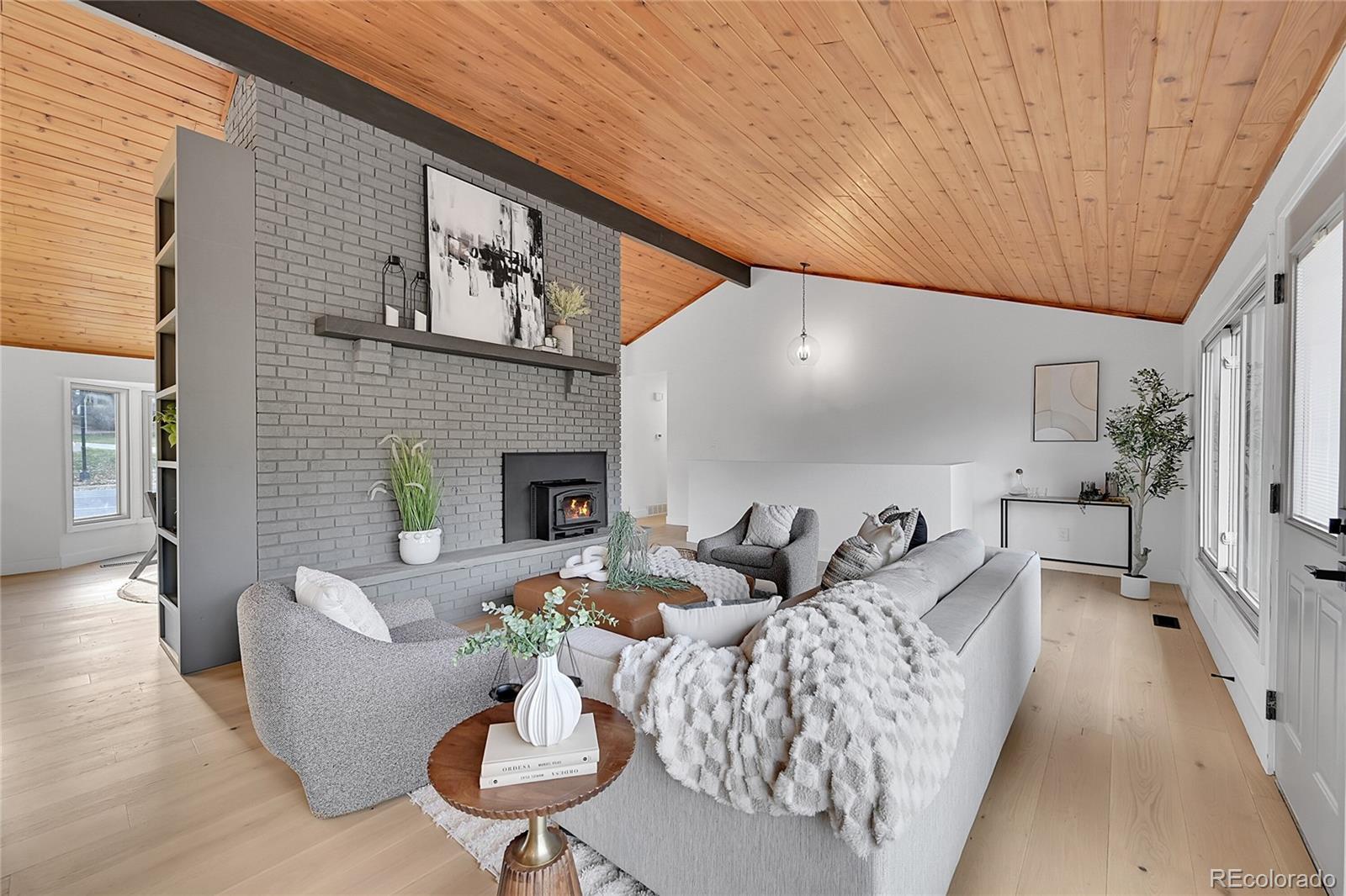In the heart of Rockrimmon, this updated home blends architectural character with modern design. The entry opens to a vaulted great room with exposed beams, and wide-plank engineered wood floors. A dual-sided brick wall separates the entry and living space, featuring a fireplace on one side and a wood-burning stove on the other. The open floor plan connects the great room, living room, dining area, and a gourmet kitchen with a six-burner gas range, quartz countertops, custom cabinetry and tilework — perfect for gatherings or everyday living. Three bedrooms and two baths are on the main level, including a private primary suite with attached bath. The finished basement adds a fourth bedroom, full bath, laundry, and spacious family room. Outside, enjoy the wood deck, mature trees, and a fully enclosed section ideal for pets or outdoor living. The oversized garage provides extra storage and parking. Close to trails, shopping, and D-20 schools. Updates Include: New roof, electrical panel, engineered hardwood flooring, carpet, kitchen cabinets, quartz counters, tile backsplash, appliances, interior and exterior paint, bath tile and vanities, plumbing fixtures, electrical fixtures, doors, and trim. All information deemed reliable but not guaranteed. Buyer and buyer’s agent to verify.