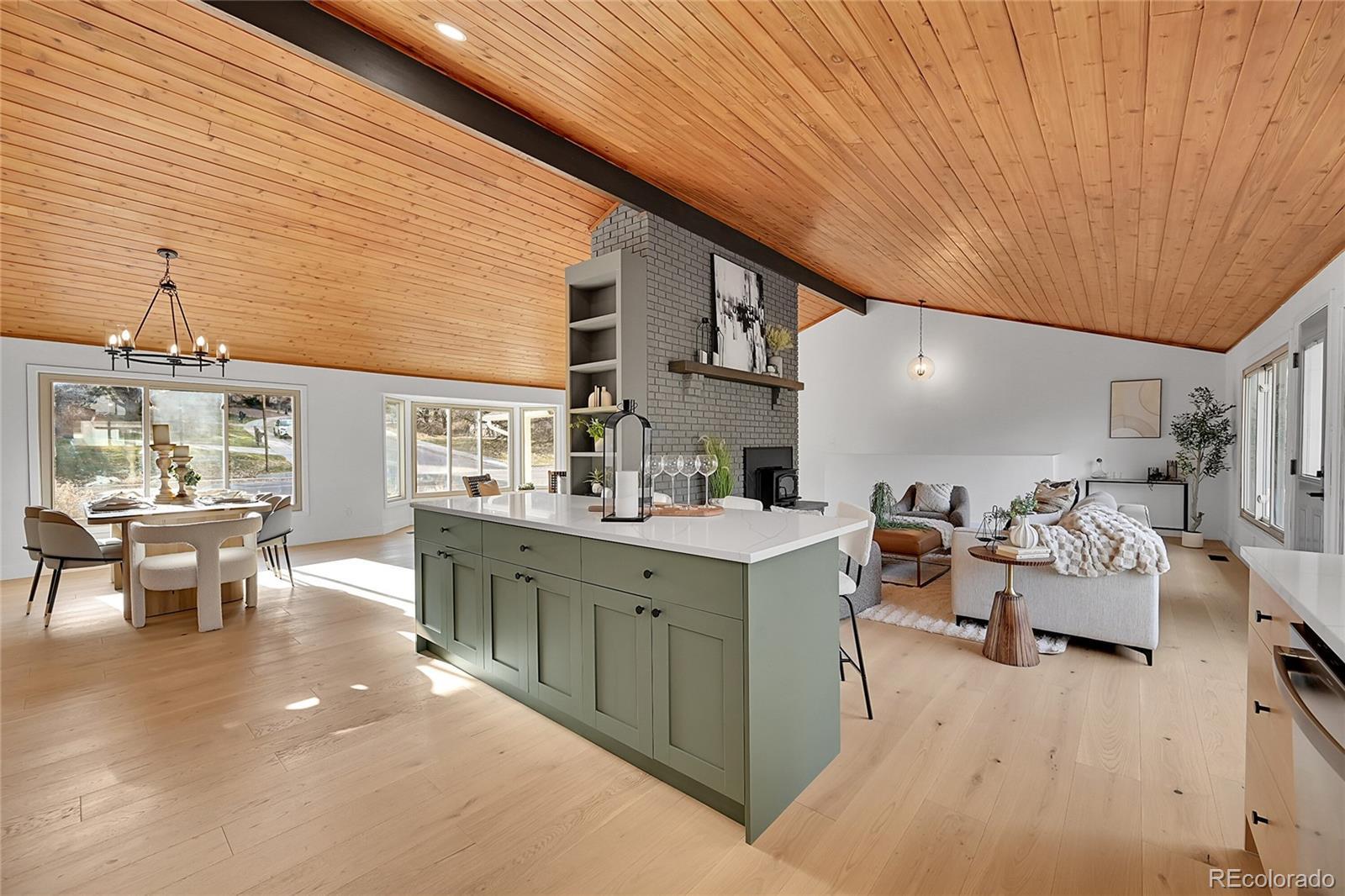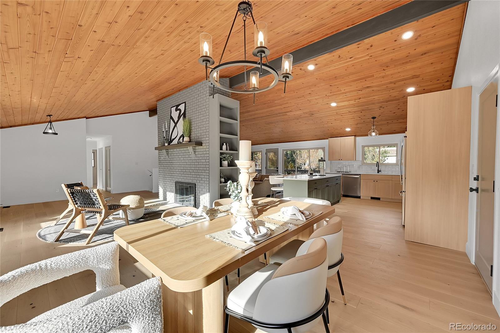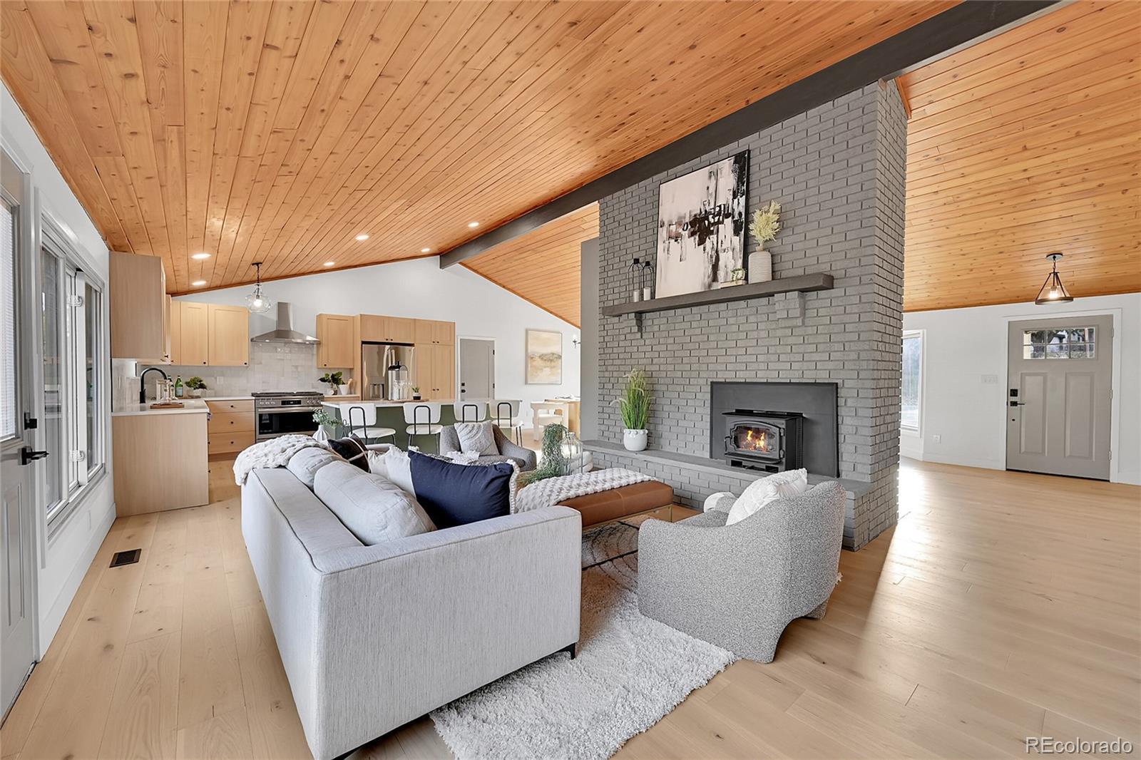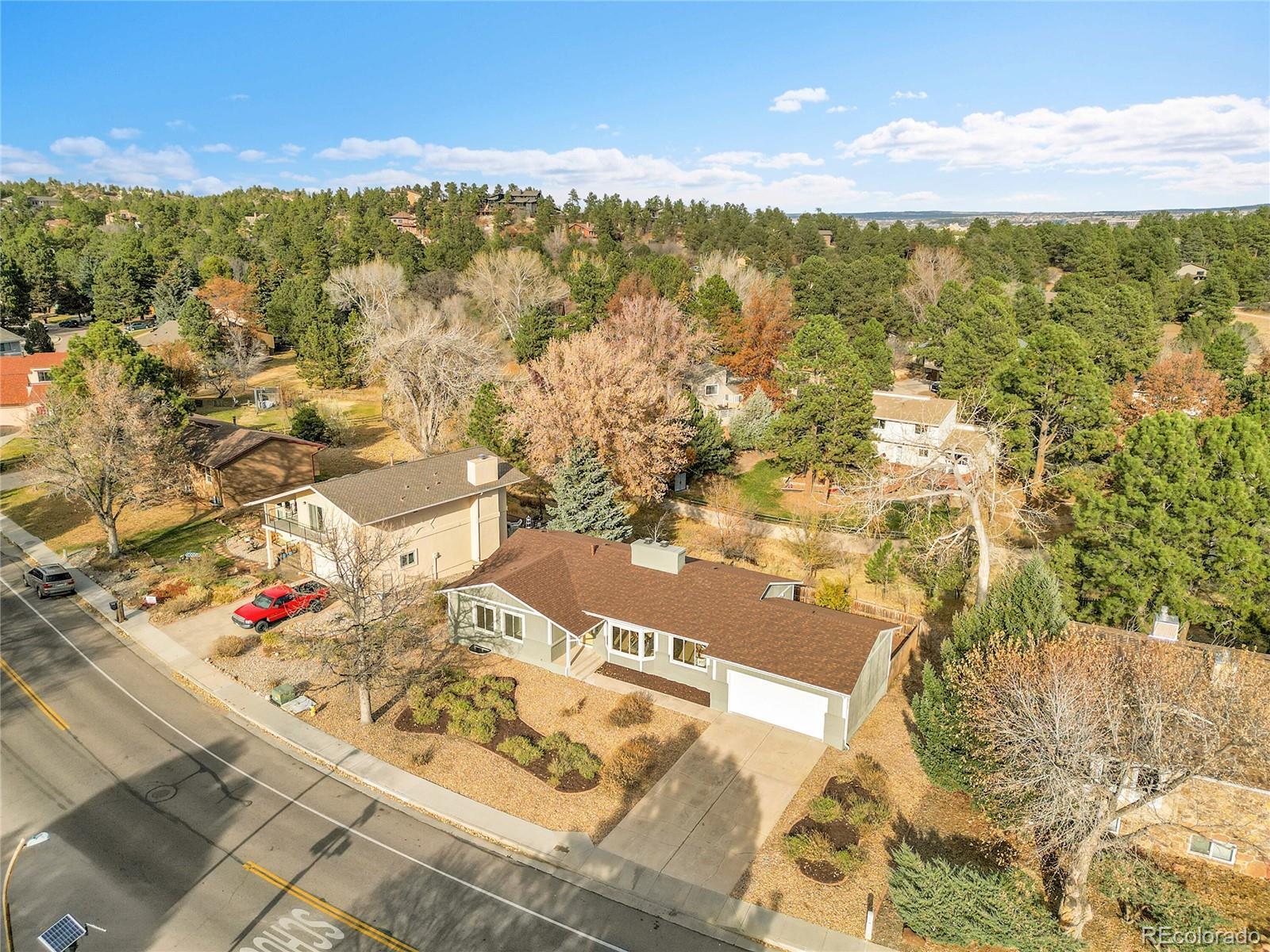 In the heart of Rockrimmon, this updated home blends architectural character with modern design. The entry opens to a vaulted great room with exposed beams, and wide-plank engineered wood floors. A dual-sided brick wall separates the entry and living space, featuring a fireplace on one side and a wood-burning stove on the other. The open floor plan connects the great room, living room, dining area, and a gourmet kitchen with a six-burner gas range, quartz countertops, custom cabinetry and tilework — perfect for gatherings or everyday living. Three bedrooms and two baths are on the main level, including a private primary suite with attached bath. The finished basement adds a fourth bedroom, full bath, laundry, and spacious family room. Outside, enjoy the wood deck, mature trees, and a fully enclosed section ideal for pets or outdoor living. The oversized garage provides extra storage and parking. Close to trails, shopping, and D-20 schools. Updates Include: New roof, electrical panel, engineered hardwood flooring, carpet, kitchen cabinets, quartz counters, tile backsplash, appliances, interior and exterior paint, bath tile and vanities, plumbing fixtures, electrical fixtures, doors, and trim. All information deemed reliable but not guaranteed. Buyer and buyer’s agent to verify.