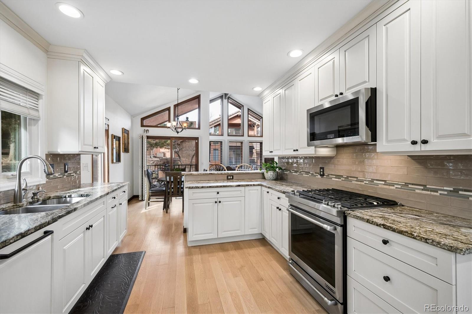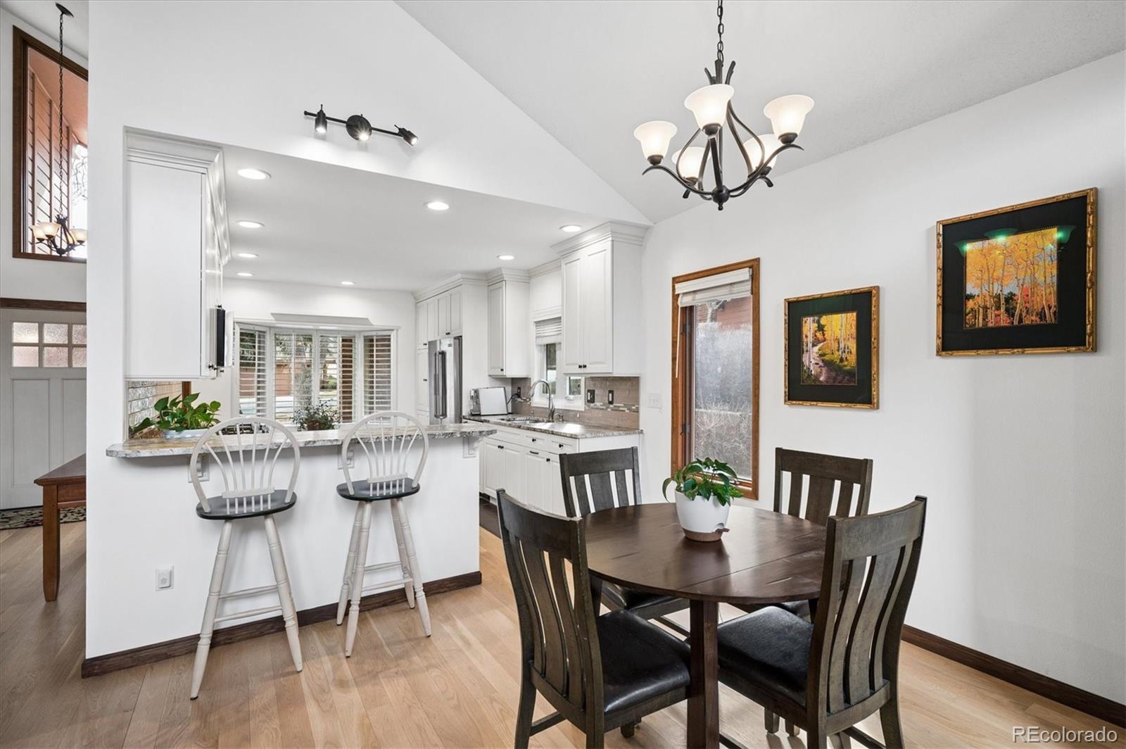 Beautifully renovated Dakotah townhome with vaulted ceilings and abundance of windows for plenty of light in a resort community! One of the larger town homes bordering the Red Rocks Country Club, this residence shows like a model with a sophisticated blend of comfort and design. This home has 3 Bedrooms, 4 Bathrooms, and approximately 2,400 square feet. Main floor Primary Suite features a luxurious five-piece bath, a deep soaking tub, and an spa-inspired steam shower. Elegant new front door and side light with new hard wood floors and 18-foot ceilings. Additional main floor details: Dining Room, Living Room, Kitchen, 2 Baths, Laundry room, and Two new Outdoor Decks. Elegant all new kitchen with fantastic natural light. Enjoy new windows, leathered granite countertops, custom cabinetry, upgraded hardware, and lighting. New JennAir appliances: gas range/oven, microwave, refrigerator, and dishwasher. Wide-plank White Oak hardwood floors, plantation shutters, updated fixtures, and a peaceful wood-burning fireplace. Two upstairs bedrooms share a new full bathroom with custom granite countertops, vanity, floors, hardware, lighting, and modern fixtures. Fantastic newly finished basement with luxury vinyl plank flooring, 3/4 bathroom, and storage space. The fireplace and white walls make this a very inviting and comfortable room to relax and watch sporting events. Mechanical updates: a high-efficiency Lennox furnace, air conditioner, new electrical panel, electric vehicle charging, Reverse Osmosis Water Filtration, and upgraded Blown Insulation for year-round comfort. Two new composite decks to relax and enjoy the neighborhood deer. The Home is just steps from the Red Rocks Country Club and is tucked in between the eighth and ninth holes. Residents also have access to over 800 acres of private open space for hiking and biking. South-facing 2-car garage with room for a golf cart. This home is meticulously maintained and delivers a true move-in-ready experience.