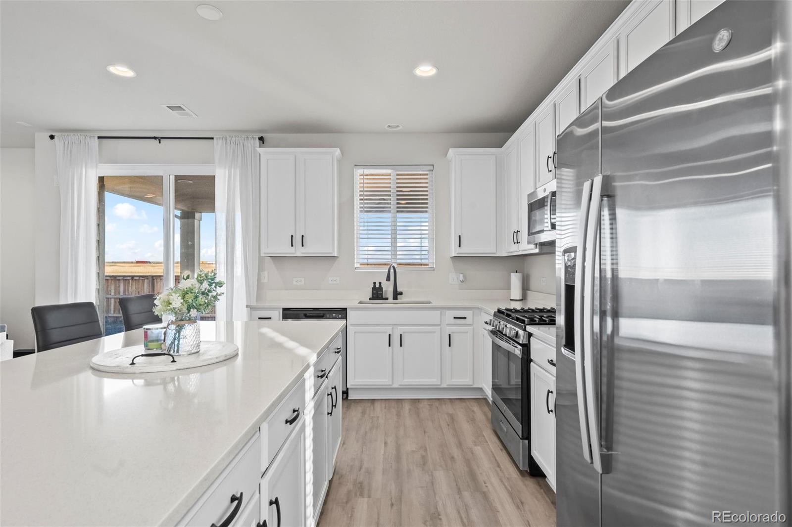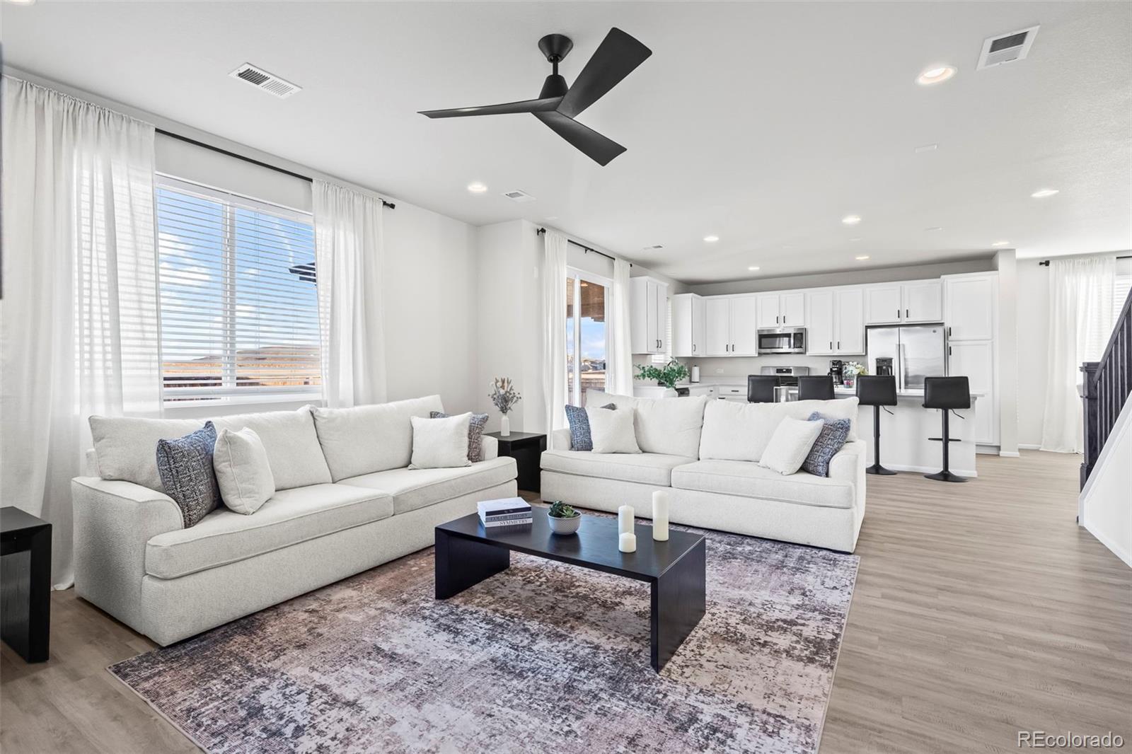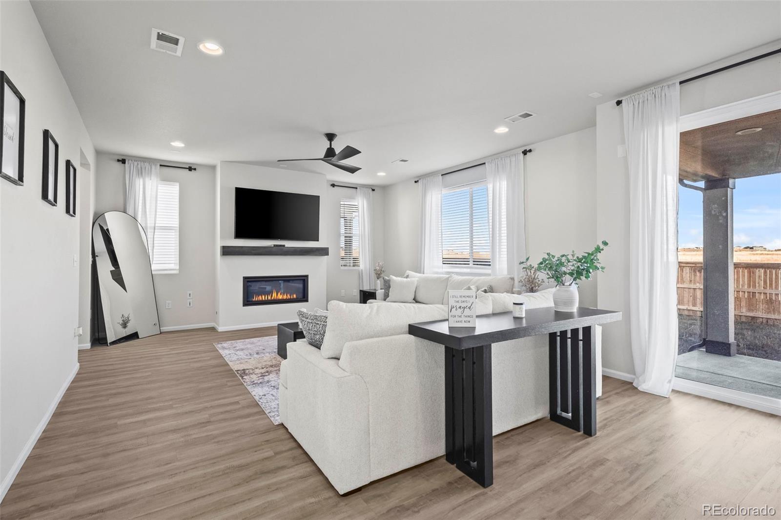 This two-story home is a must-see! The main level features an inviting great room with an electric fireplace and access to the covered patio, perfect for relaxing or entertaining. The bright office with French door offers the ideal workspace, while the gorgeous eat-in kitchen shines with white cabinets, quartz countertops, stainless steel appliances including a gas range, and a large center island that flows seamlessly into the dining area and family room. Upstairs, you’ll find the primary suite with a beautiful bathroom featuring quartz counters, dual sinks, a walk-in shower, and a walk-in closet. The upper level also includes a versatile loft, a conveniently located laundry room with extra storage space, two secondary bedrooms, and a full bathroom. Enjoy the outdoors with a covered front porch and a fully fenced backyard with a covered patio. This home is located near neighborhood parks, Second Creek Trails, and grocery shopping, with quick access to E-470 for easy commuting to DIA or Denver. This move-in ready home perfectly combines style, function, and convenience—don’t miss the opportunity to make it yours!