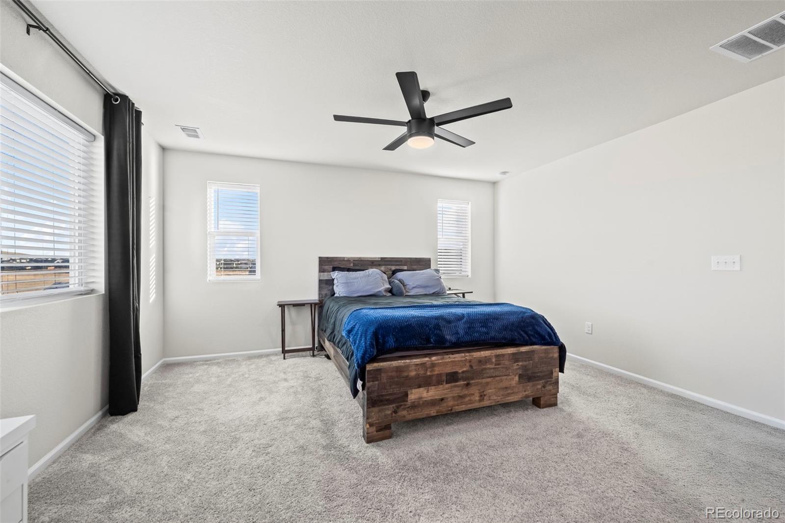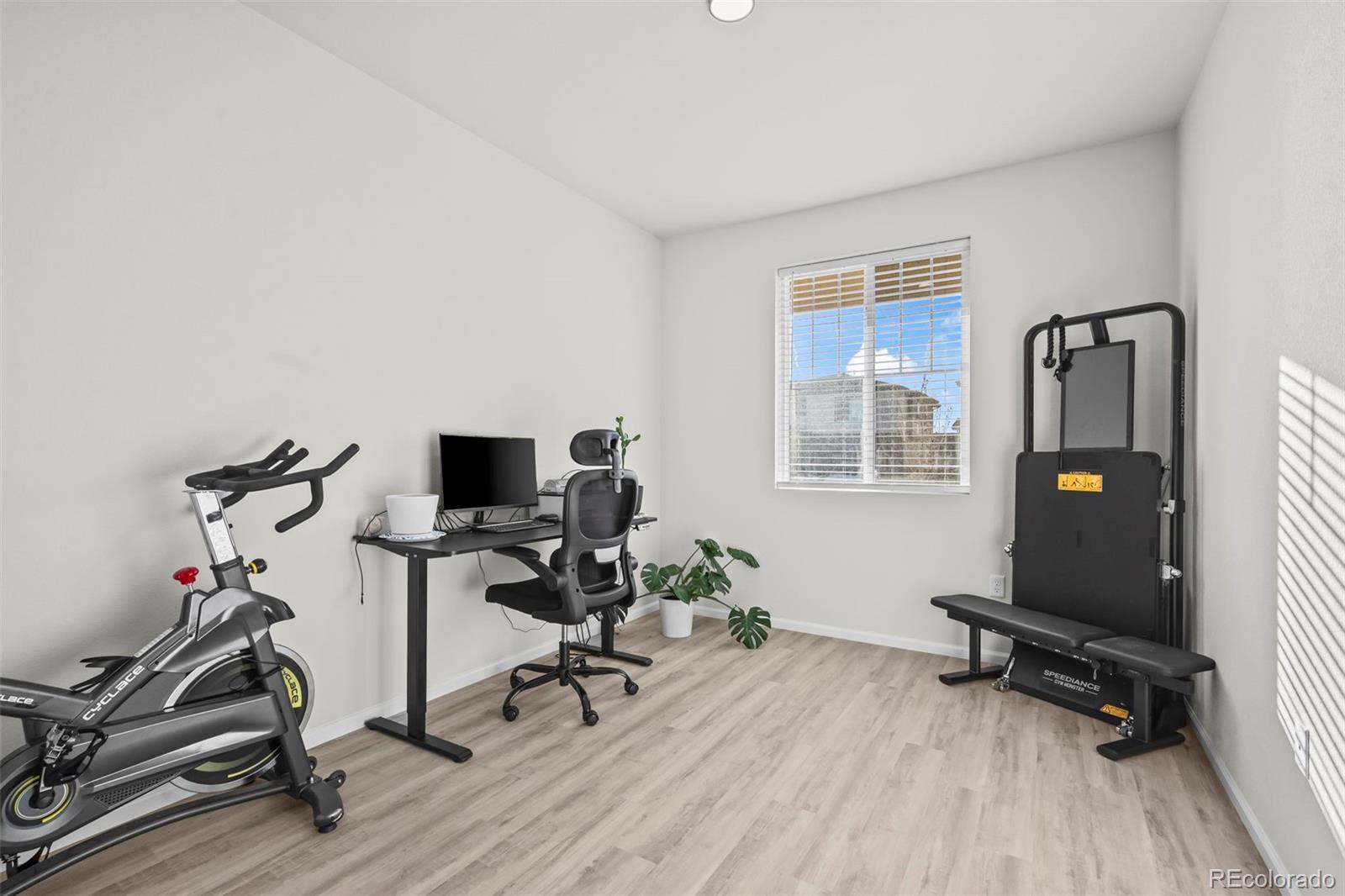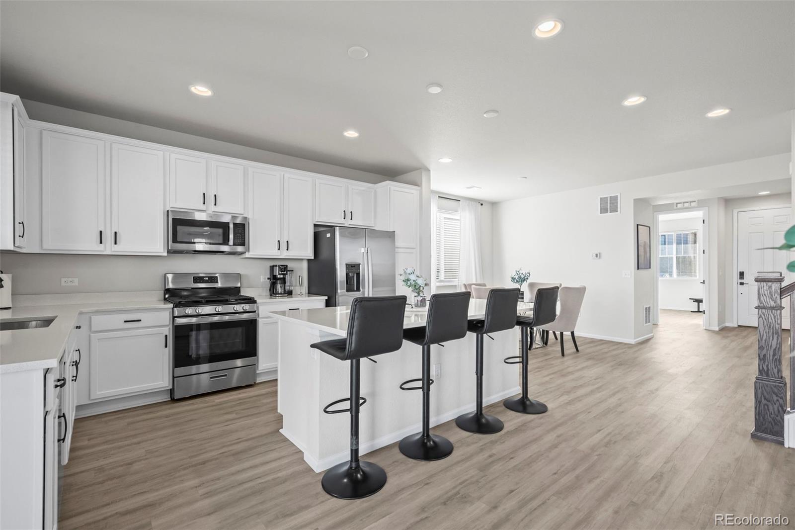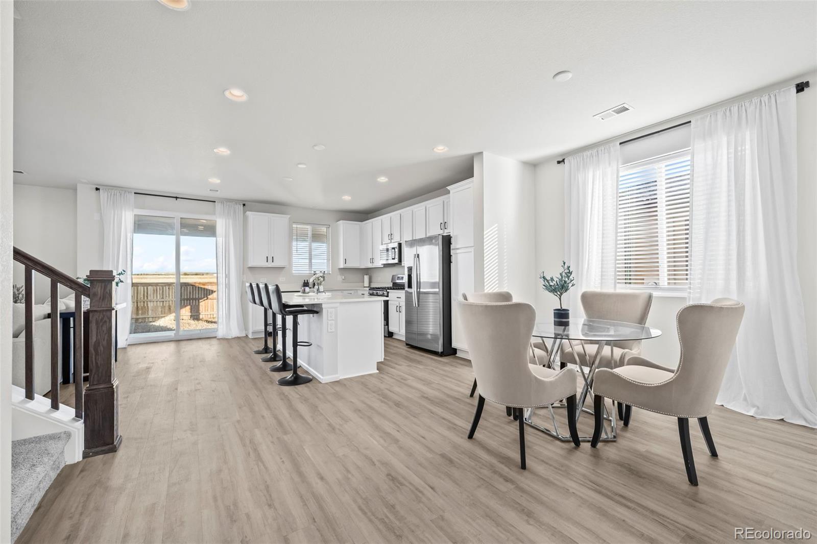 This two-story home is a must-see! The main level features an inviting great room with an electric fireplace and access to the covered patio, perfect for relaxing or entertaining. The bright office with French door offers the ideal workspace, while the gorgeous eat-in kitchen shines with white cabinets, quartz countertops, stainless steel appliances including a gas range, and a large center island that flows seamlessly into the dining area and family room. Upstairs, you’ll find the primary suite with a beautiful bathroom featuring quartz counters, dual sinks, a walk-in shower, and a walk-in closet. The upper level also includes a versatile loft, a conveniently located laundry room with extra storage space, two secondary bedrooms, and a full bathroom. Enjoy the outdoors with a covered front porch and a fully fenced backyard with a covered patio. This home is located near neighborhood parks, Second Creek Trails, and grocery shopping, with quick access to E-470 for easy commuting to DIA or Denver. This move-in ready home perfectly combines style, function, and convenience—don’t miss the opportunity to make it yours!