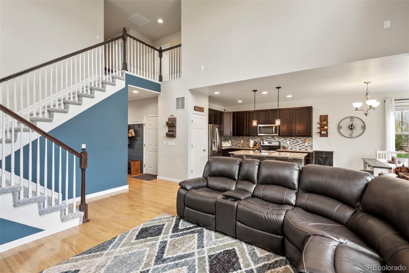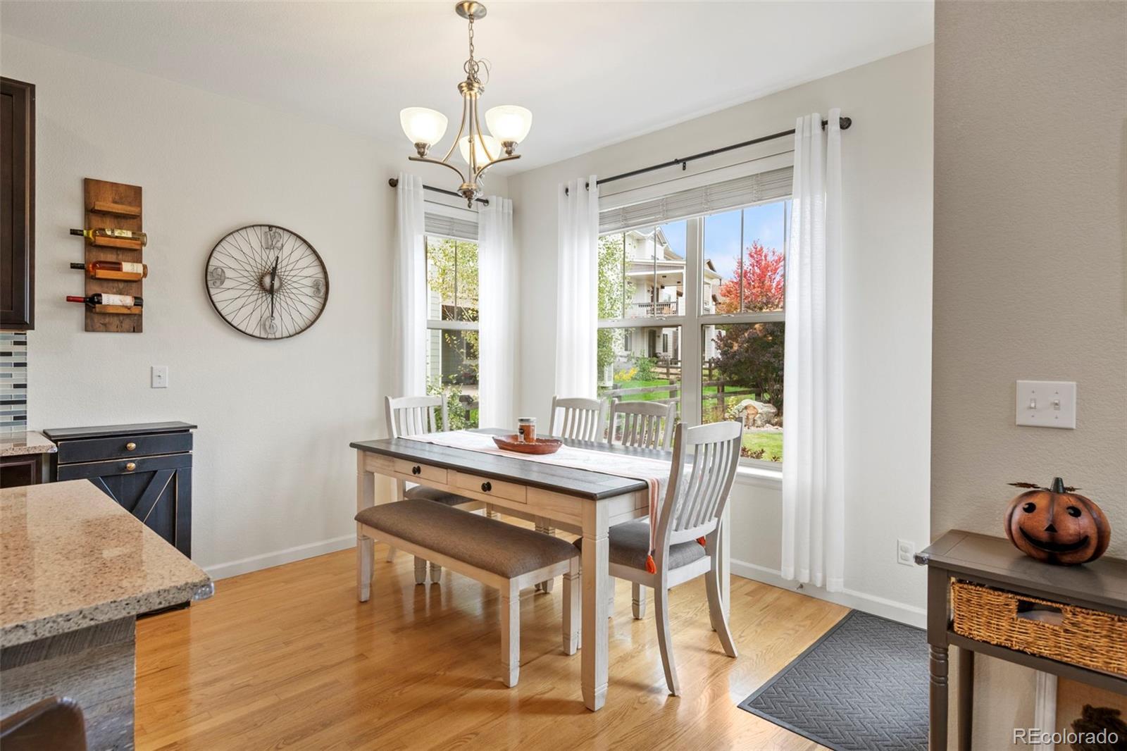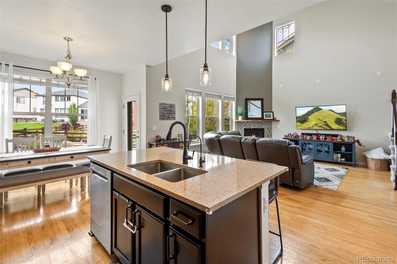 Beautiful bright, open, modern home. Natural sun melt on snowy days for your sidewalk and driveway. Fun sitting on your covered front porch with the wood rail watching the kids playing and neighbors taking a walk & watching birds flying. Retreat to the low maintenance open backyard with patio and built in fire pit. So nice having a 3 car tandem garage with lots of built in shelves. The great room an open kitchen offer nice entertainment space with high ceilings, gas fireplace, and ample seating at the granite kitchen breakfast bar. The well designed Leyden Rock subdivision has many community parks, one just a block away with plenty of open space, community pool, and a uniquely designed playground. The open basement leaves plenty of room for expansion to meet your own unique ideas. Come and see this beautifully designed home that you would be very happy to call your home!
