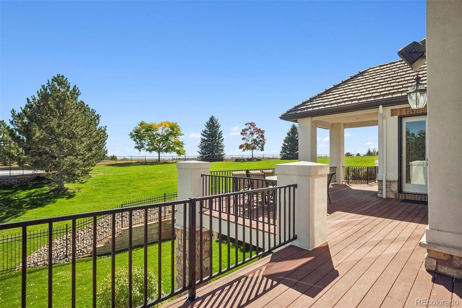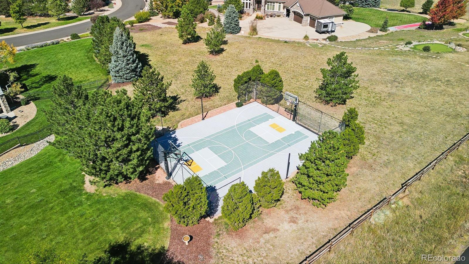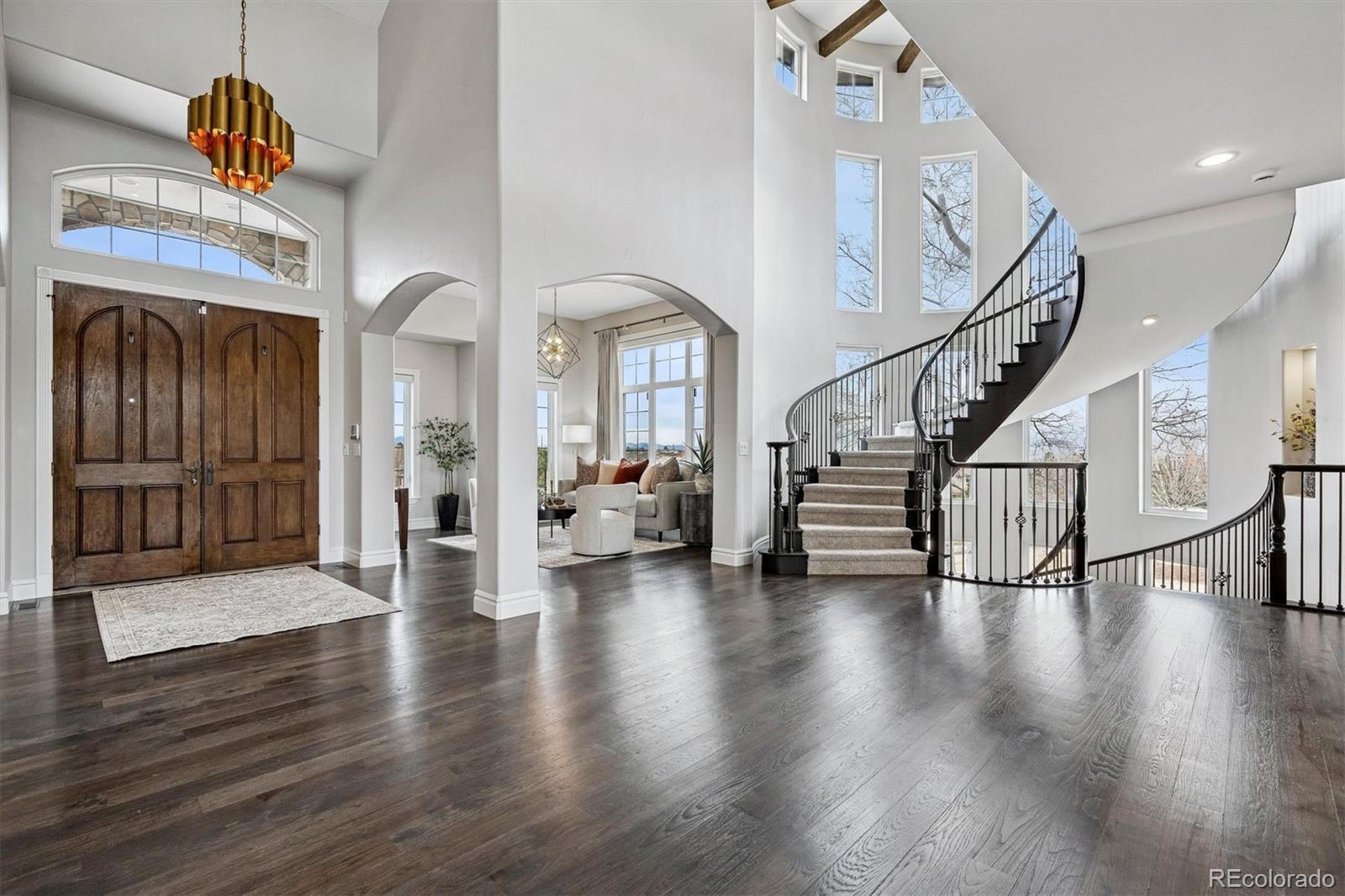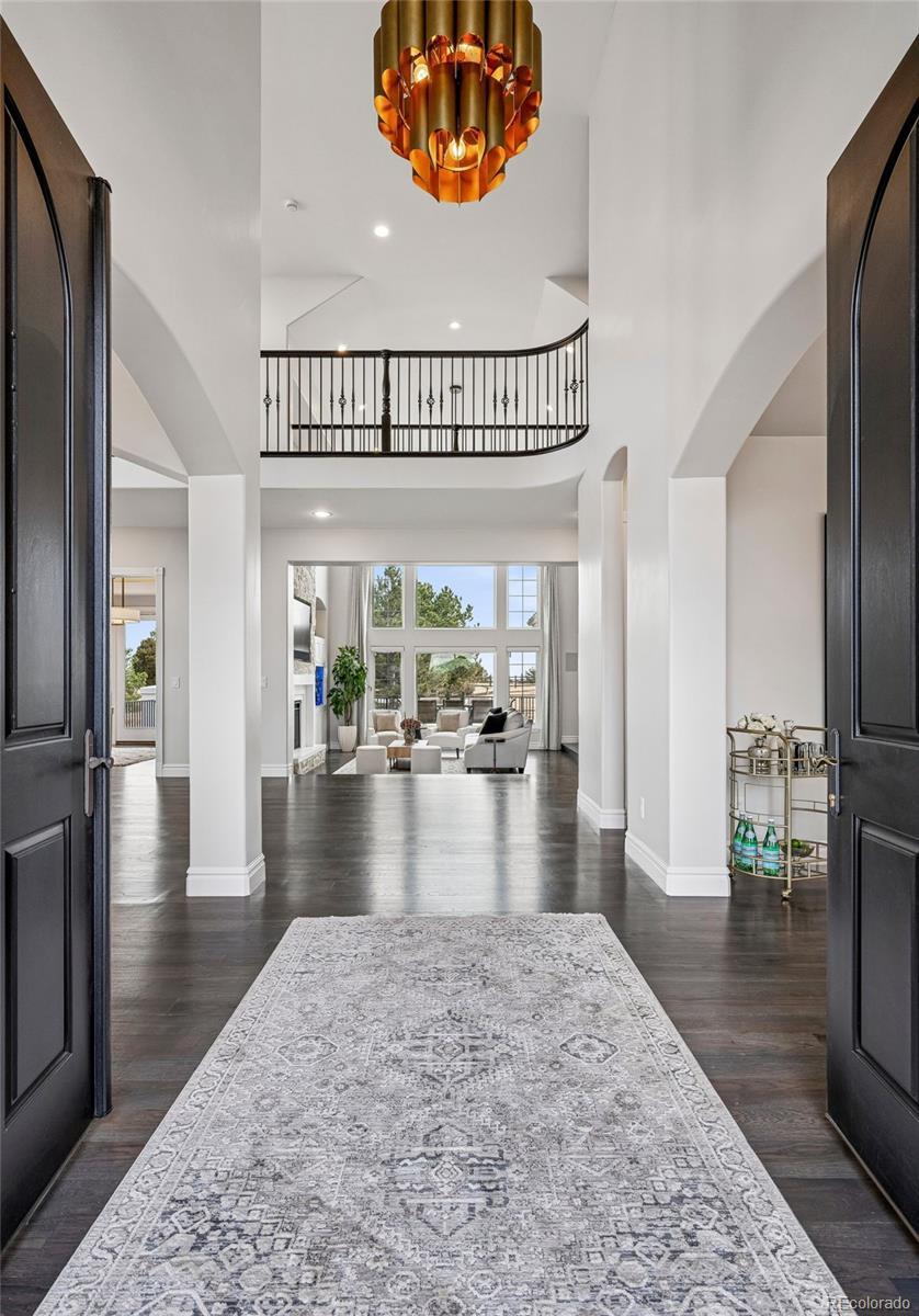 This is a rare opportunity to own a meticulously renovated estate that seamlessly blends luxury, comfort, and unforgettable views. Tucked away at the end of a quiet cul-de-sac on nearly 2.5 acres, this extraordinary property is the epitome of elevated Colorado living. Set against sweeping mountain views, the grounds are designed for both recreation and relaxation, featuring a sport court with basketball and pickleball, and large deck and outdoor entertaining spaces. Interior architectural details include soaring ceilings, a curved staircase, and striking wood beams that frame the stunning natural backdrop. The open floor plan showcases updated lighting, extended hardwood flooring, and muted paint hues. In the past year alone, the home has undergone a $500,000+ renovation, with a new kitchen, four new bathrooms, redesigned laundry room, upgraded theater equipment, new hardwoods up and new carpeting down. Additional major improvements include an expanded primary suite with the removal of an outdated spiral staircase, and the addition of an exterior staircase connecting the upper deck to the lower level. The two-story Great Room is a showstopper with floor-to-ceiling windows, a fireplace, and hearth. The kitchen is a chef’s dream, featuring Viking double ovens, a BlueStar eight-burner gas cooktop, two dishwashers, espresso bar, oversized center island, breakfast nook, butler’s pantry with wine cooler, and a walk-in pantry. A luxurious primary suite offers a sitting area, gas fireplace, and sumptuous new spa-like bathroom with an oversized Carrera marble shower and soaking tub. The charming study and living room, both with picturesque mountain views, complete the main level. Upstairs, a wide staircase leads to all-new hardwood flooring, loft and three en-suite bedrooms, each with brand-new bathrooms and walk-in closets. The walkout lower level is an entertainer’s paradise, featuring a wet bar, wine room, theater, bonus room with steam room, and a private guest suite.