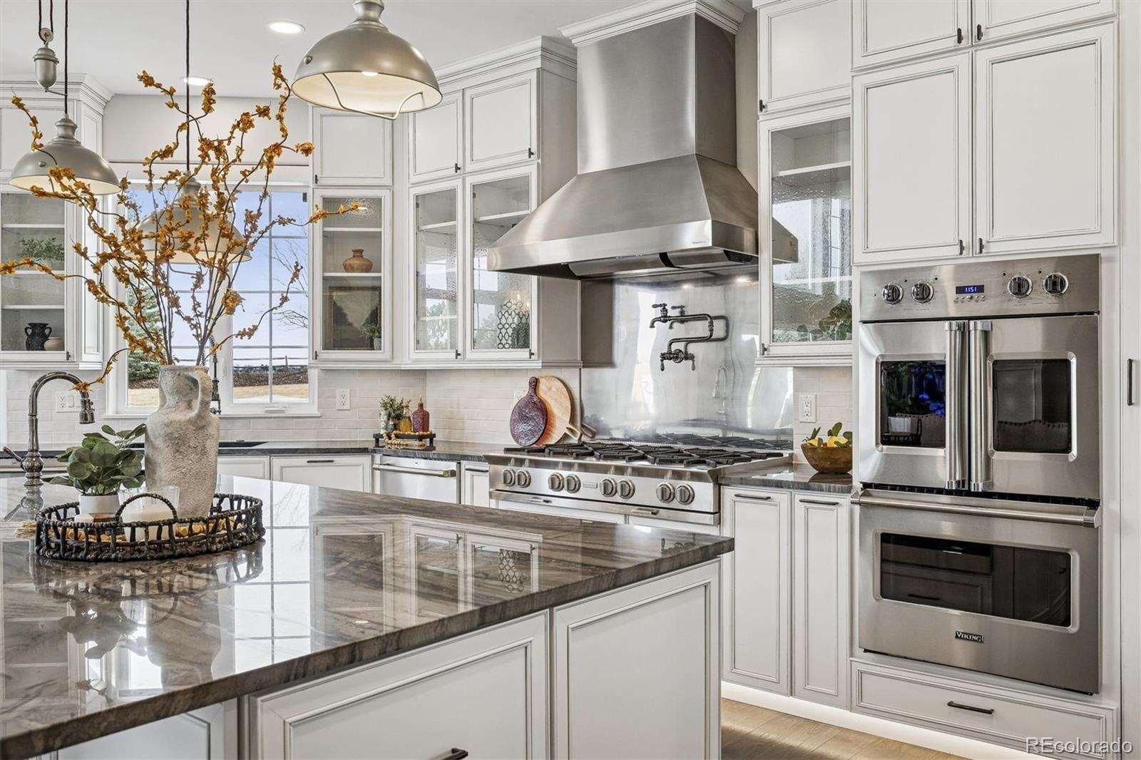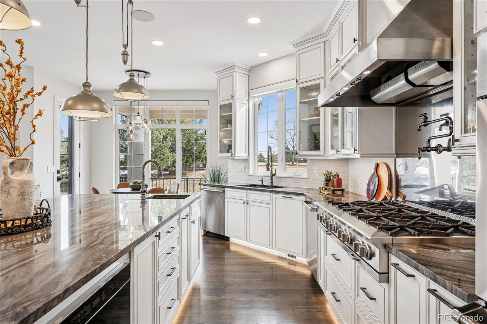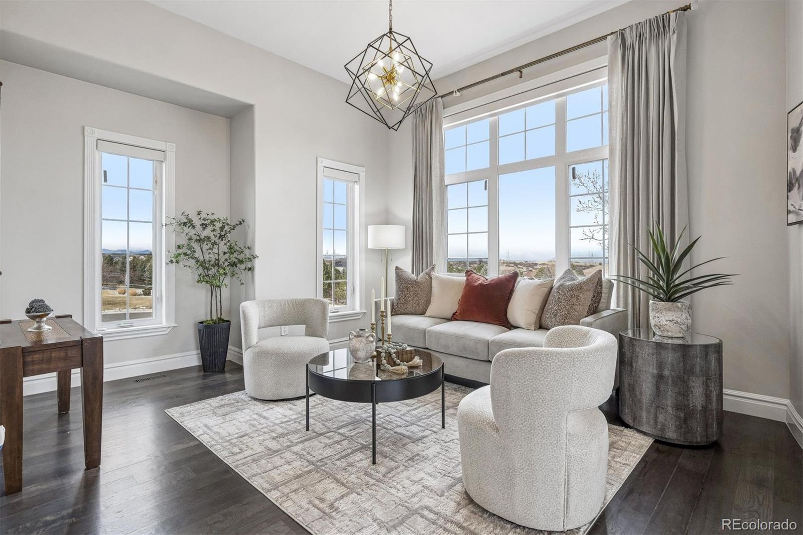 This is a rare opportunity to own a meticulously renovated estate that seamlessly blends luxury, comfort, and unforgettable views. Tucked away at the end of a quiet cul-de-sac on nearly 2.5 acres, this extraordinary property is the epitome of elevated Colorado living. Set against sweeping mountain views, the grounds are designed for both recreation and relaxation, featuring a sport court with basketball and pickleball, and large deck and outdoor entertaining spaces. Interior architectural details include soaring ceilings, a curved staircase, and striking wood beams that frame the stunning natural backdrop. The open floor plan showcases updated lighting, extended hardwood flooring, and muted paint hues. In the past year alone, the home has undergone a $500,000+ renovation, with a new kitchen, four new bathrooms, redesigned laundry room, upgraded theater equipment, new hardwoods up and new carpeting down. Additional major improvements include an expanded primary suite with the removal of an outdated spiral staircase, and the addition of an exterior staircase connecting the upper deck to the lower level. The two-story Great Room is a showstopper with floor-to-ceiling windows, a fireplace, and hearth. The kitchen is a chef’s dream, featuring Viking double ovens, a BlueStar eight-burner gas cooktop, two dishwashers, espresso bar, oversized center island, breakfast nook, butler’s pantry with wine cooler, and a walk-in pantry. A luxurious primary suite offers a sitting area, gas fireplace, and sumptuous new spa-like bathroom with an oversized Carrera marble shower and soaking tub. The charming study and living room, both with picturesque mountain views, complete the main level. Upstairs, a wide staircase leads to all-new hardwood flooring, loft and three en-suite bedrooms, each with brand-new bathrooms and walk-in closets. The walkout lower level is an entertainer’s paradise, featuring a wet bar, wine room, theater, bonus room with steam room, and a private guest suite.