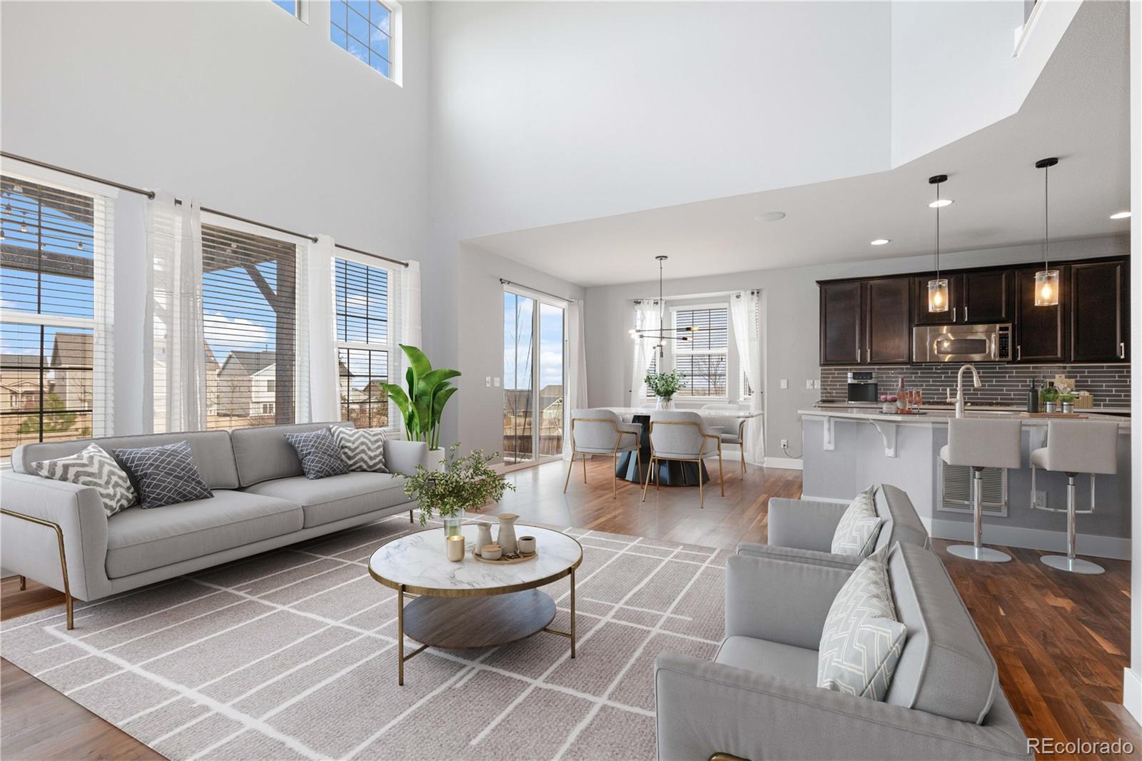 Step inside this sun-filled, spacious home where comfort meets style. The open layout and extended hardwood floors freshly refinished in 2025 flow seamlessly from the gourmet kitchen to the living and dining areas, perfect for everyday life or hosting friends. The large kitchen features a generous island, stone countertops, 42" cabinets, and a pantry while guests relax nearby. The living room soars with a double-height ceiling, a cozy gas fireplace, and built-in surround sound for movie nights or music. Flexible main-level spaces include a private office and a front room that can serve as a formal dining area, sitting room, or playroom. Upstairs, four spacious bedrooms await, including one with a private ensuite and a luxurious primary suite with a five-piece bath and walk-in closet. Upper-level laundry and ample storage keep life organized. The finished basement is made for fun, featuring a wet bar, media or game space, an additional bedroom, full bath, and an infrared sauna, plus extra unfinished space for storage or projects. Step outside to a backyard made for entertaining or relaxing with a covered patio, raised garden bed, grassy area, and no neighbors behind. Complete with a three-car tandem garage, neighborhood park and pool, Cherry Creek schools, and a prime location minutes from Southlands Mall, E-470, and DIA, this home combines style, comfort, and convenience and is designed to make life easier and more enjoyable.