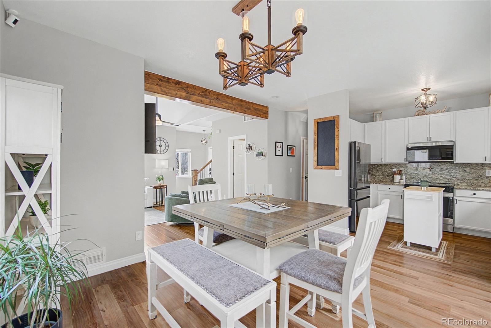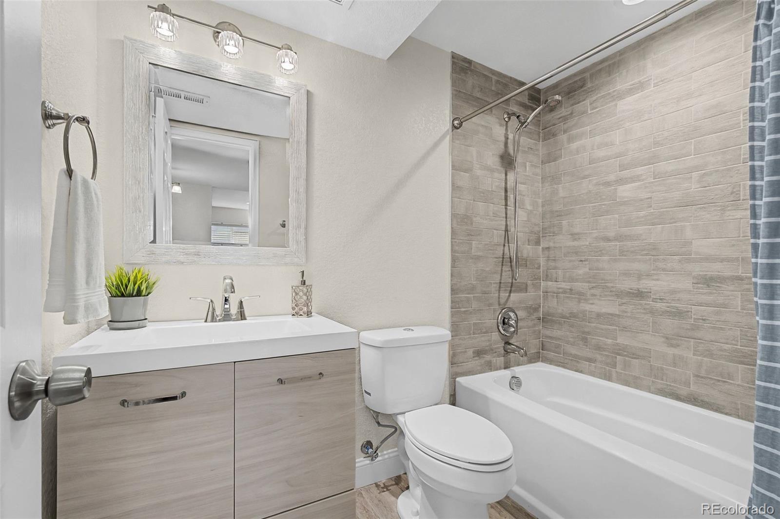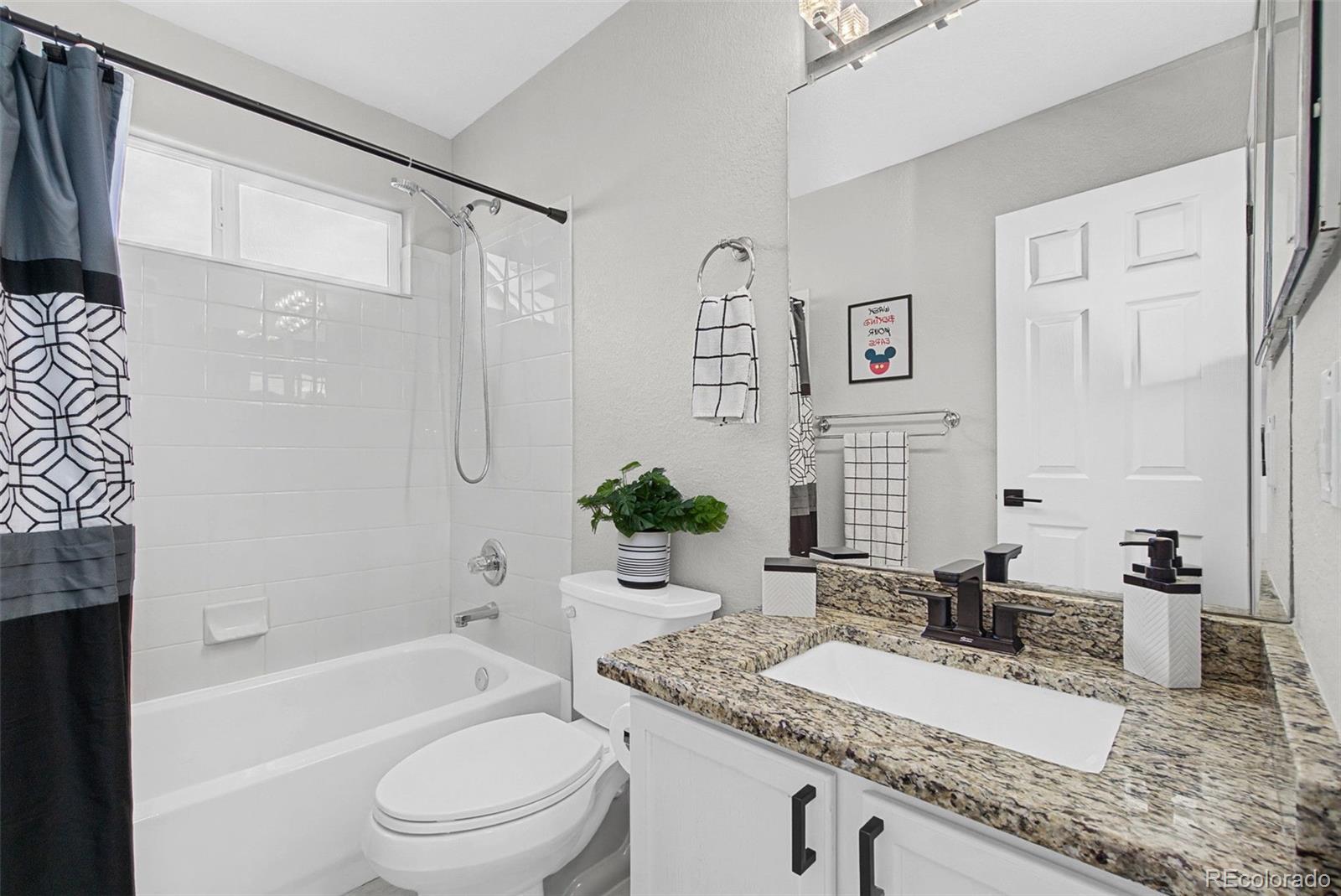 This beautifully remodeled 4-bedroom, 3.5-bath home is truly turn-key, featuring modern finishes, custom lighting, and an open, light-filled layout with new, beautiful luxury vinyl flooring throughout, including the basement. The main level offers a bright, airy feel that’s both comfortable and elevated. The kitchen shines with granite countertops and new appliances (2025), while the dedicated dining area opens seamlessly to both the kitchen and living room, making everyday living and entertaining effortless. Upstairs, you’ll find a relaxing primary suite with a five-piece ensuite bath, along with two additional bedrooms and a convenient upstairs laundry with a new washer and dryer included (2024). Downstairs, the remodeled, finished basement adds even more flexibility with a family room, bedroom, and full bathroom, ideal for guests, hobbies, or working from home. Major systems have been updated with a new A/C (2023), furnace (2023), and water heater (2025), plus fresh exterior paint for peace of mind. Enjoy time outdoors on the new flagstone patio. New cedar fence (2024). Plenty of room for your toys in the two-car garage with suspended overhead storage and dedicated electric car charging component (220V). The HOA covers trash, recycling, front lawn care, and snow removal, making life easy. All of this is in a prime location near parks, dining, shopping, and quick access to I-25.