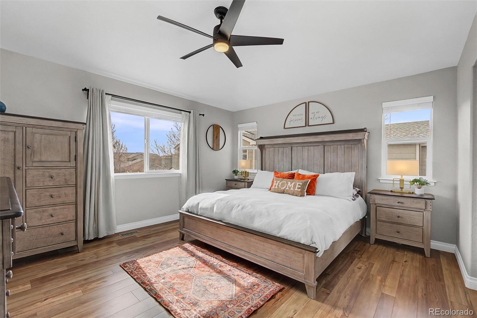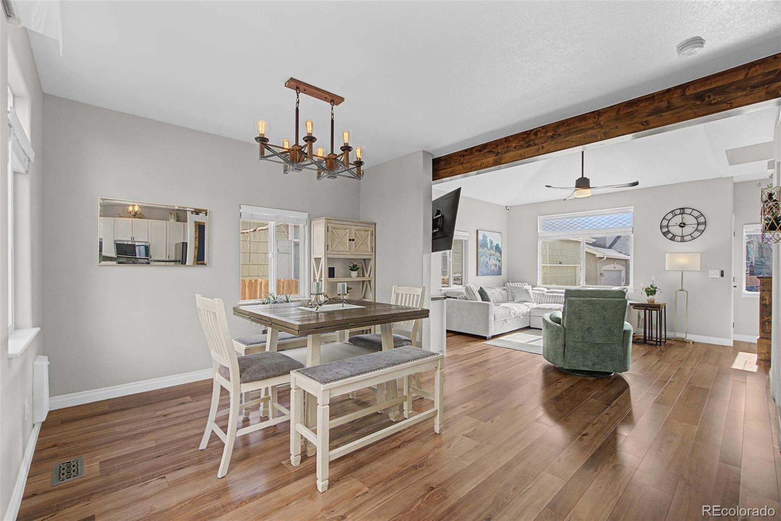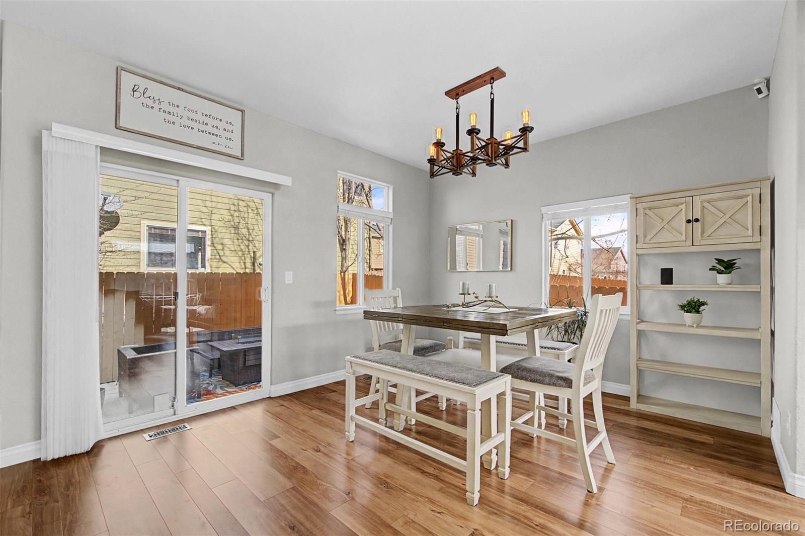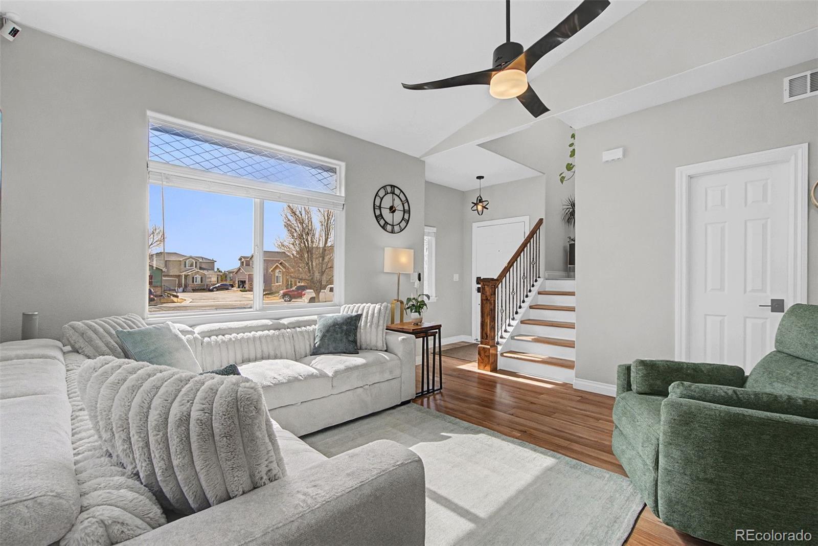 This beautifully remodeled 4-bedroom, 3.5-bath home is truly turn-key, featuring modern finishes, custom lighting, and an open, light-filled layout with new, beautiful luxury vinyl flooring throughout, including the basement. The main level offers a bright, airy feel that’s both comfortable and elevated. The kitchen shines with granite countertops and new appliances (2025), while the dedicated dining area opens seamlessly to both the kitchen and living room, making everyday living and entertaining effortless. Upstairs, you’ll find a relaxing primary suite with a five-piece ensuite bath, along with two additional bedrooms and a convenient upstairs laundry with a new washer and dryer included (2024). Downstairs, the remodeled, finished basement adds even more flexibility with a family room, bedroom, and full bathroom, ideal for guests, hobbies, or working from home. Major systems have been updated with a new A/C (2023), furnace (2023), and water heater (2025), plus fresh exterior paint for peace of mind. Enjoy time outdoors on the new flagstone patio. New cedar fence (2024). Plenty of room for your toys in the two-car garage with suspended overhead storage and dedicated electric car charging component (220V). The HOA covers trash, recycling, front lawn care, and snow removal, making life easy. All of this is in a prime location near parks, dining, shopping, and quick access to I-25.