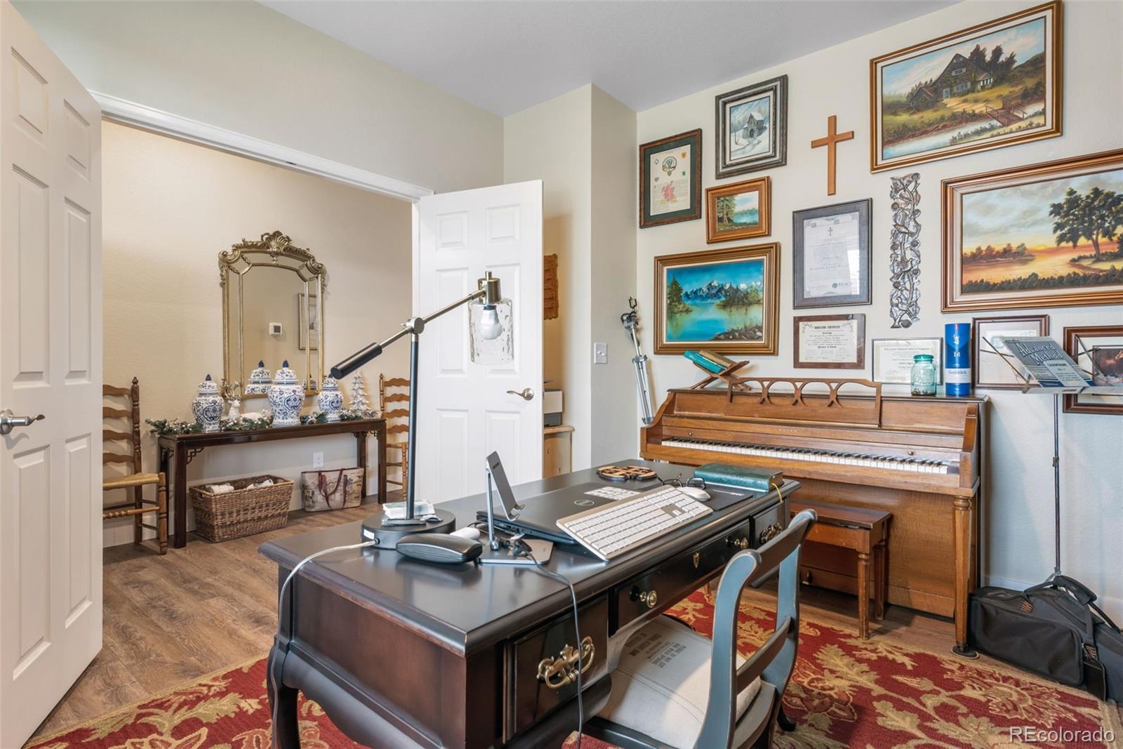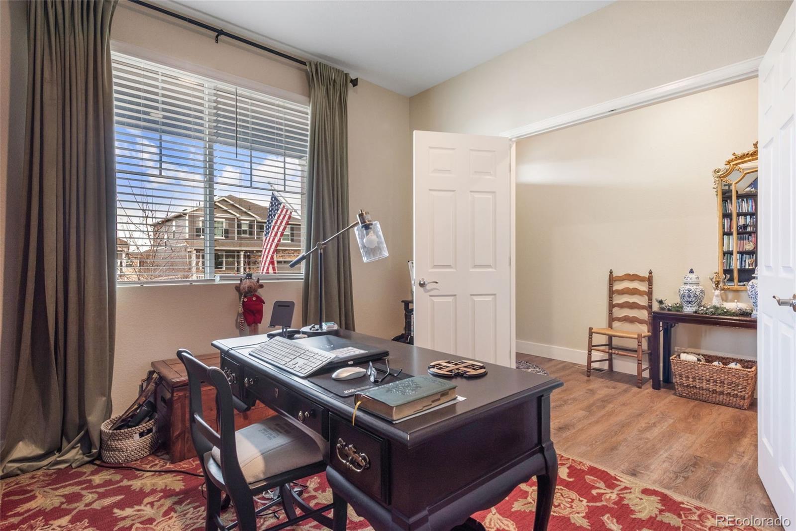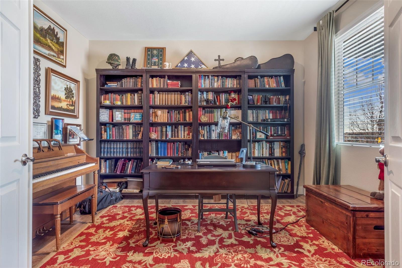Welcome to 5955 Plains End Court in Crystal Valley Ranch, a beautifully maintained Castle Rock home that blends timeless curb appeal with functional living and exceptional work from home space. This two story home immediately impresses with stone accents, covered front porch, and a welcoming entry that sets the tone for comfort and quality throughout. Inside, you will find a true dedicated home office that stands out from the moment you walk in. With hardwood flooring, natural light, and space for a full executive desk, piano, and custom shelving, this office is ideal for remote work, creative pursuits, or a private study. French doors provide separation while still allowing light to flow, creating a professional yet warm environment rarely found in homes at this price point. The open concept main level flows effortlessly into the kitchen and living area, making everyday living and entertaining easy and inviting. Upstairs, the spacious primary suite offers a calm retreat with soft natural light and generous closet space, while additional bedrooms provide flexibility for guests, hobbies, or fitness space. The upstairs layout includes a wide hallway that enhances the open feel and functionality of the second level. Step outside to enjoy the custom concrete patio and outdoor living area, thoughtfully designed for relaxation and entertaining. This space offers room for seating, grilling, and outdoor gatherings while overlooking a large usable backyard with privacy fencing. Whether you are enjoying morning coffee, hosting summer barbecues, or unwinding in the evening, this backyard delivers true Colorado indoor outdoor living.