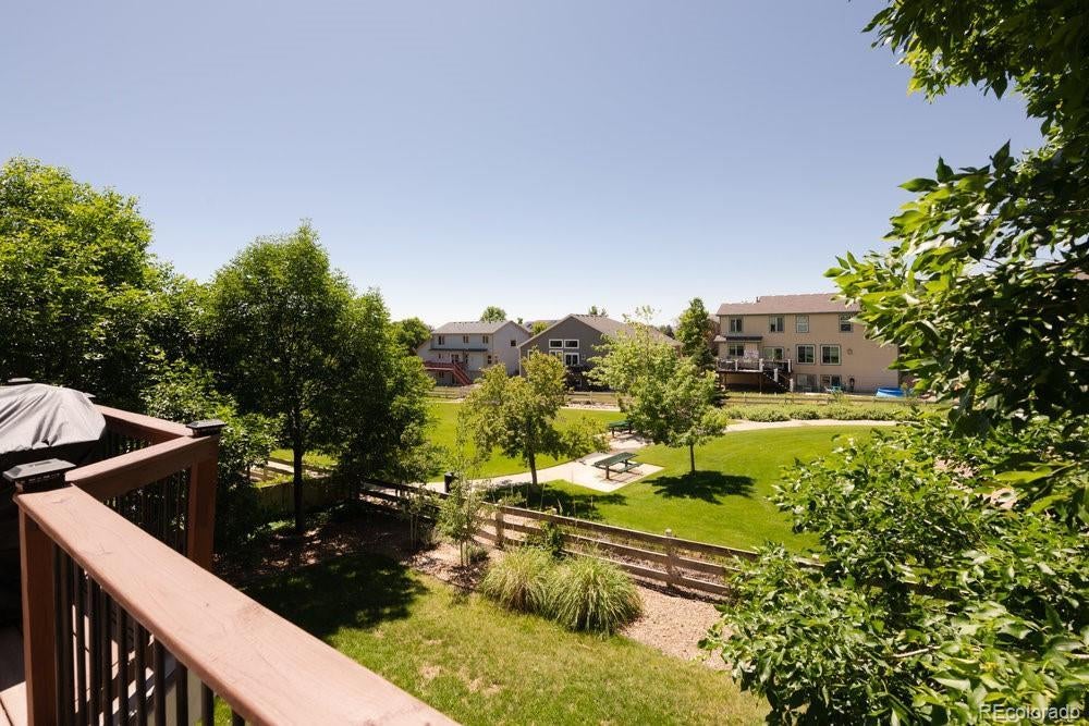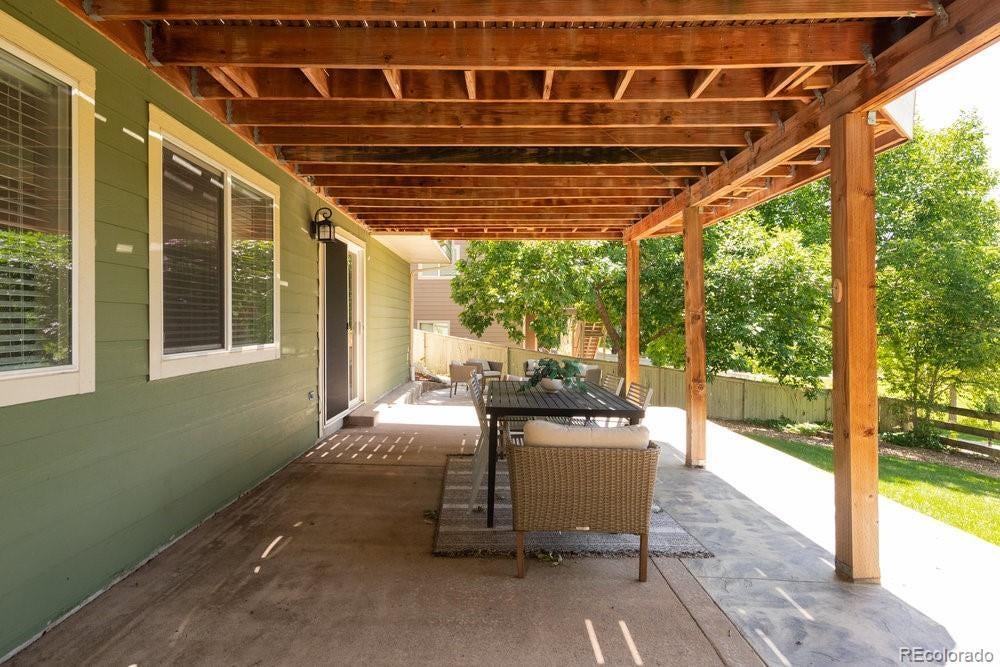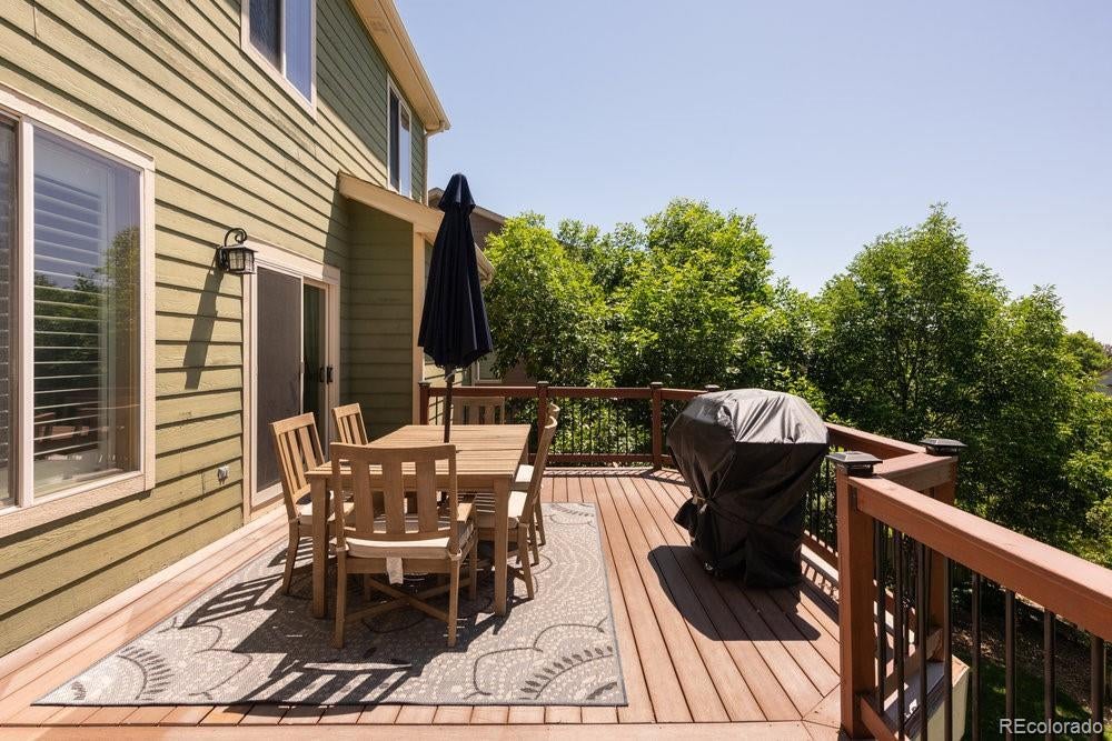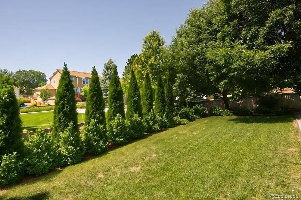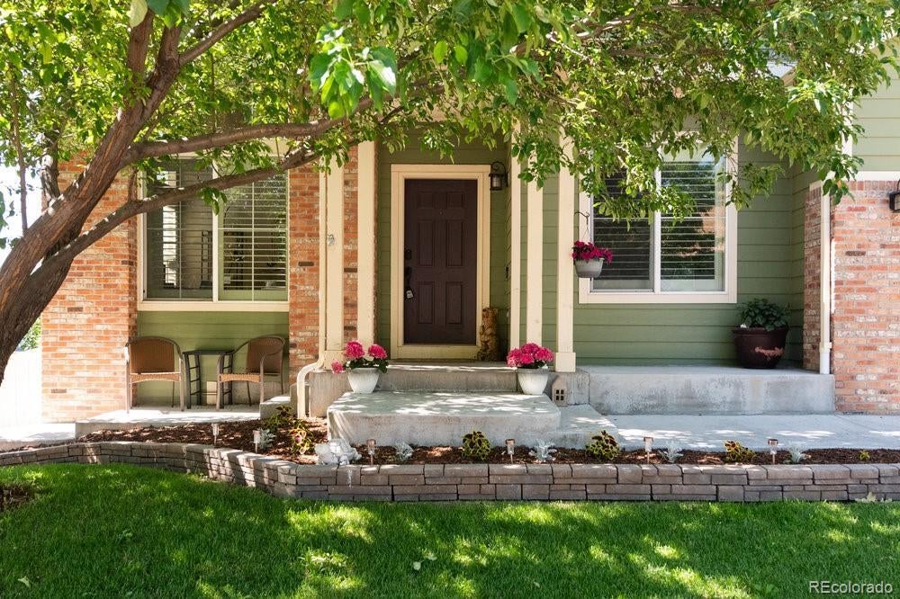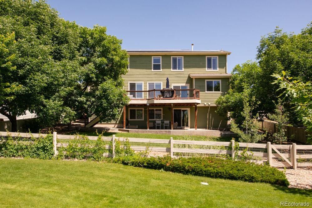 $7,000 Lender Credit available! You will not find a better deal on a home of this quality and size in a quiet tucked-away neighborhood bordering trails + open space! A few notable features include owned solar panels, a fully finished walk-out basement, a 3-car tandem garage and tens of thousands of dollars worth of professional landscaping + patio work. The open-concept floor plan has a seamless flow between the kitchen, dining, and living areas, all enhanced by vaulted ceilings that make the space feel bright and airy. Enjoy quality craftsmanship throughout, including real hardwood floors, plantation shutters, and a cozy gas fireplace. The updated kitchen features a large island and ample storage—perfect for cooking and entertaining. Upstairs, the spacious primary suite includes a walk-in closet and 5-piece bath with double vanities, a soaking tub, and a walk-in shower. Two additional bedrooms and a flex space (ideal as an office, playroom, gym, or potential 5th bedroom) complete the upper level. The walk-out basement gets great natural light and offers seamless indoor/outdoor access. With a bedroom + bathroom, it’s an ideal space for hosting guests. The oversized 3-car garage includes tandem parking for additional space. The OWNED energy-efficient solar panels offer added savings and sustainability. Step outside to enjoy the large south-facing raised deck, a newer custom concrete patio with a gas fire pit, and a beautifully landscaped backyard with mature trees and blooming perennials. Additional privacy could be achieved with landscaping (see mock-up in photos). The green space just beyond the backyard with walking trails is very quiet and is used by the few neighbors that border it. This location offers a peaceful neighborhood setting while being just minutes from all the amenities you’d need including: Lambertson Lakes Open Space, the new Explore Elementary PK-8, Rec Center, light rail, Denver Premium Outlets, and Orchard Town Center.