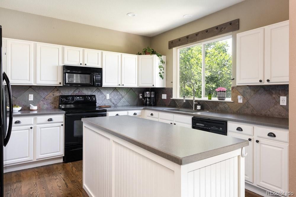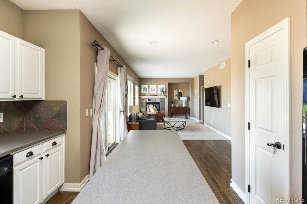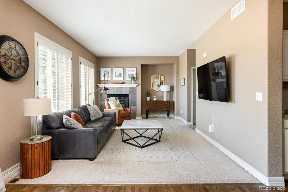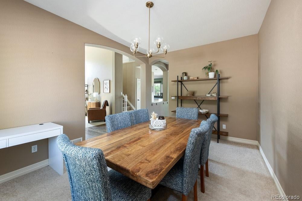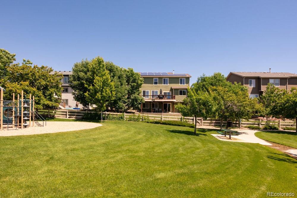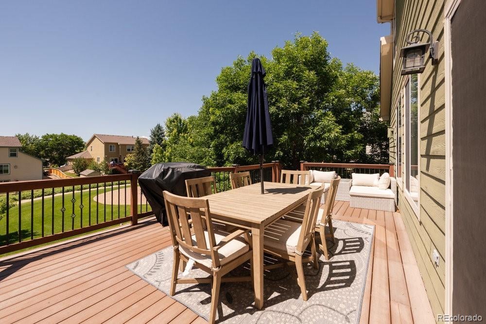 $7,000 Lender Credit available! You will not find a better deal on a home of this quality and size in a quiet tucked-away neighborhood bordering trails + open space! A few notable features include owned solar panels, a fully finished walk-out basement, a 3-car tandem garage and tens of thousands of dollars worth of professional landscaping + patio work. The open-concept floor plan has a seamless flow between the kitchen, dining, and living areas, all enhanced by vaulted ceilings that make the space feel bright and airy. Enjoy quality craftsmanship throughout, including real hardwood floors, plantation shutters, and a cozy gas fireplace. The updated kitchen features a large island and ample storage—perfect for cooking and entertaining. Upstairs, the spacious primary suite includes a walk-in closet and 5-piece bath with double vanities, a soaking tub, and a walk-in shower. Two additional bedrooms and a flex space (ideal as an office, playroom, gym, or potential 5th bedroom) complete the upper level. The walk-out basement gets great natural light and offers seamless indoor/outdoor access. With a bedroom + bathroom, it’s an ideal space for hosting guests. The oversized 3-car garage includes tandem parking for additional space. The OWNED energy-efficient solar panels offer added savings and sustainability. Step outside to enjoy the large south-facing raised deck, a newer custom concrete patio with a gas fire pit, and a beautifully landscaped backyard with mature trees and blooming perennials. Additional privacy could be achieved with landscaping (see mock-up in photos). The green space just beyond the backyard with walking trails is very quiet and is used by the few neighbors that border it. This location offers a peaceful neighborhood setting while being just minutes from all the amenities you’d need including: Lambertson Lakes Open Space, the new Explore Elementary PK-8, Rec Center, light rail, Denver Premium Outlets, and Orchard Town Center.