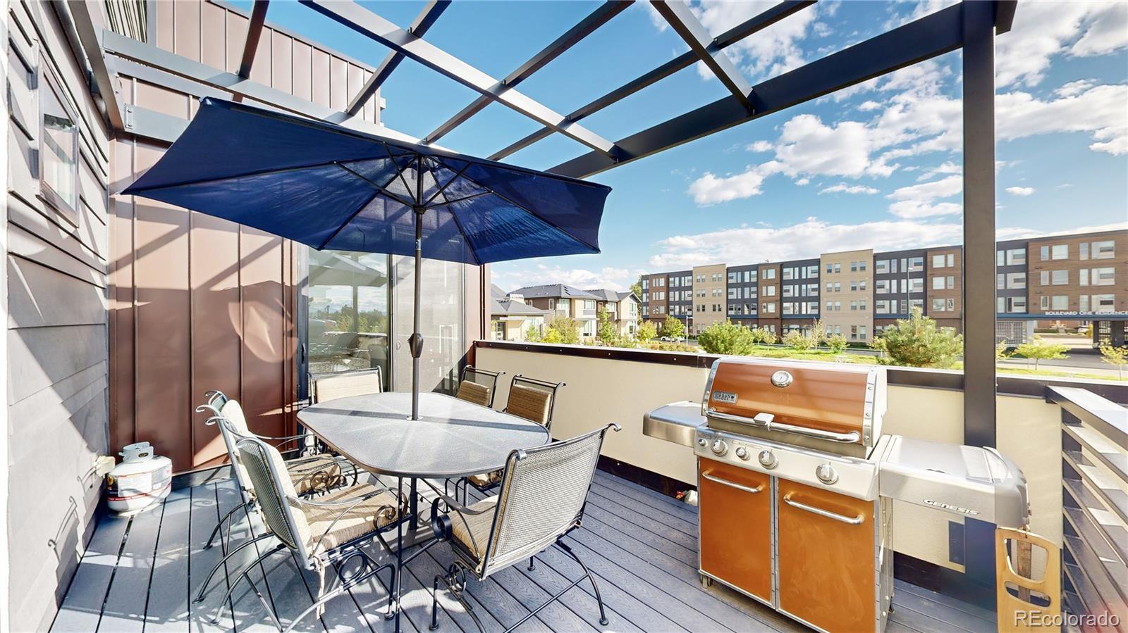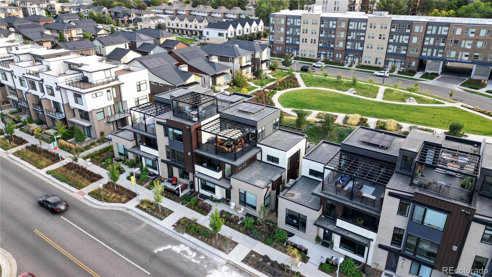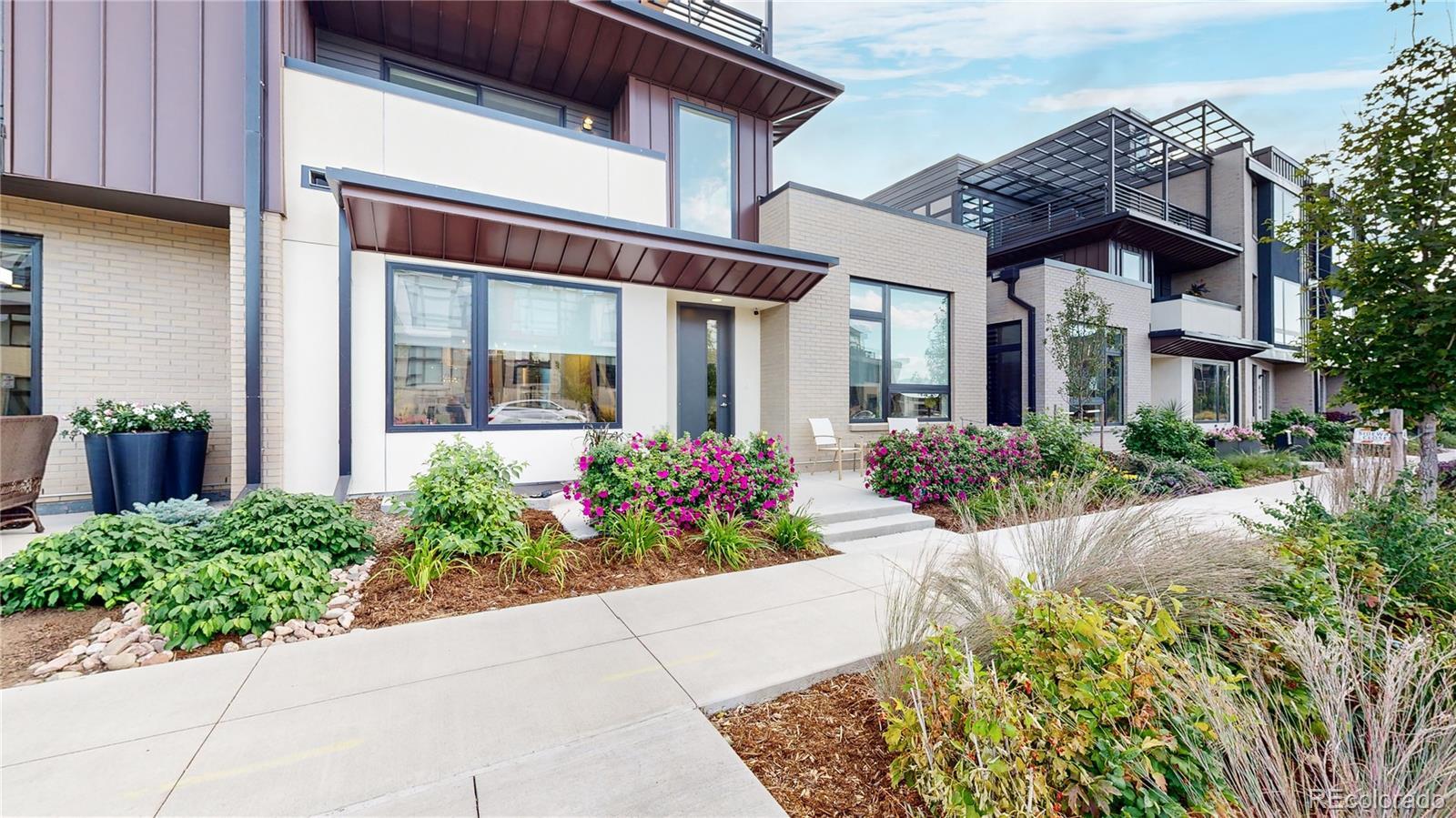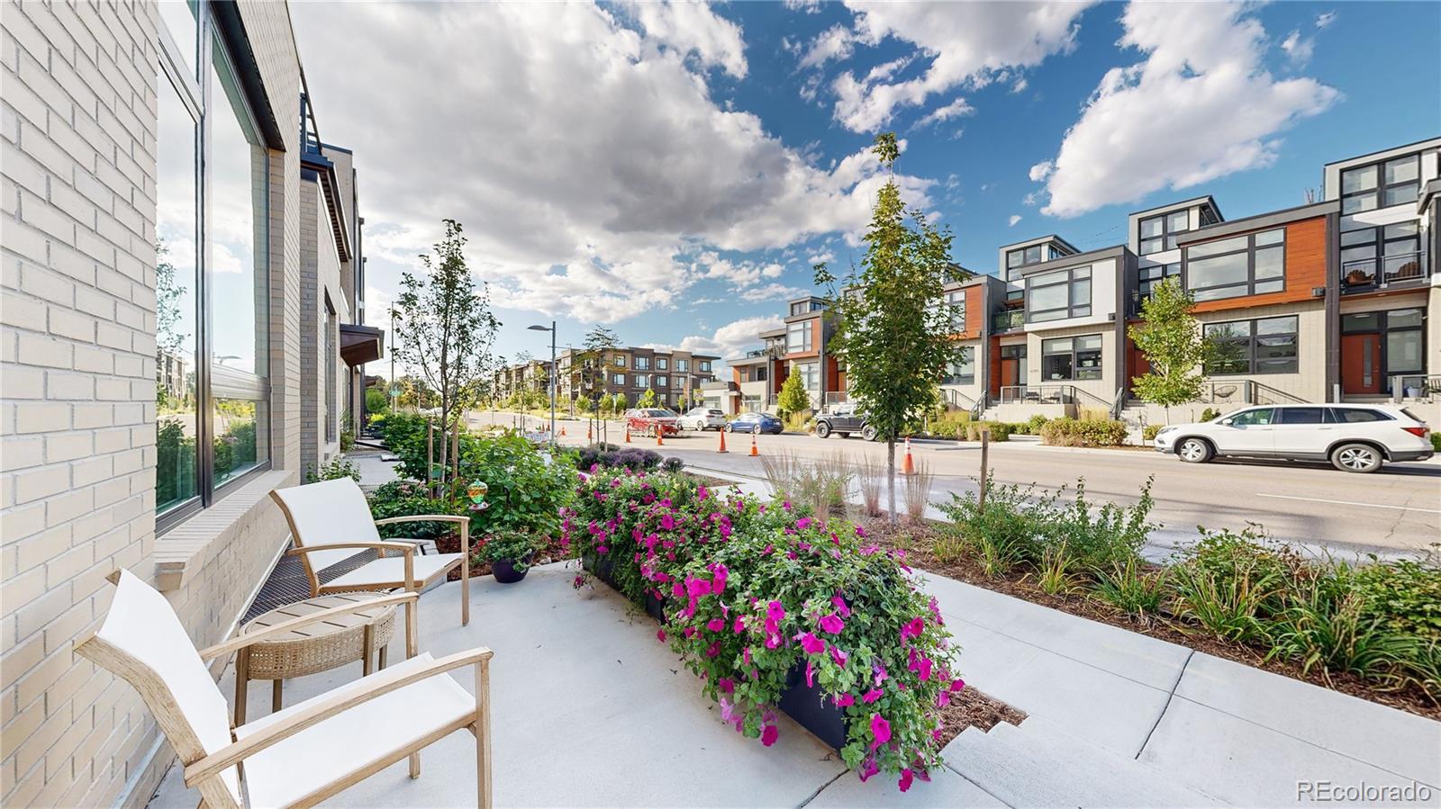 Welcome to this stunning end-unit townhome in Lowry’s coveted Boulevard One with main-floor primary suite. Just four years old, this contemporary home offers a rare blend of modern design, high-end finishes and thoughtful upgrades—plus a fully finished basement. The open main level showcases hardwood floors, soaring 12’ ceilings and a cozy gas fireplace. A chef’s kitchen features stainless steel appliances, a 6-burner gas cooktop, quartz countertops and an oversized island. The desirable main-floor primary suite boasts a spa-like bath and spacious walk-in closet. A powder room and laundry complete the level. Upstairs you’ll find two additional bedrooms with two baths (1 en-suite), a flexible loft space plus balconies at both the front and back of the home. The top level offers a dramatic open loft with a two-sided indoor/outdoor fireplace and a 320 sq ft rooftop deck—west- and north-facing views, plumbed for natural gas and perfect for entertaining. The fully finished basement includes a large family room, fourth bedroom and 3/4 bath. A two-car garage with two EV chargers and an owned solar system add convenience and efficiency. Backing to a peaceful neighborhood park, this home is just steps from shops, restaurants, groceries, library, parks and public transit. Truly a turnkey opportunity in one of Denver’s most walkable neighborhoods.